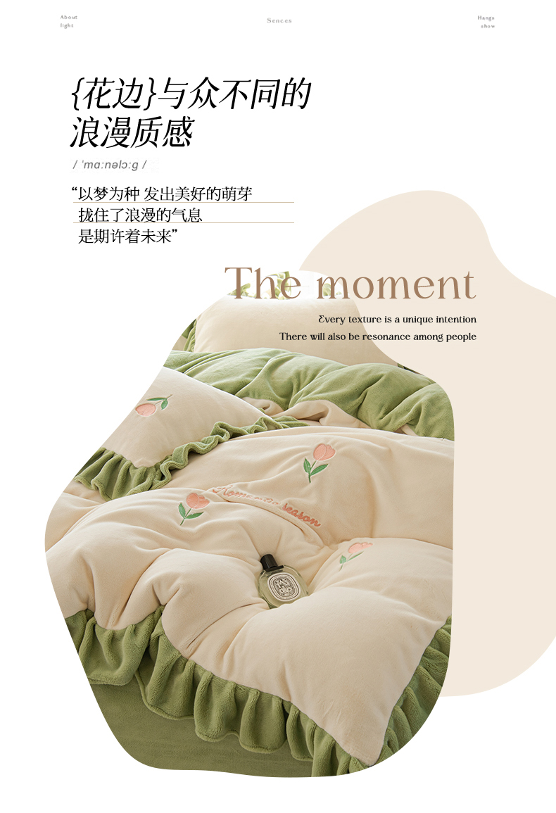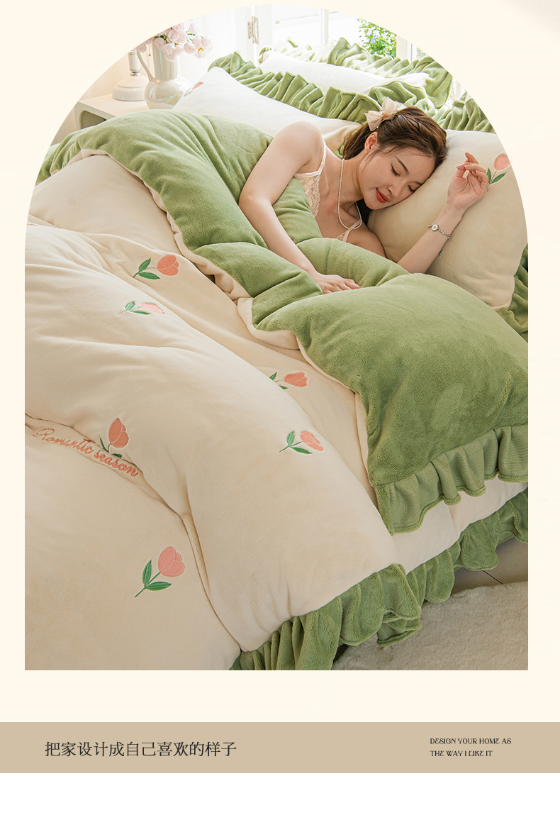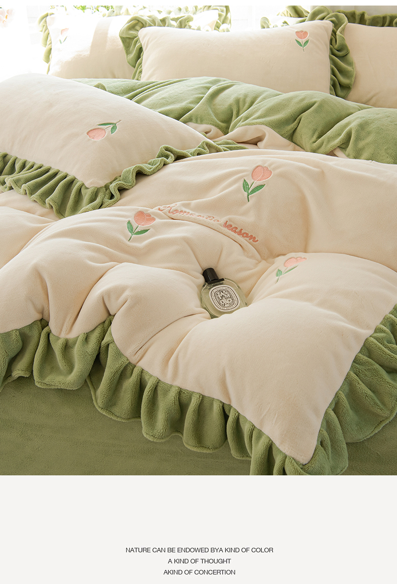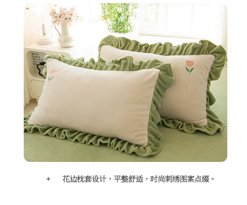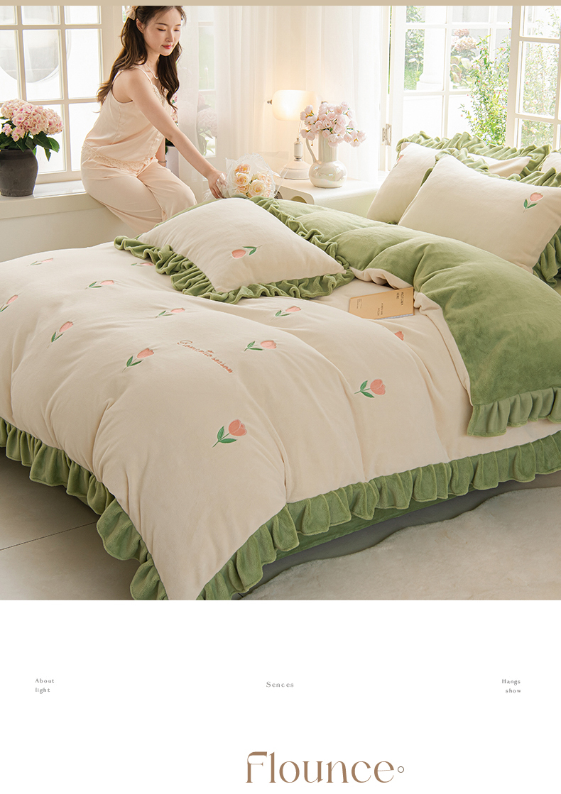 当前位置: 91家纺网 > 商品网购 > 床品套件 > 四件套 > 牛奶绒四件套 > 笙意家纺 2025新款牛奶绒花边郁金香花卉樱桃刺绣四件套 郁金香-奶昔白+月牙绿