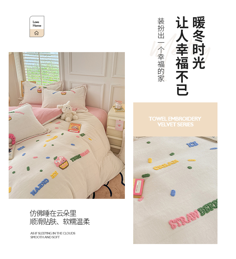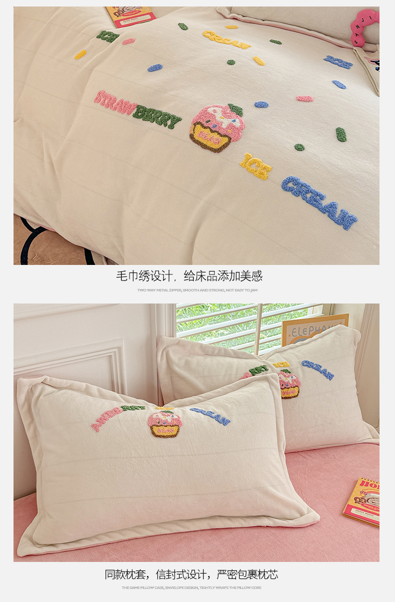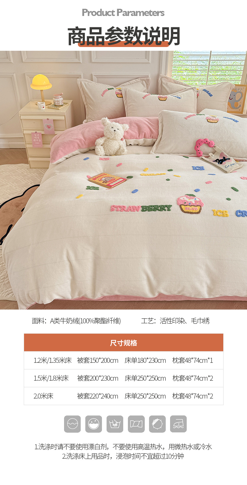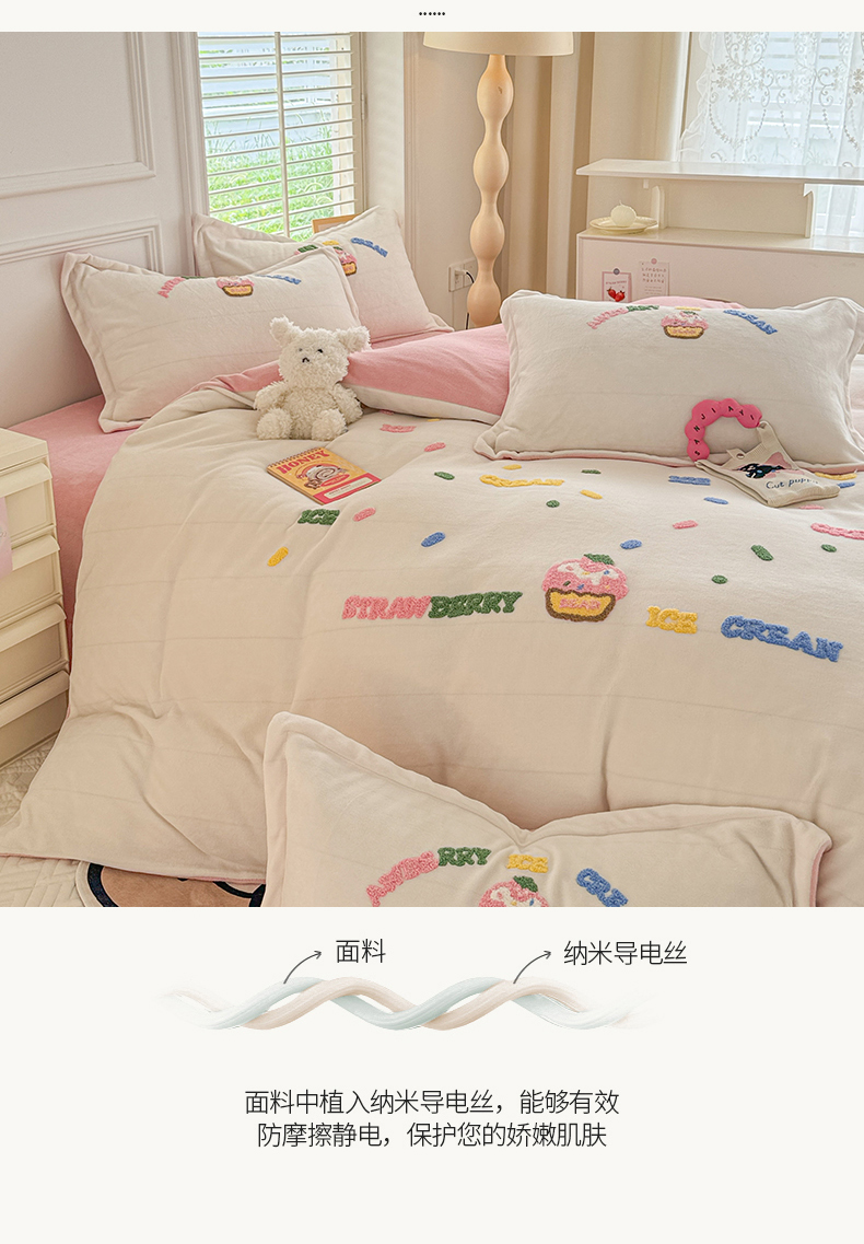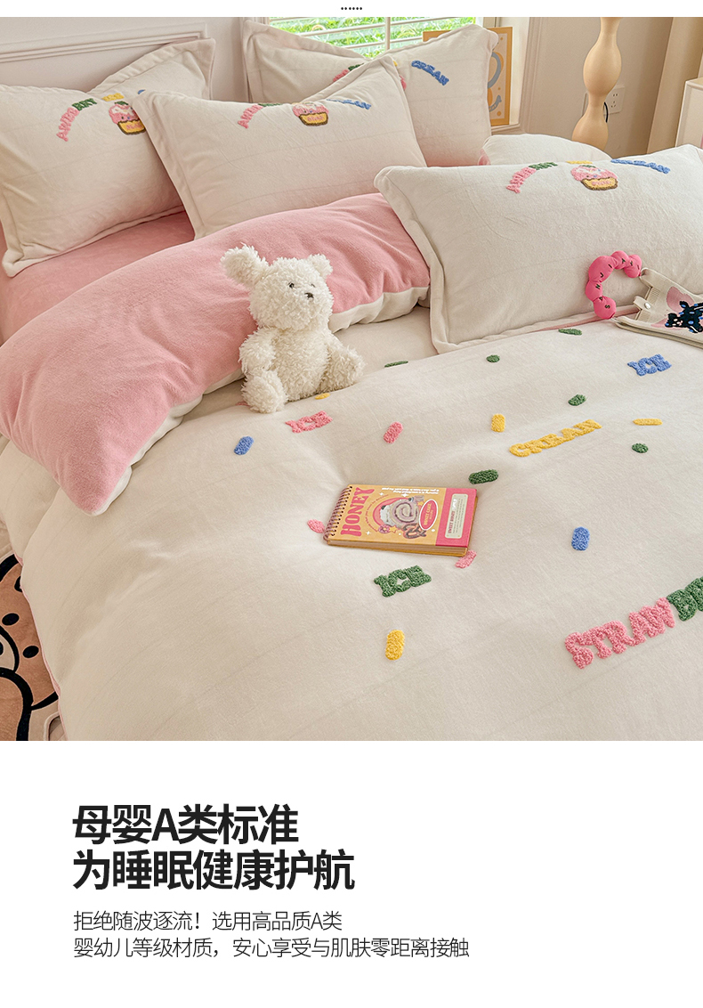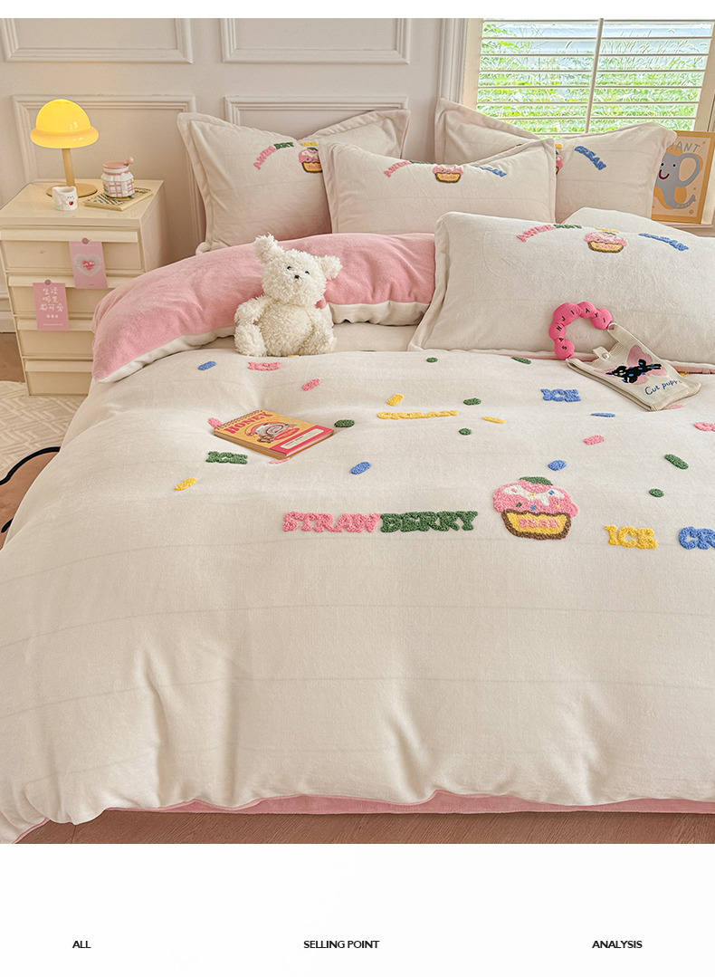 商品名称:芯贝儿 2024新款简约小清新加厚保暖牛奶绒毛巾绣花宝宝绒雕花绒法莱绒四件套 草莓蛋糕-奶玉
