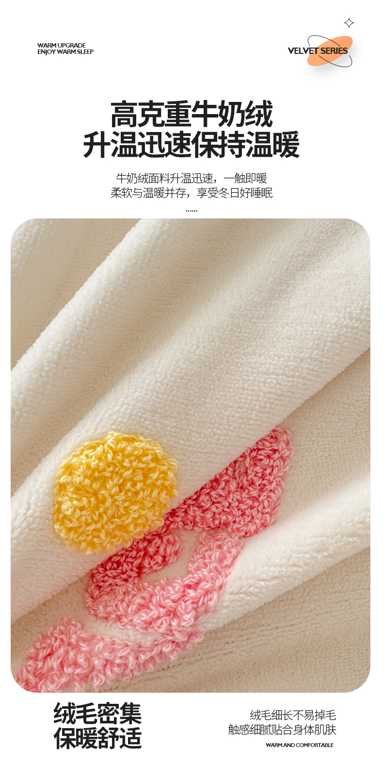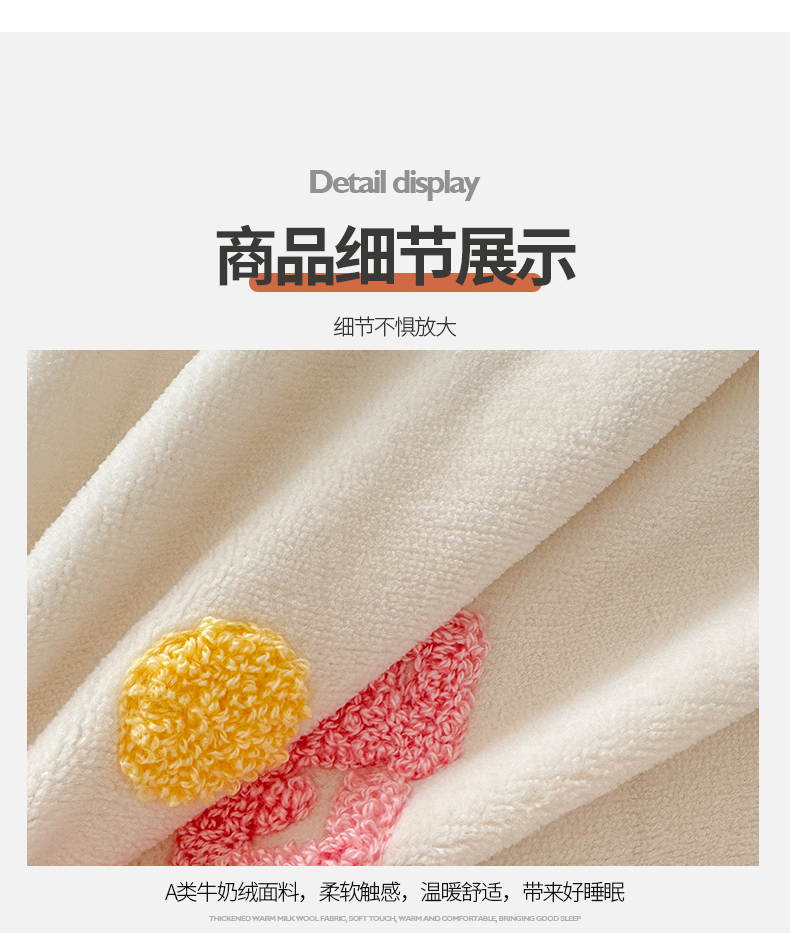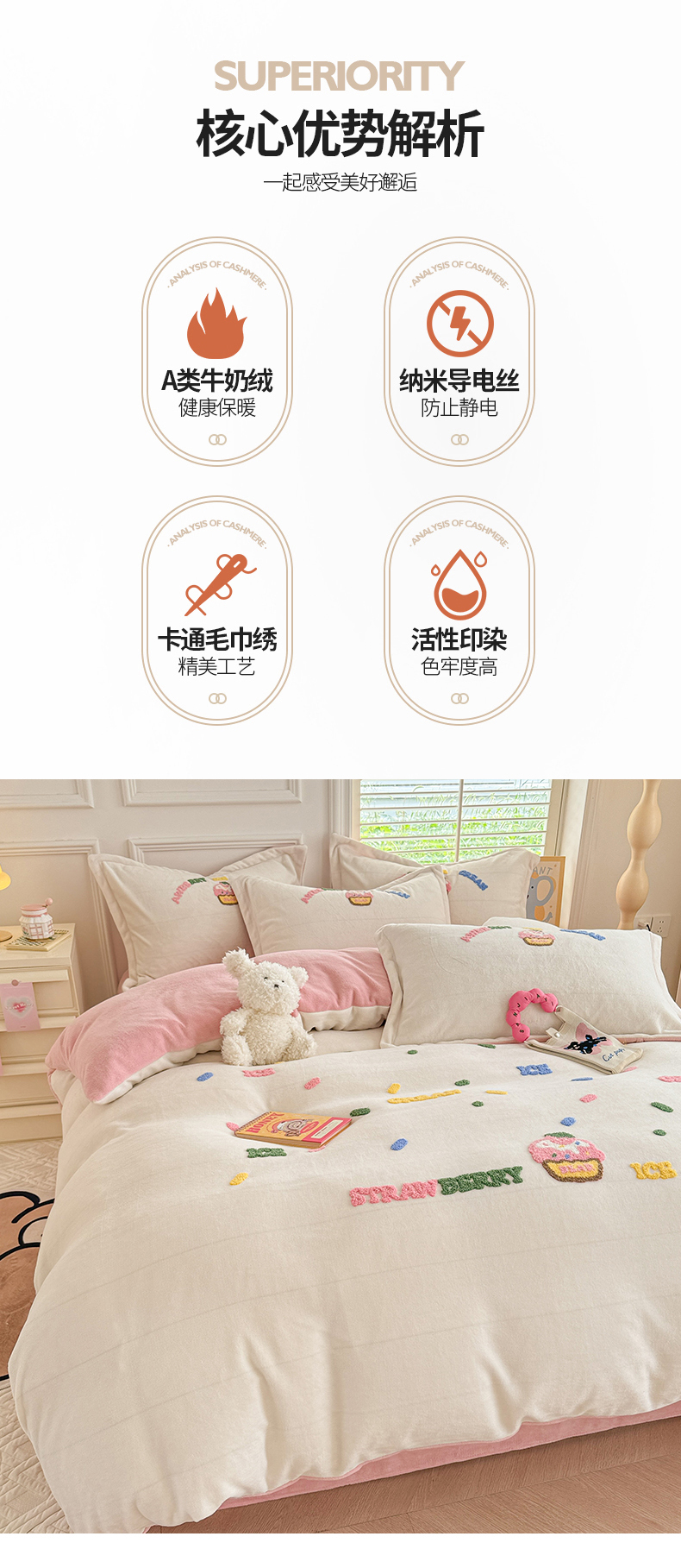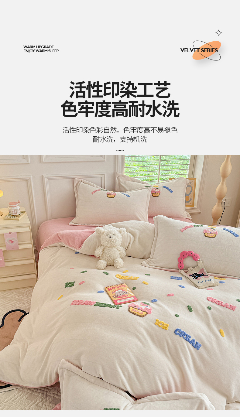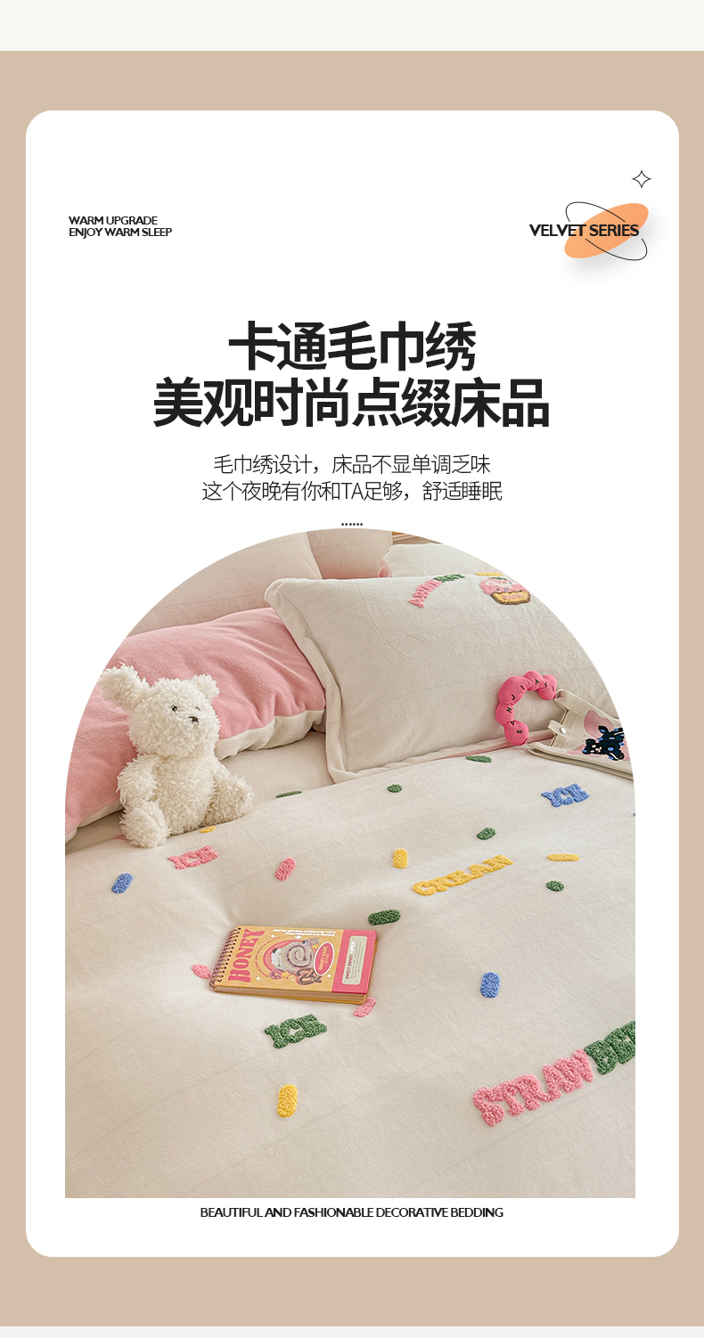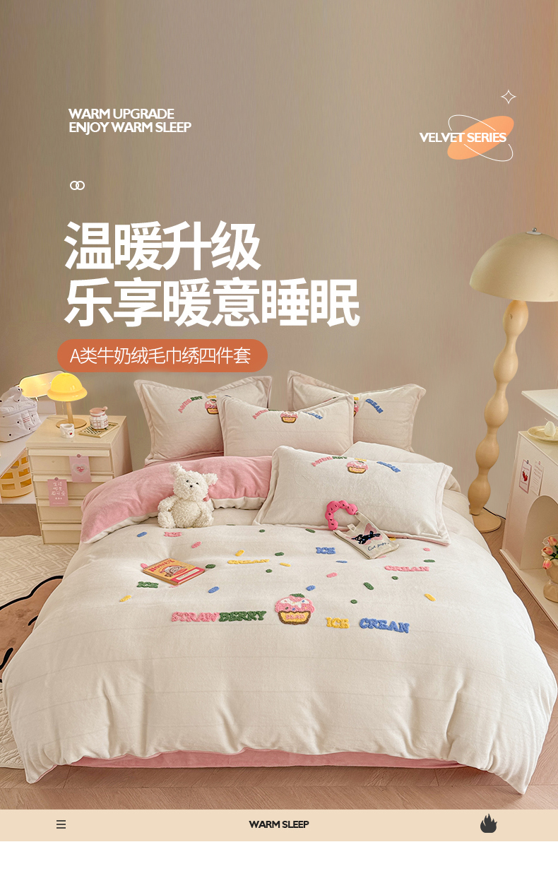 商品名称:芯贝儿 2024新款简约小清新加厚保暖牛奶绒毛巾绣花宝宝绒雕花绒法莱绒四件套 草莓蛋糕-奶玉