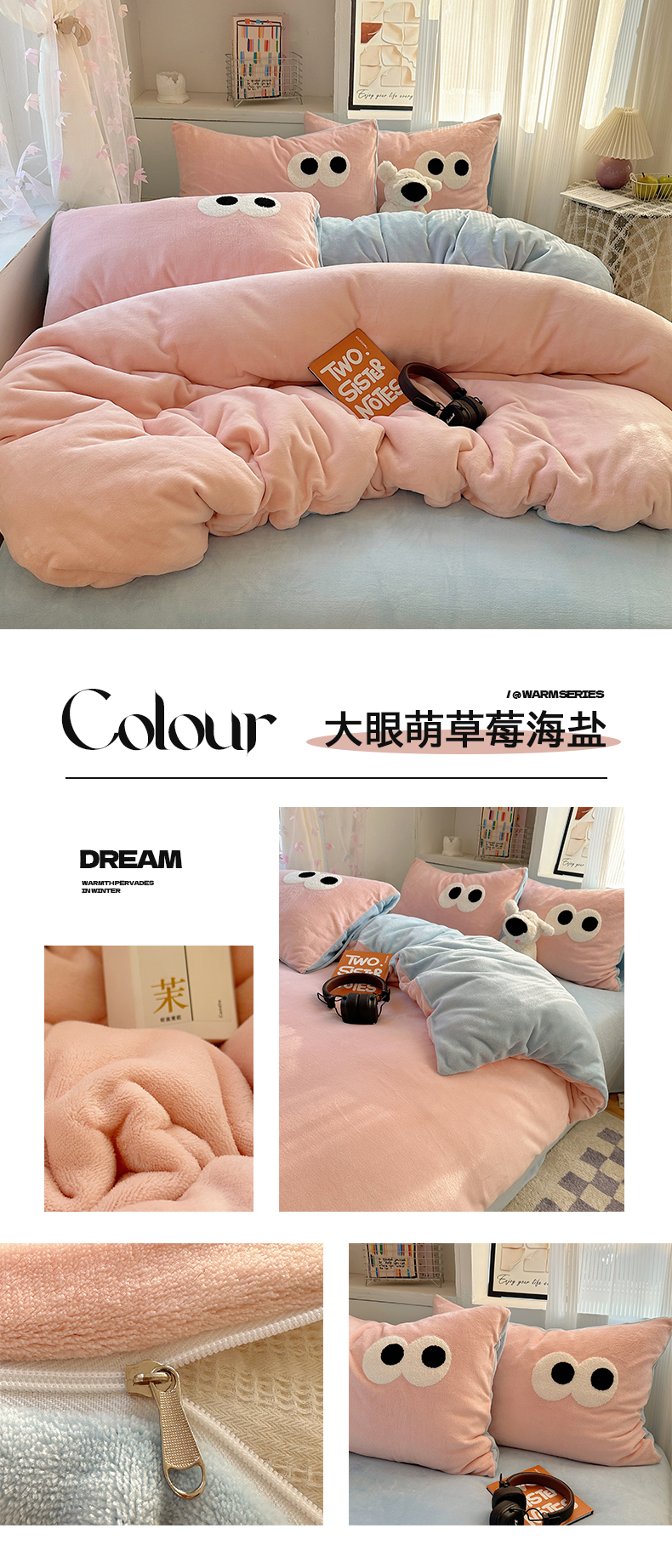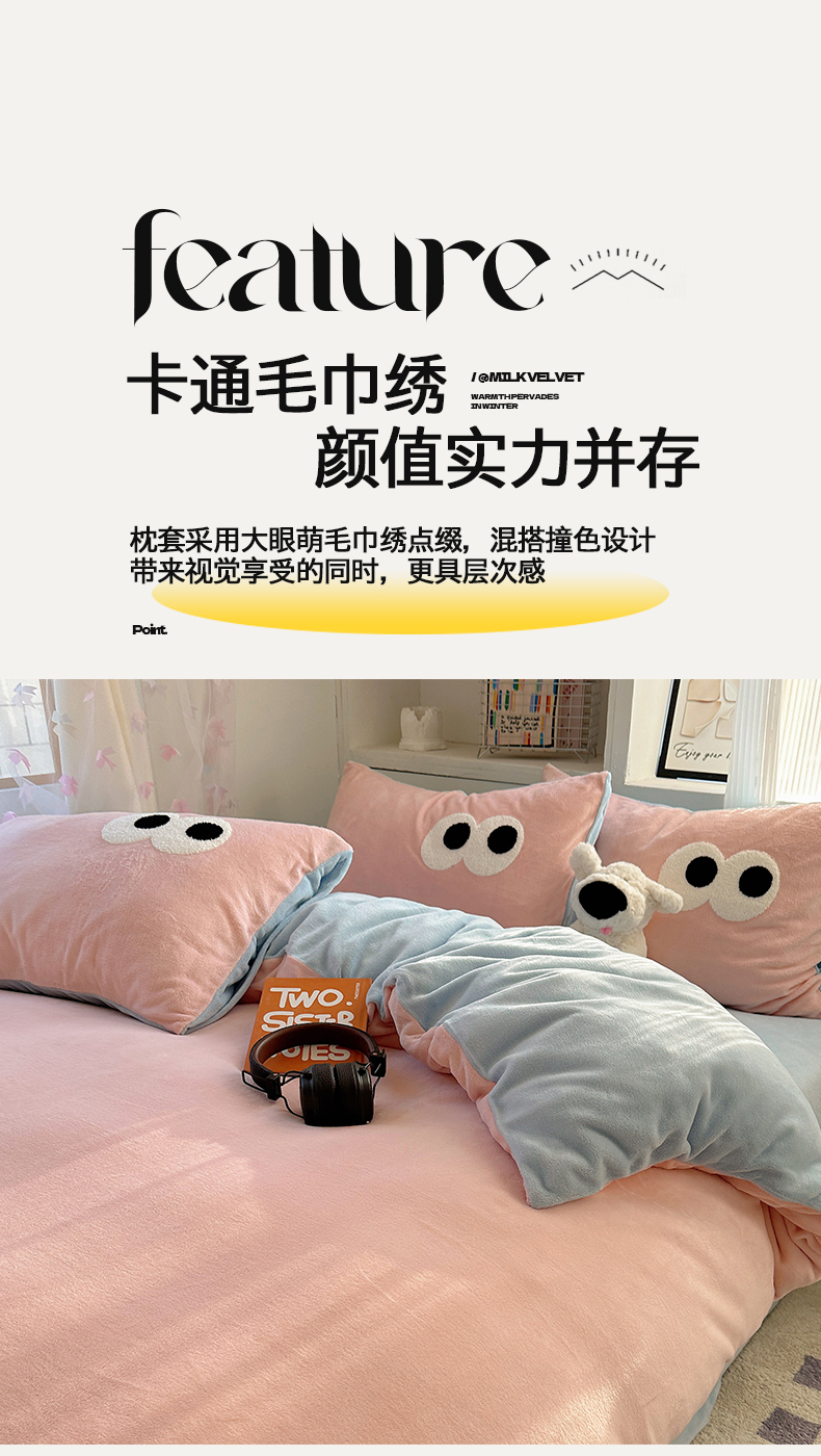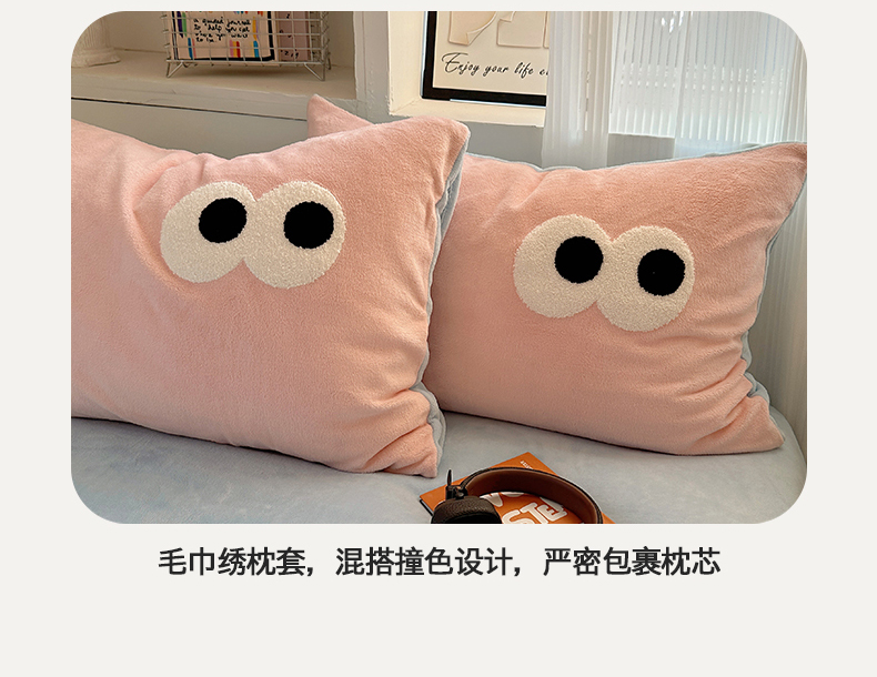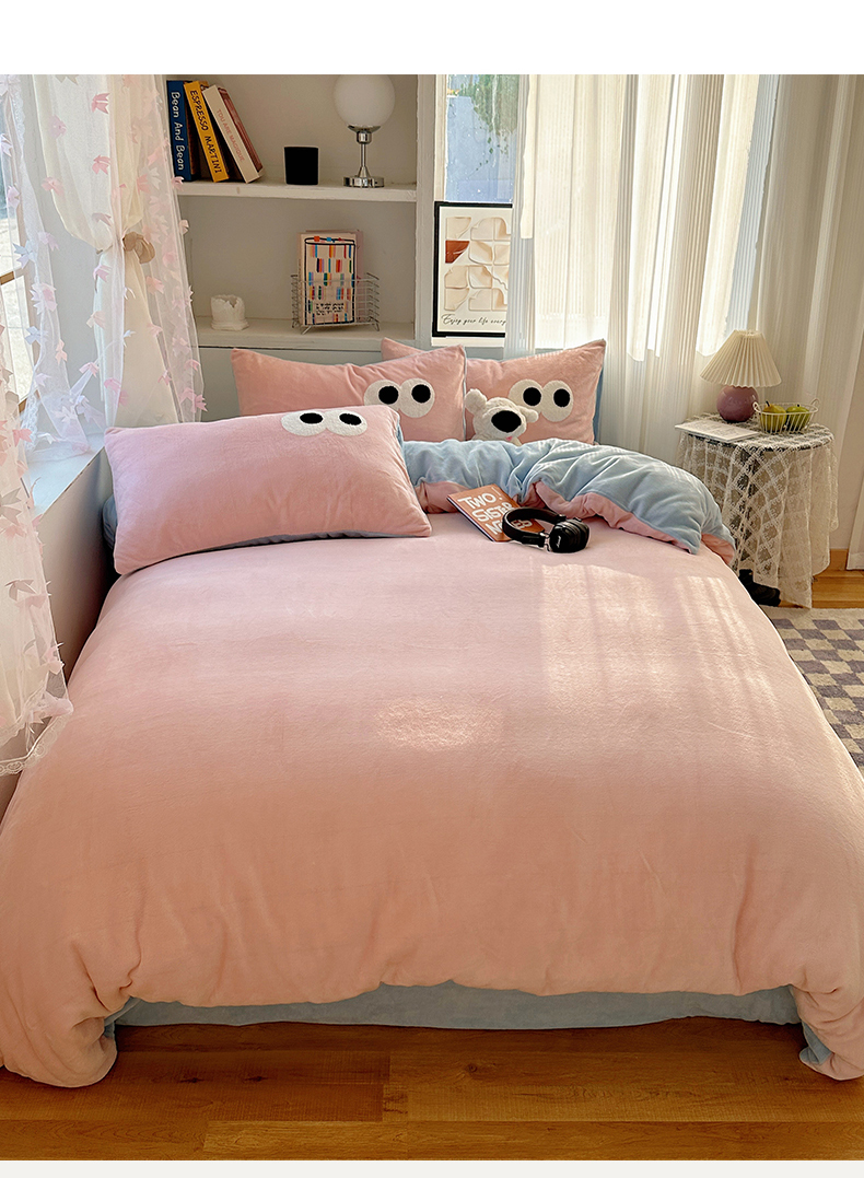 当前位置: 91家纺网 > 商品网购 > 床品套件 > 四件套 > 牛奶绒四件套 > 桃子家居 2024新款A类ins加厚毛巾绣大眼萌混搭撞色牛奶绒系列四件套 绒毛巾绣-大眼萌草莓海盐
