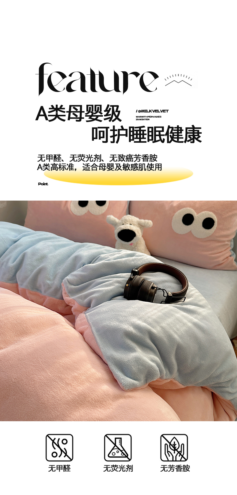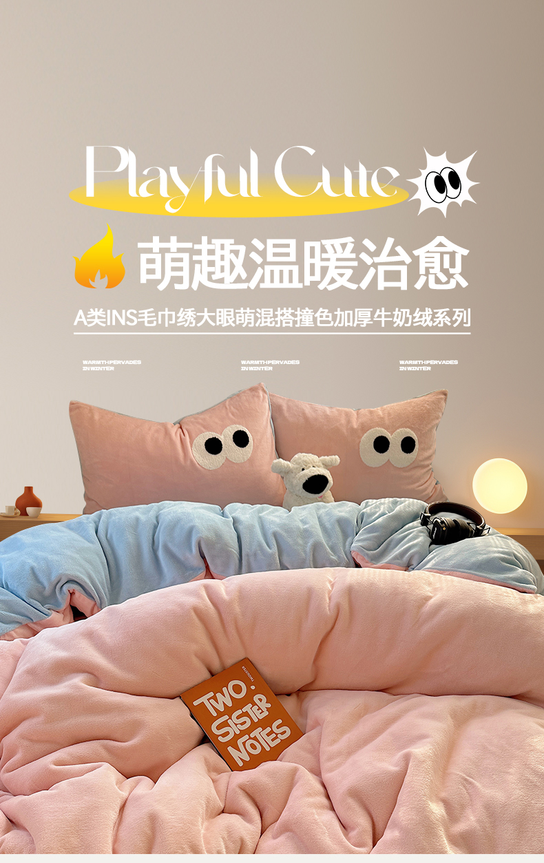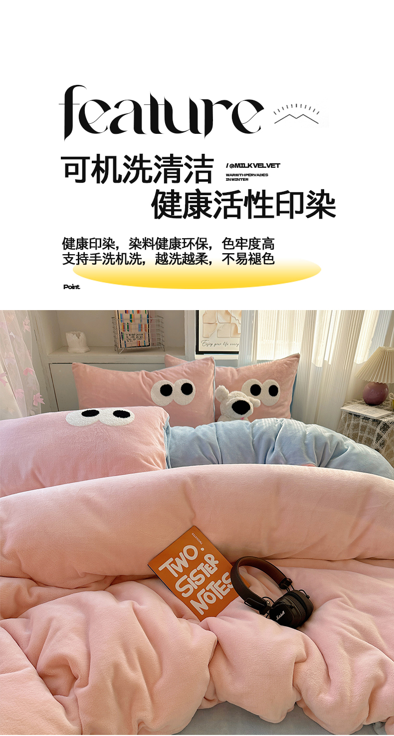当前位置: 91家纺网 > 商品网购 > 床品套件 > 四件套 > 牛奶绒四件套 > 桃子家居 2024新款A类ins加厚毛巾绣大眼萌混搭撞色牛奶绒系列四件套 绒毛巾绣-大眼萌草莓海盐