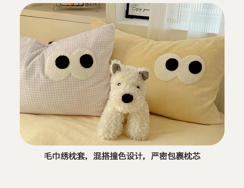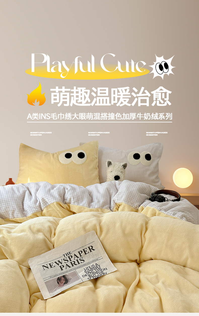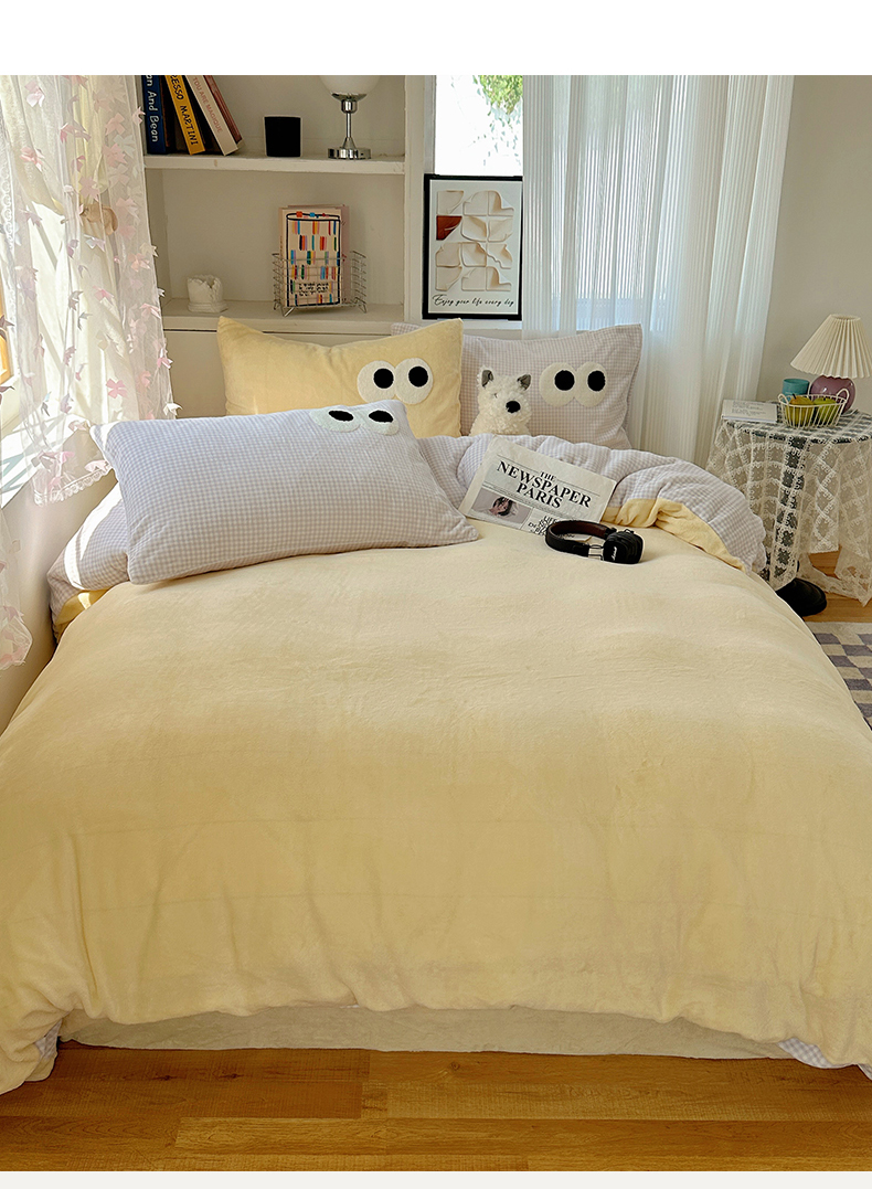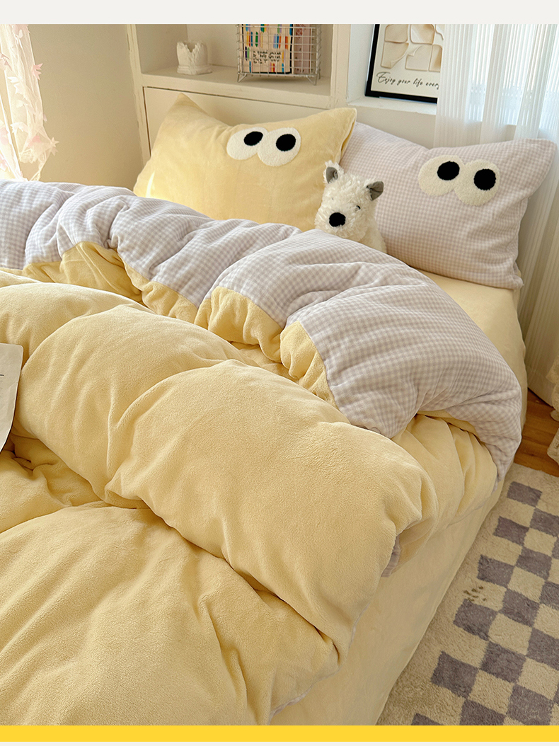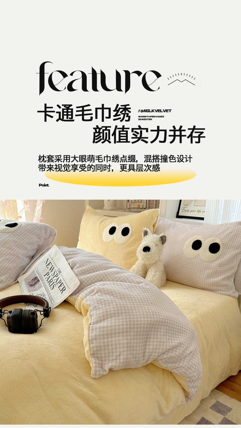 当前位置: 91家纺网 > 商品网购 > 床品套件 > 四件套 > 牛奶绒四件套 > 桃子家居 2024新款A类ins加厚毛巾绣大眼萌混搭撞色牛奶绒系列四件套 绒毛巾绣-大眼萌蓝格黄黄2