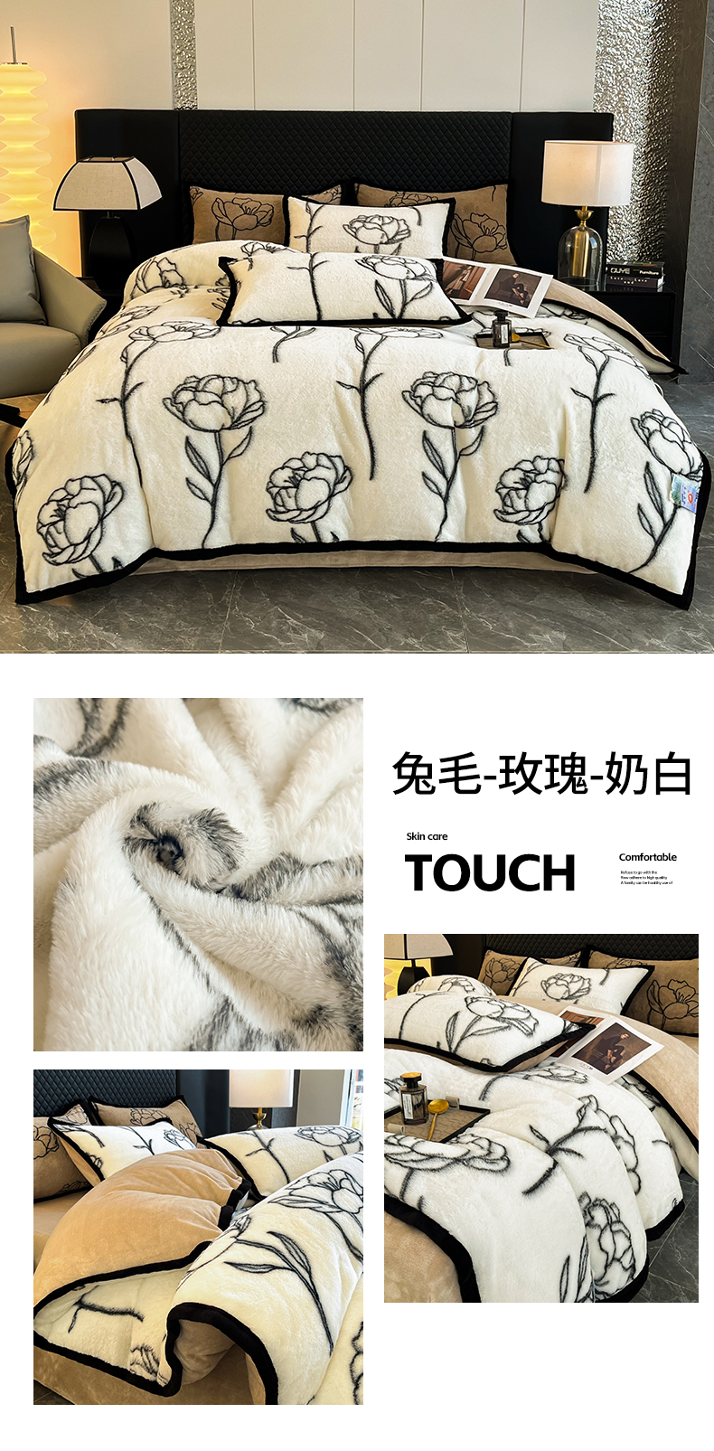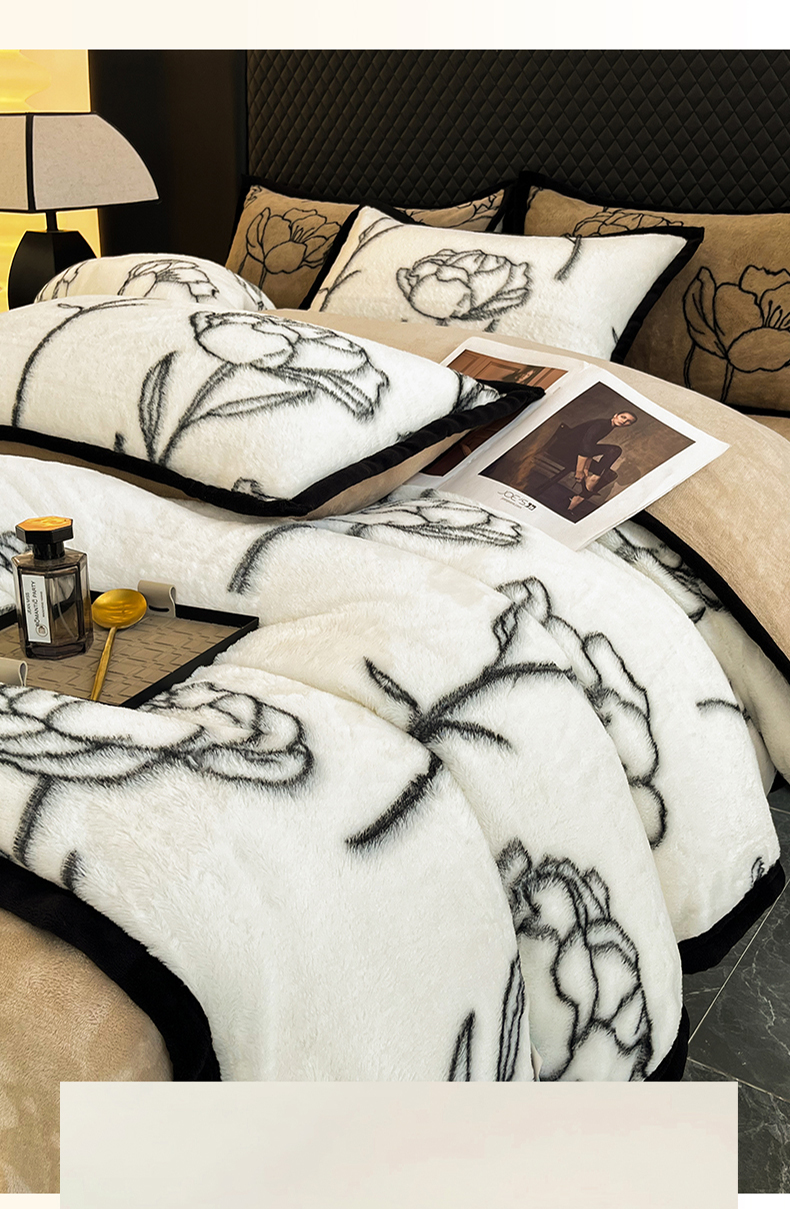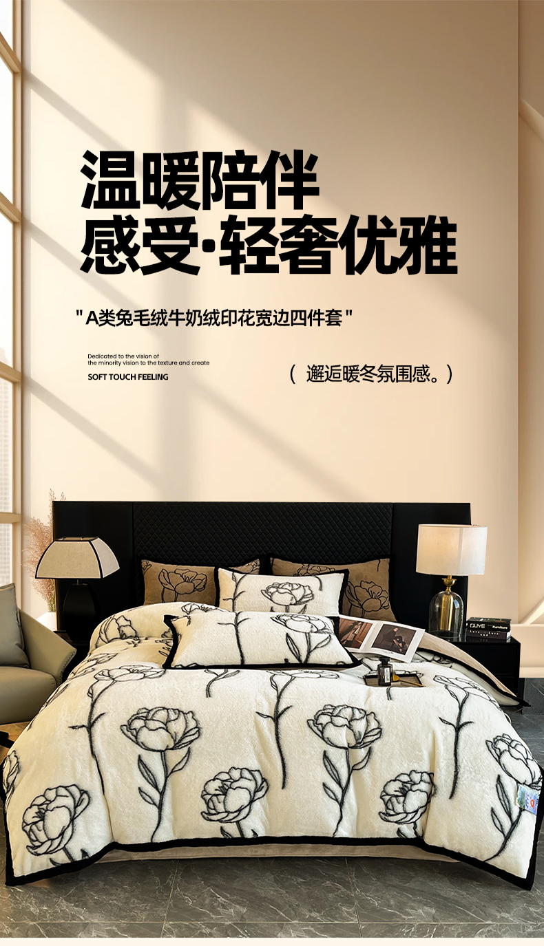 商品名称:慕尚家纺 2025新款宽包边高克重兔兔绒牛奶绒加厚保暖法式系列四件套 兔毛-玫瑰-奶白