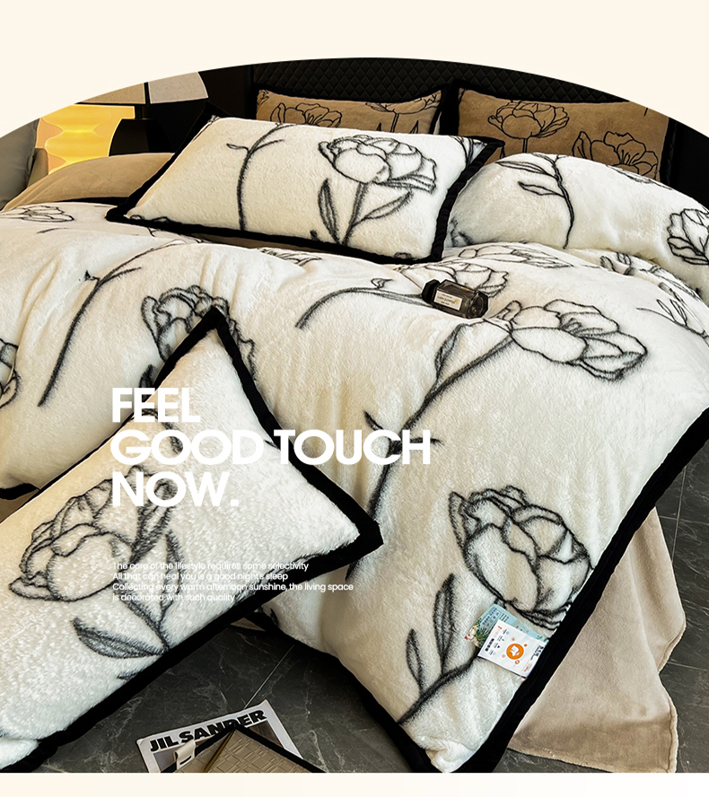 慕尚家纺 2025新款宽包边高克重兔兔绒牛奶绒加厚保暖法式系列四件套 兔毛-玫瑰-奶白