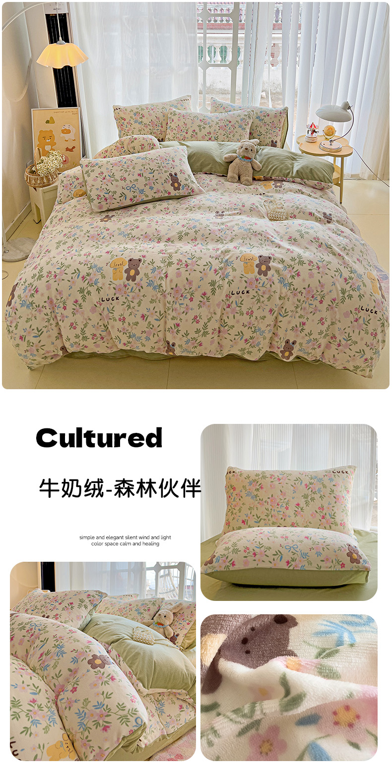 金梦拉家纺 2024年秋冬新款加厚保暖绒牛奶绒印花四件套 牛奶绒-森林伙伴