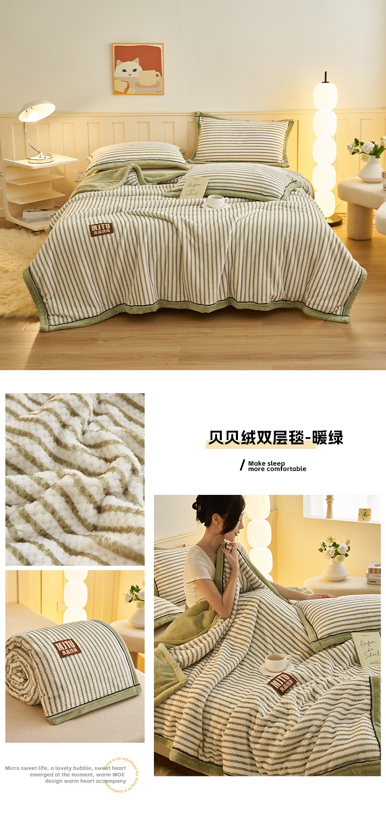 晨曦家纺 2024新款贝贝绒牛奶绒双层毛毯两用被套毯 贝贝绒双层毯-暖绿