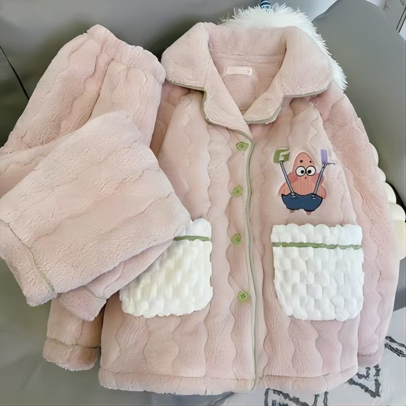 (总)洛兰沙家居馆 2024新款清新睡衣女秋冬三层夹棉珊瑚绒加厚保暖两件套女士可外穿加绒家居服,粉色,灰色,白色,玉色