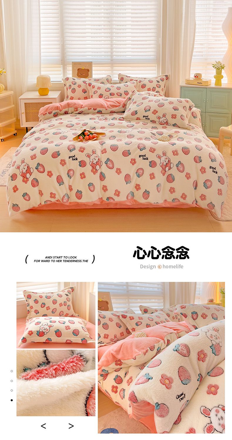 韩巢家纺 2025新款高克重印花牛奶绒床品四件套 爱心小樱桃,爱心小樱桃