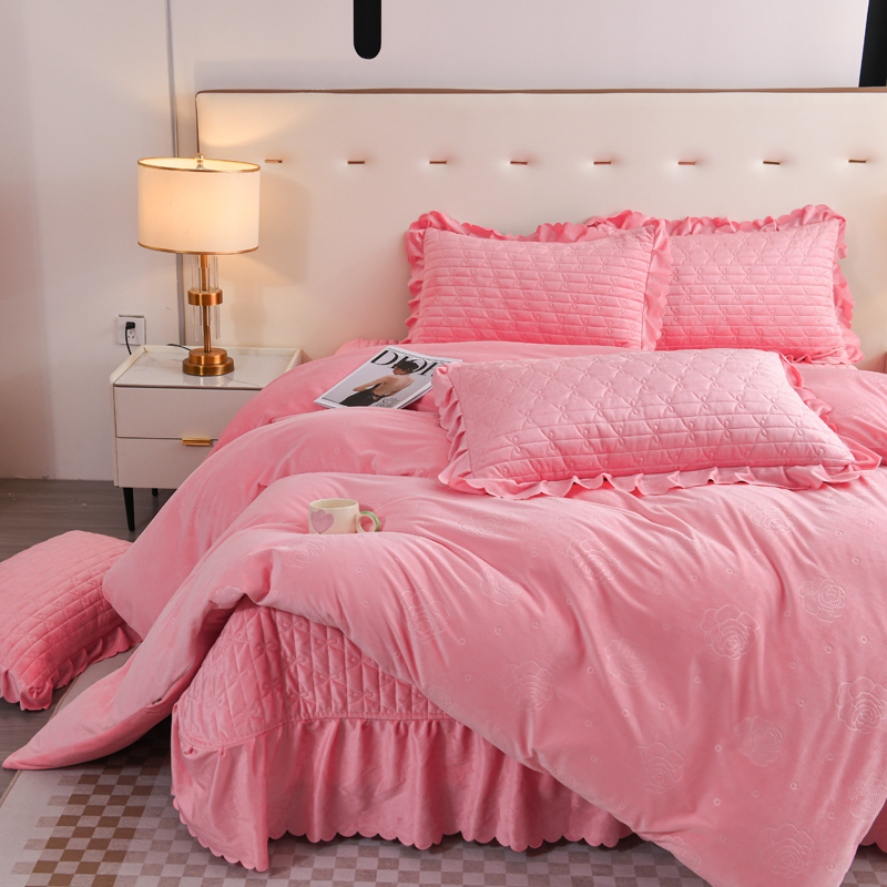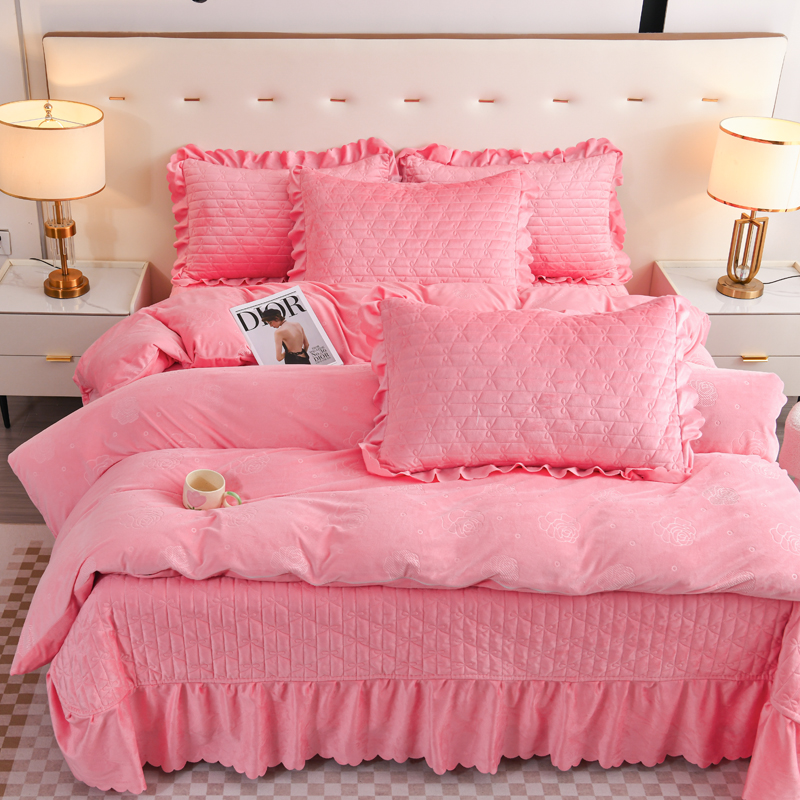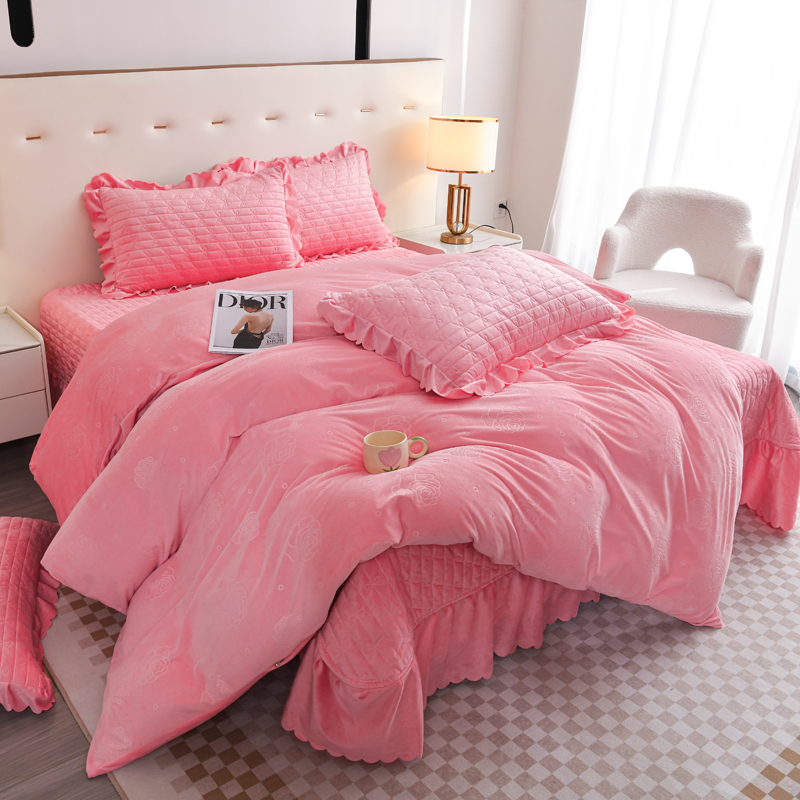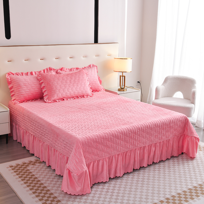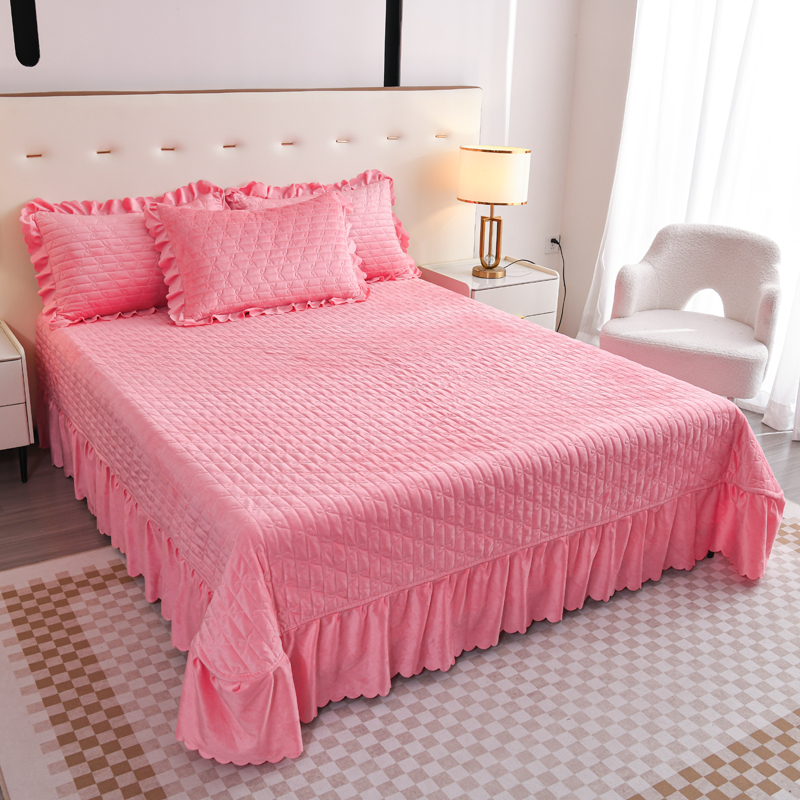 雅眠居 直播爆款纯色宝宝绒床盖款四件套花边夹棉床裙款三件套 宝宝绒-粉色