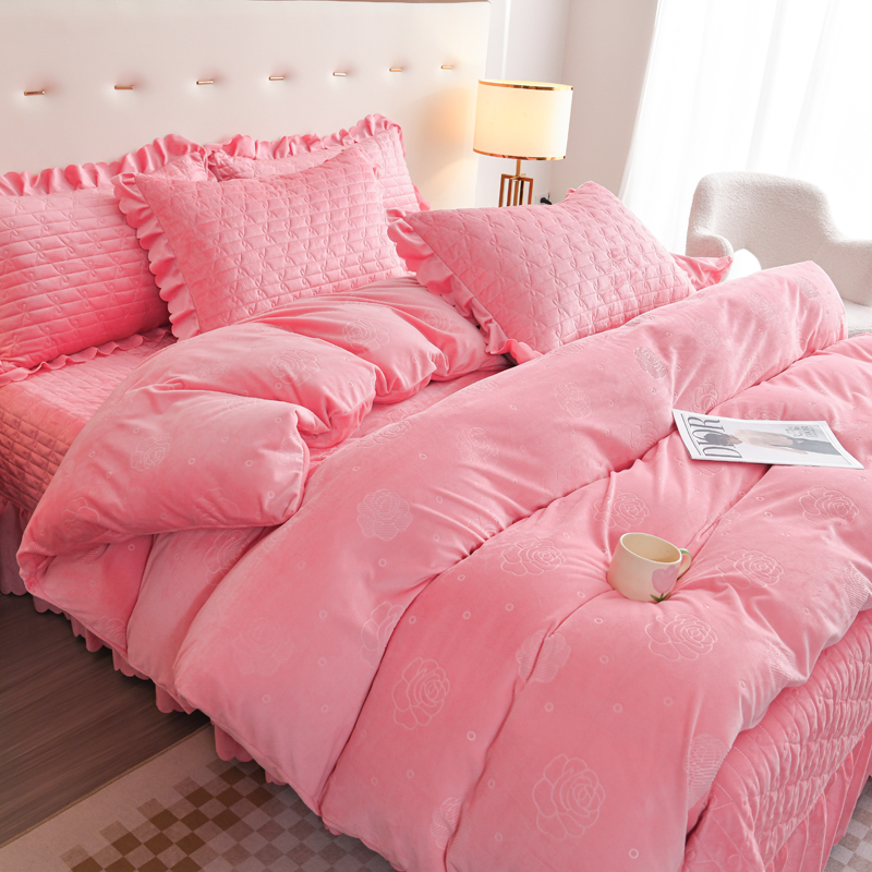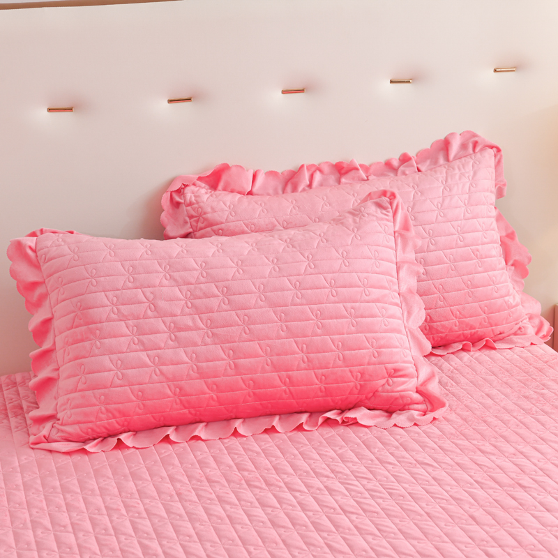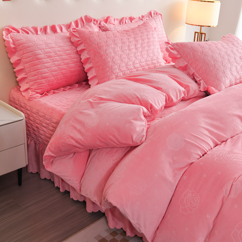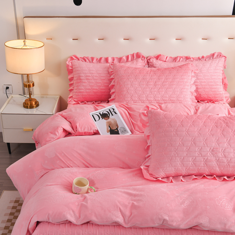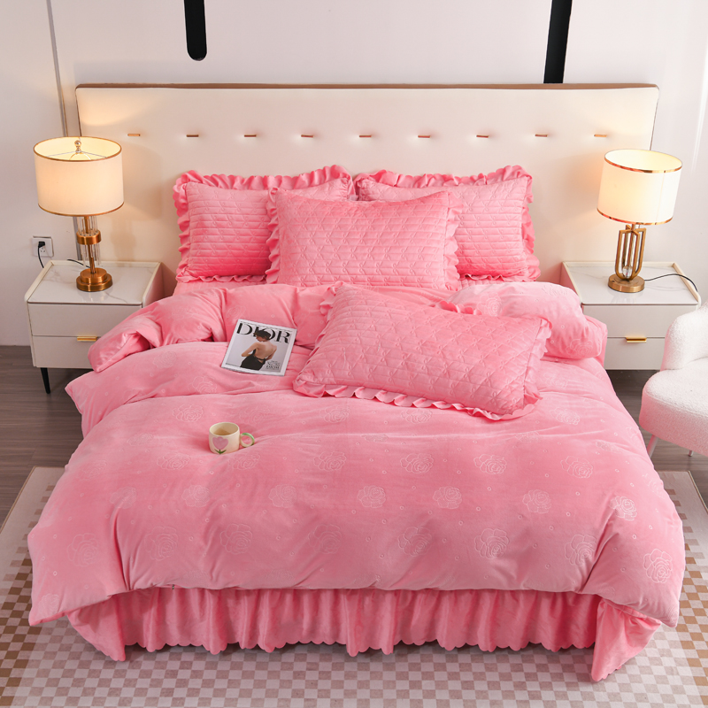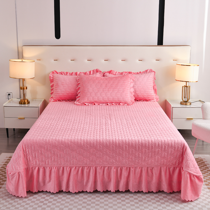雅眠居 直播爆款纯色宝宝绒床盖款四件套花边夹棉床裙款三件套 宝宝绒-粉色