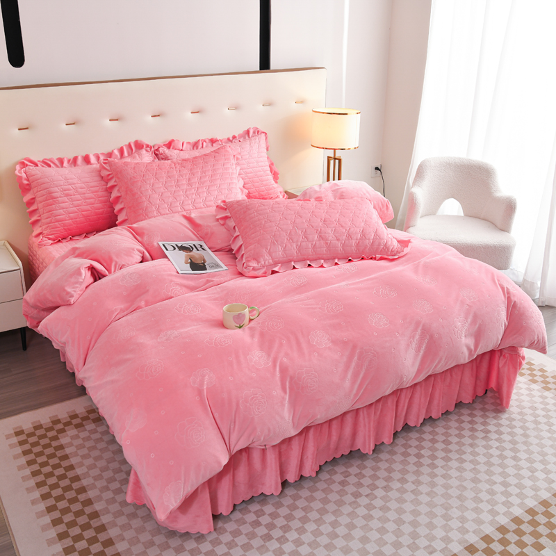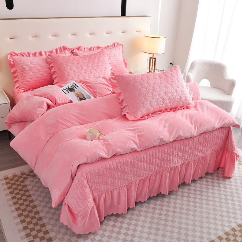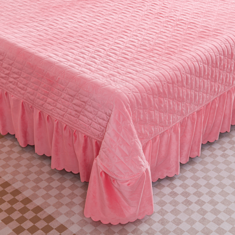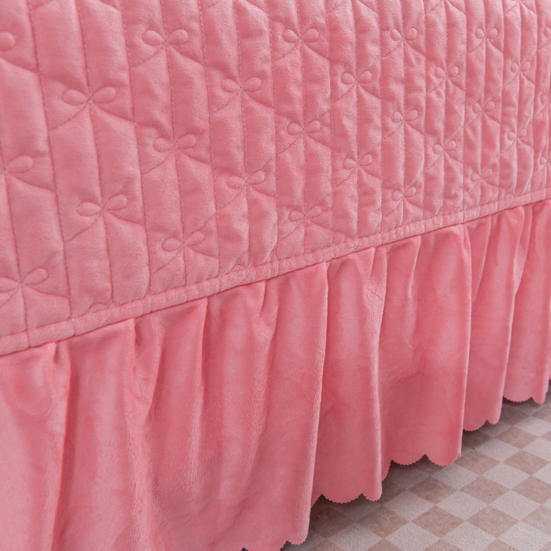 商品名称:雅眠居 直播爆款纯色宝宝绒床盖款四件套花边夹棉床裙款三件套 宝宝绒-粉色