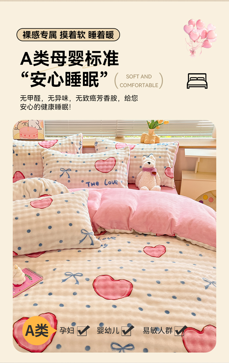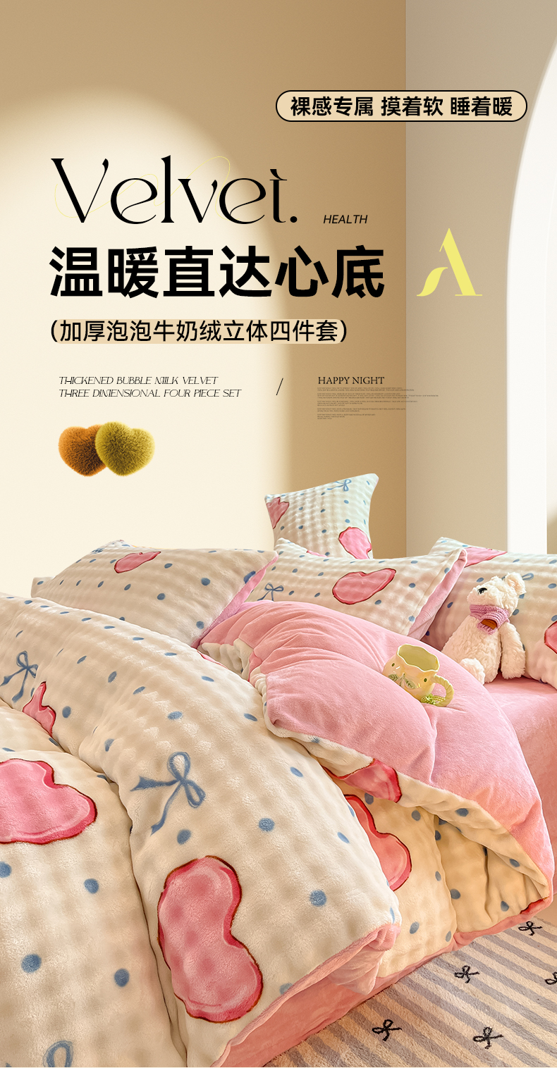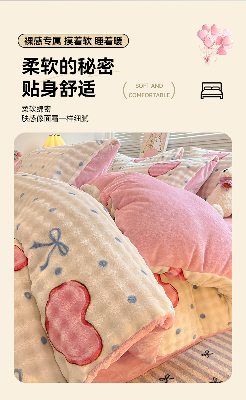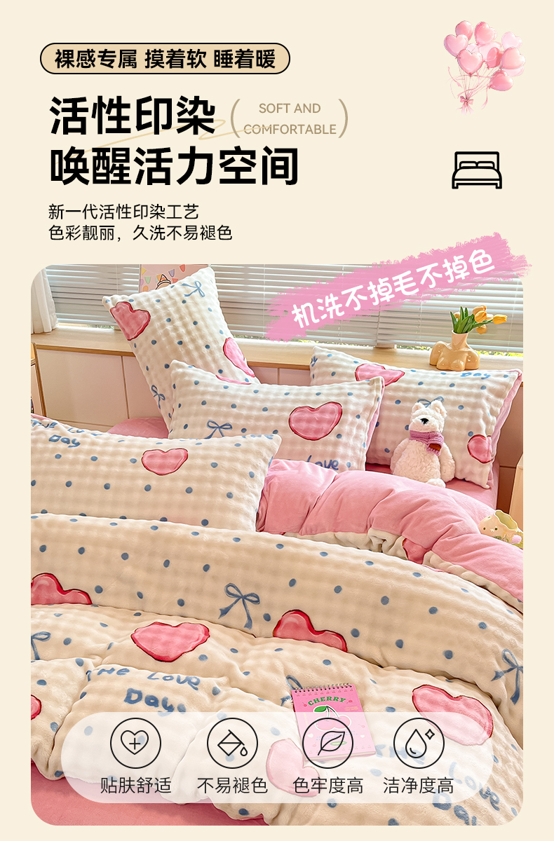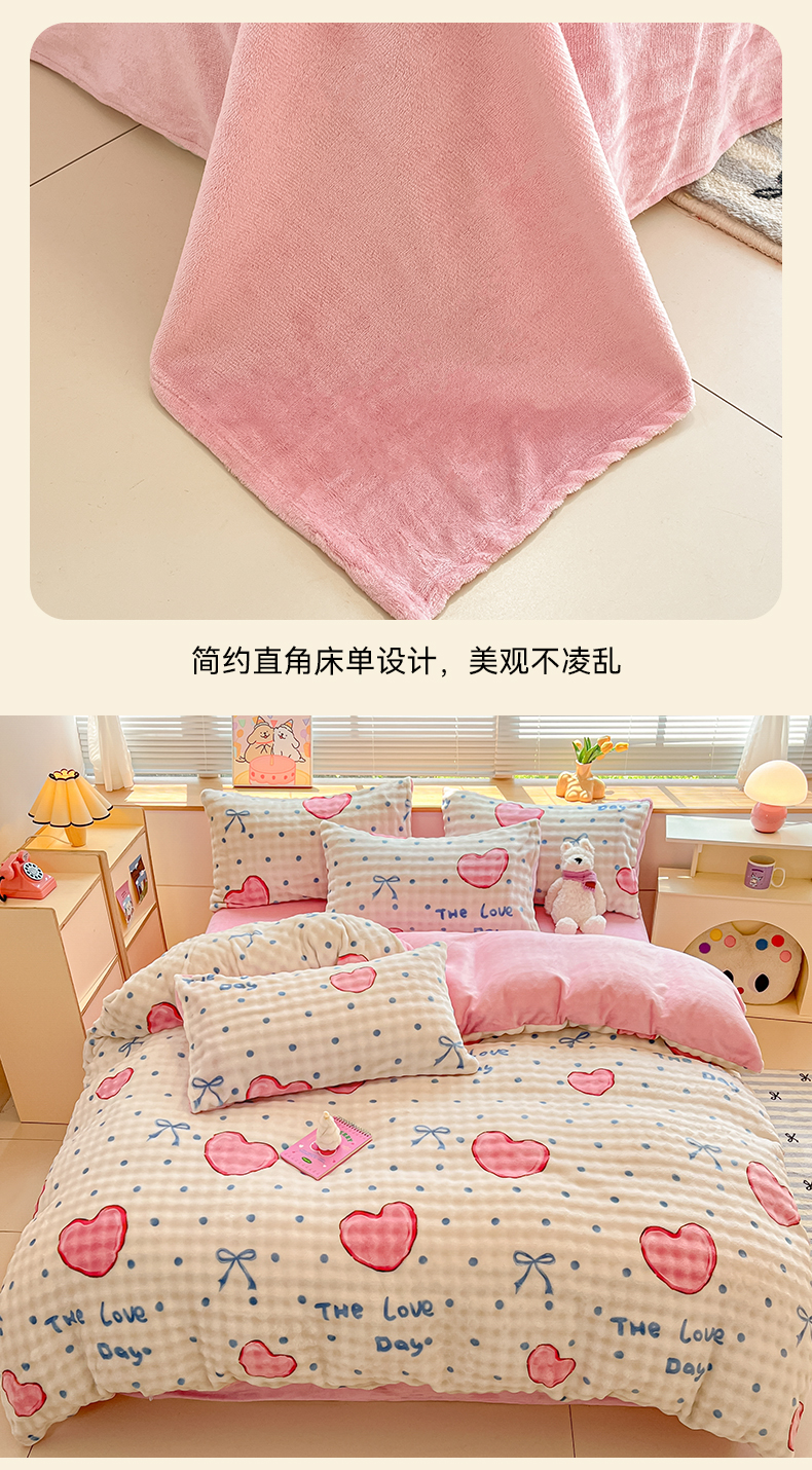 当前位置: 91家纺网 > 商品网购 > 床品套件 > 四件套 > 牛奶绒四件套 > 鸿羽樱(鸿羽樱)家纺 2024新款加厚泡泡牛奶绒印花工艺立体四件套 爱心粉