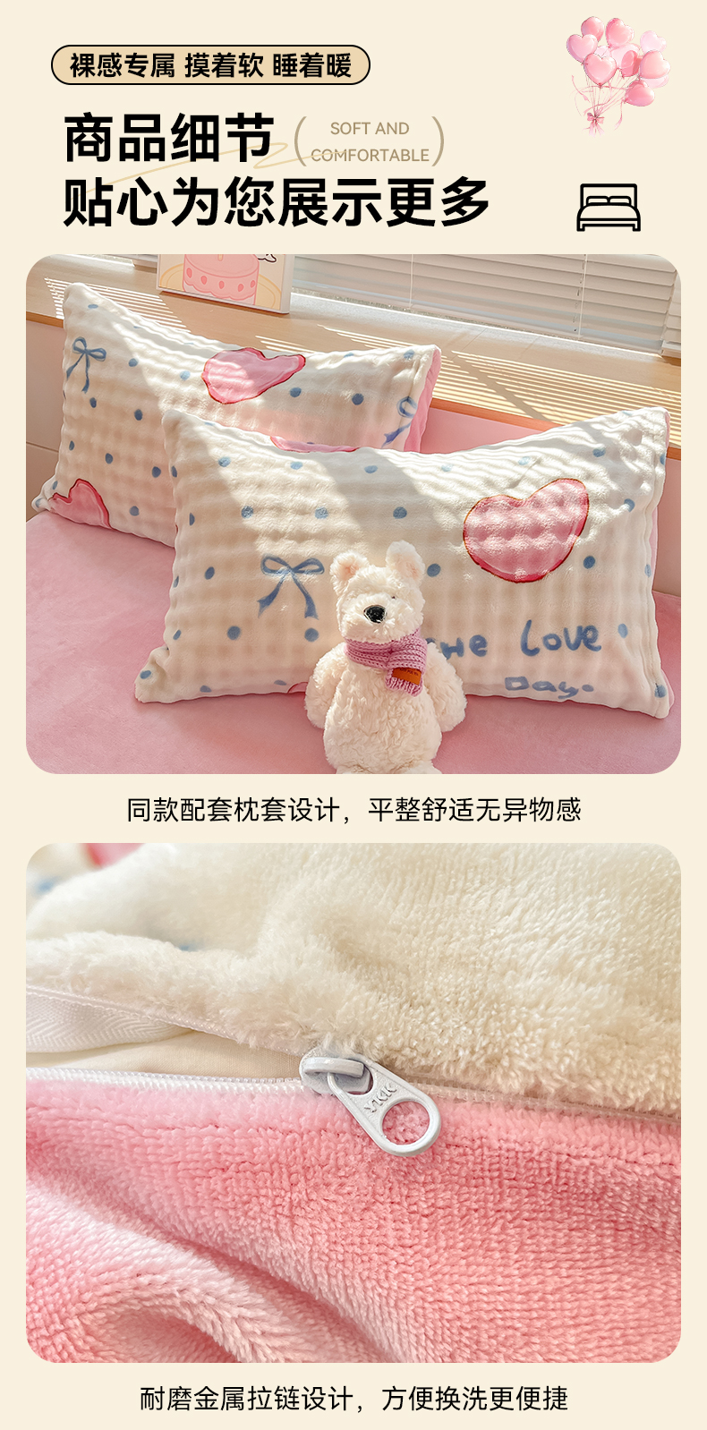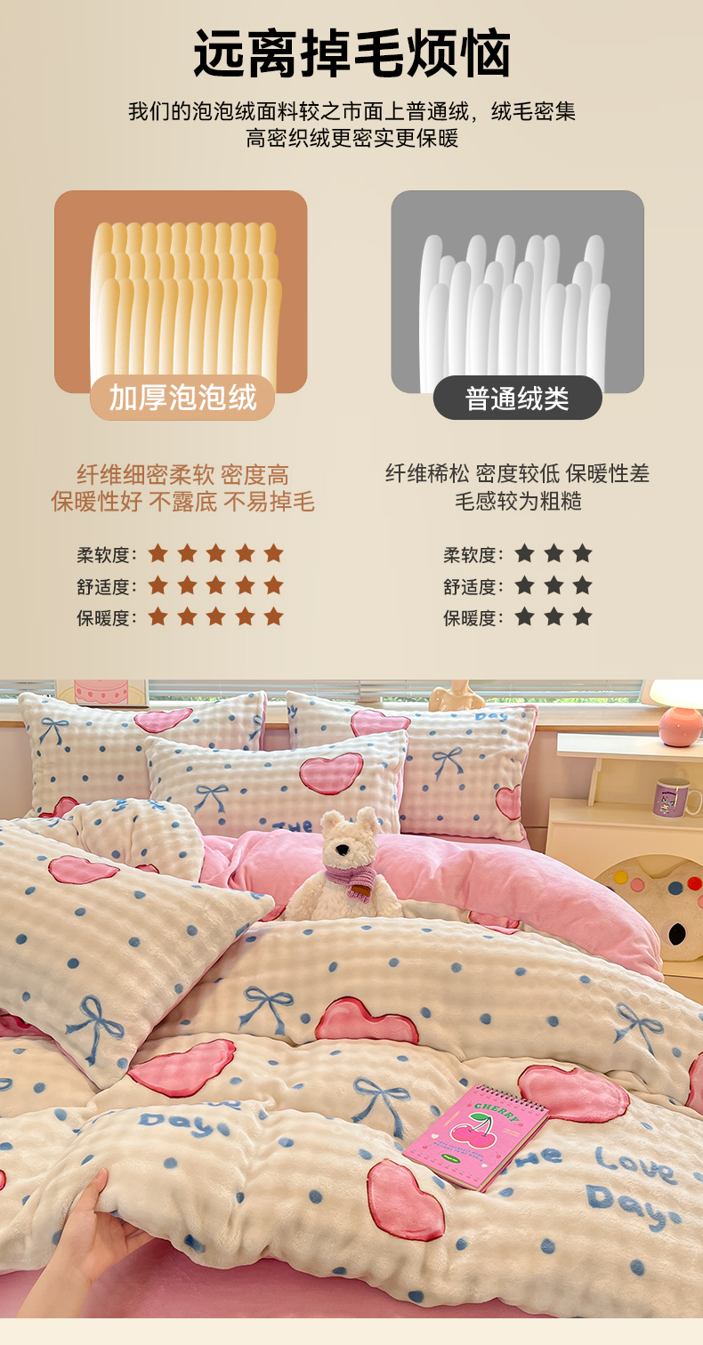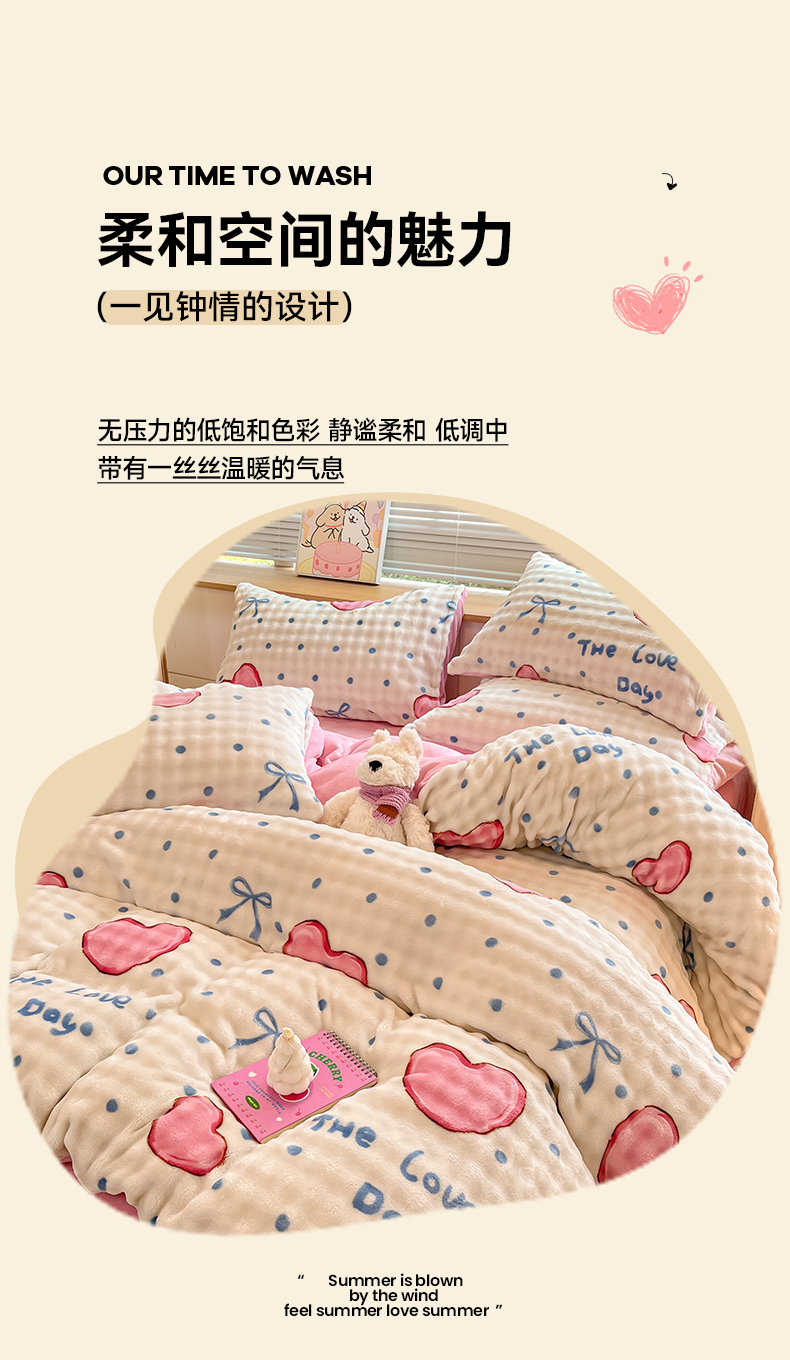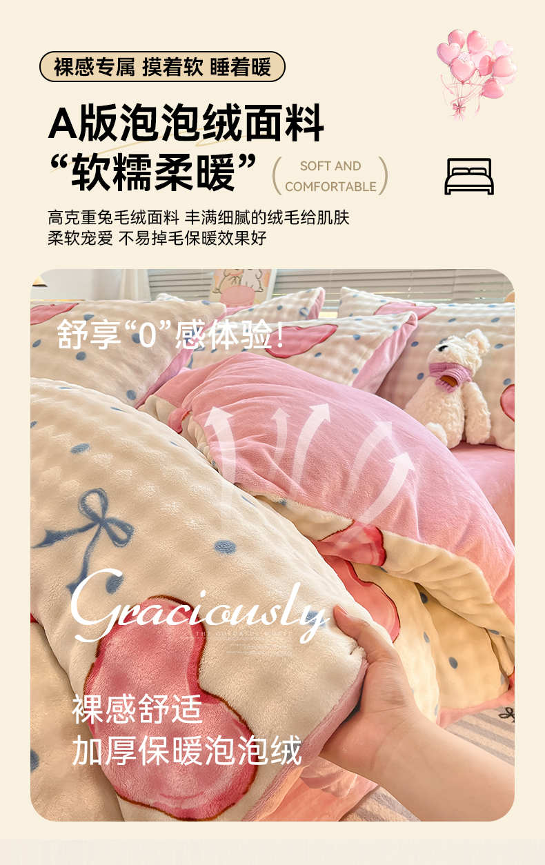 当前位置: 91家纺网 > 商品网购 > 床品套件 > 四件套 > 牛奶绒四件套 > 鸿羽樱(鸿羽樱)家纺 2024新款加厚泡泡牛奶绒印花工艺立体四件套 爱心粉
