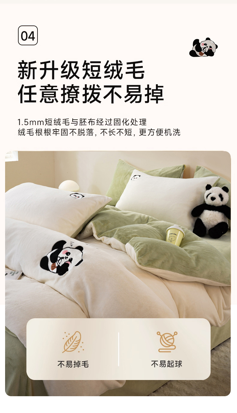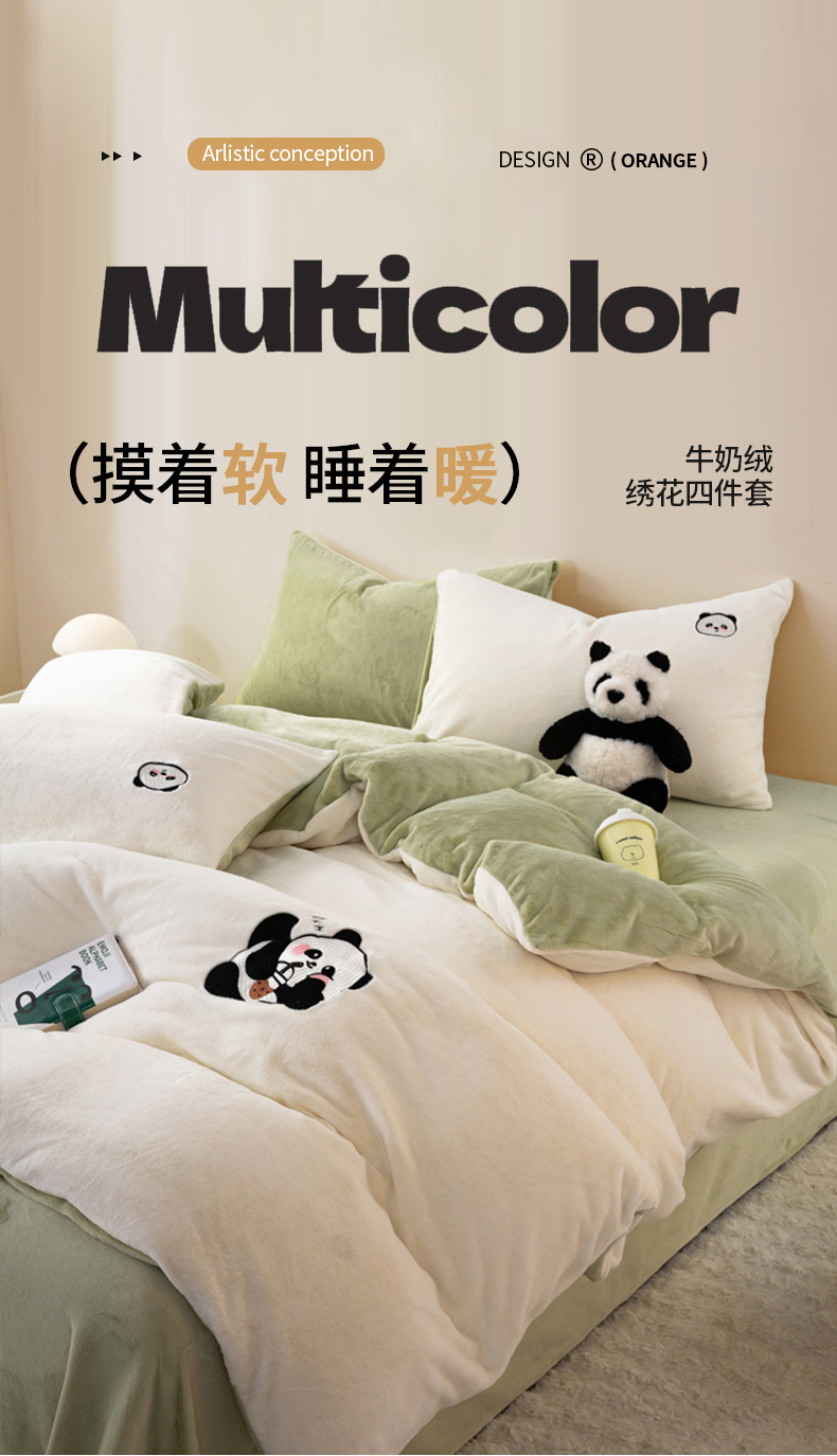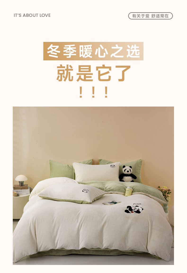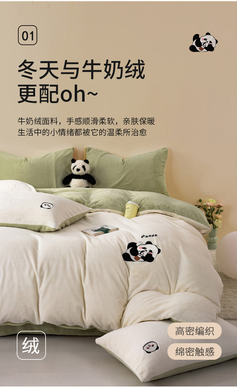 当前位置: 91家纺网 > 商品网购 > 床品套件 > 四件套 > 牛奶绒四件套 > 沐晴家纺 2024新品秋冬加厚牛奶绒纯色简约绣花卡通四件套 熊猫(白+草绿)