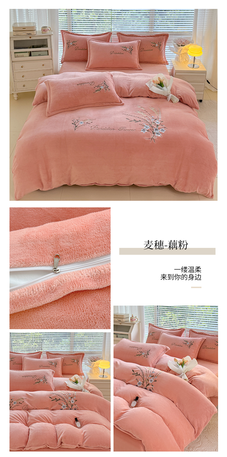 商品名称:金米诺 2024新款绣花牛奶绒四件套 麦穗-藕粉