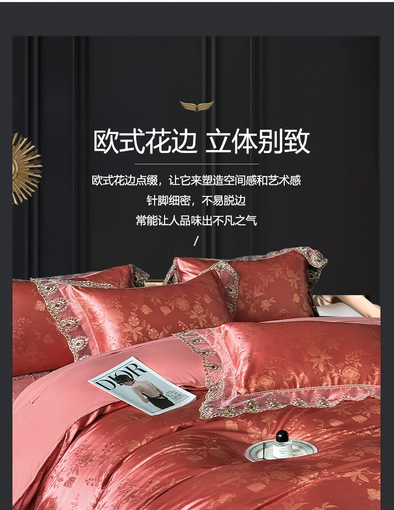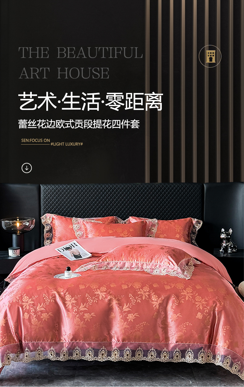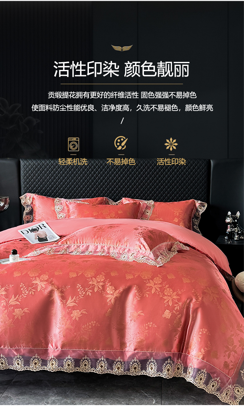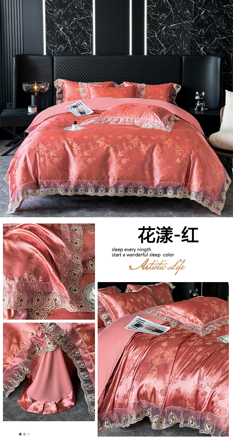 商品名称:七夜居 2025新款蕾丝花边欧式贡缎提花四件套礼盒装 花漾-红