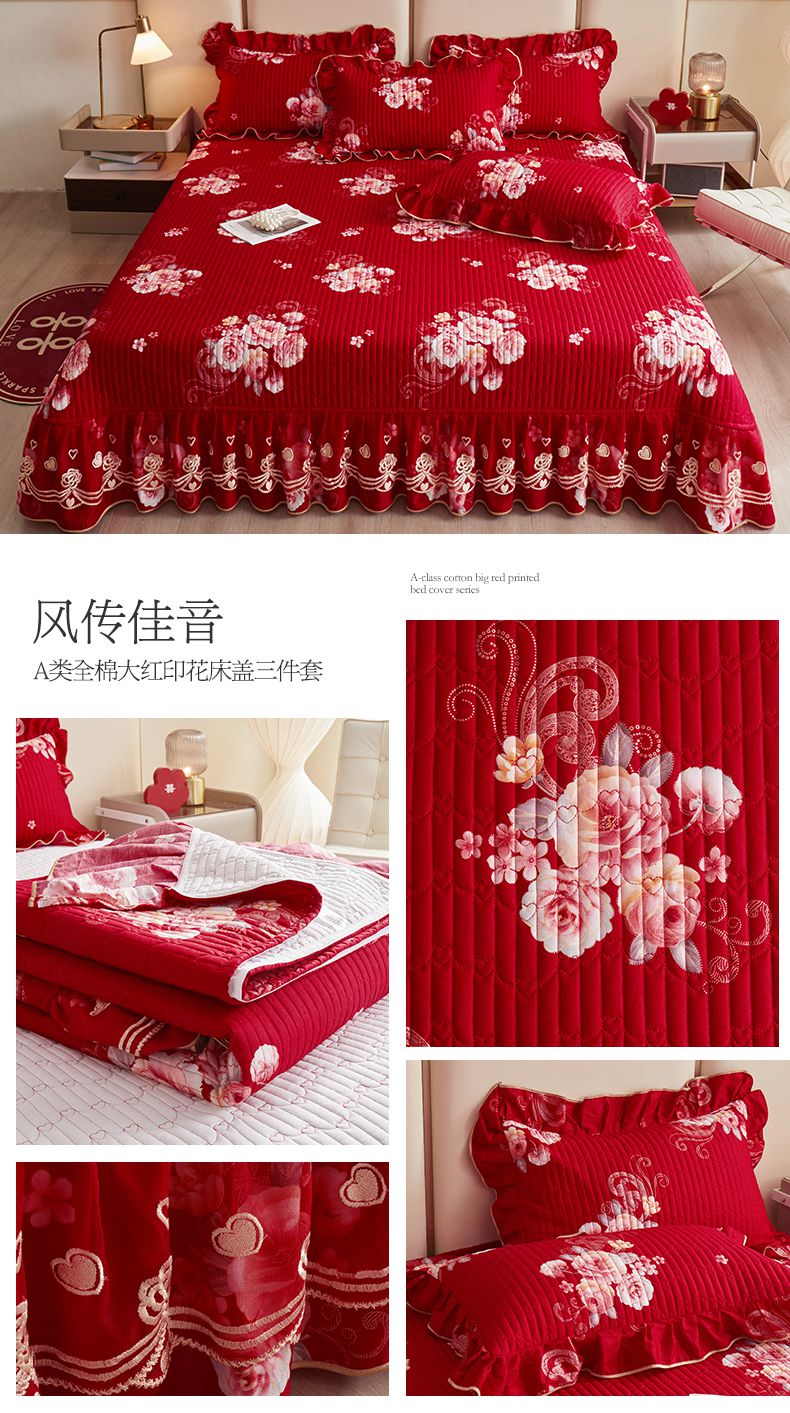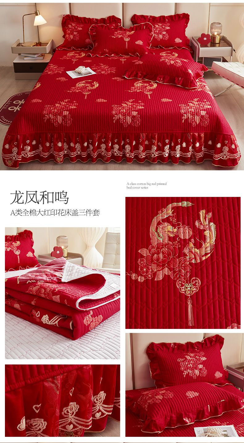 当前位置: 91家纺网 > 商品网购 > 床品套件 > 四件套 > 婚庆四件套 > 宜凡家纺 2024新款A类全棉大红印花床盖三件套 风传佳音