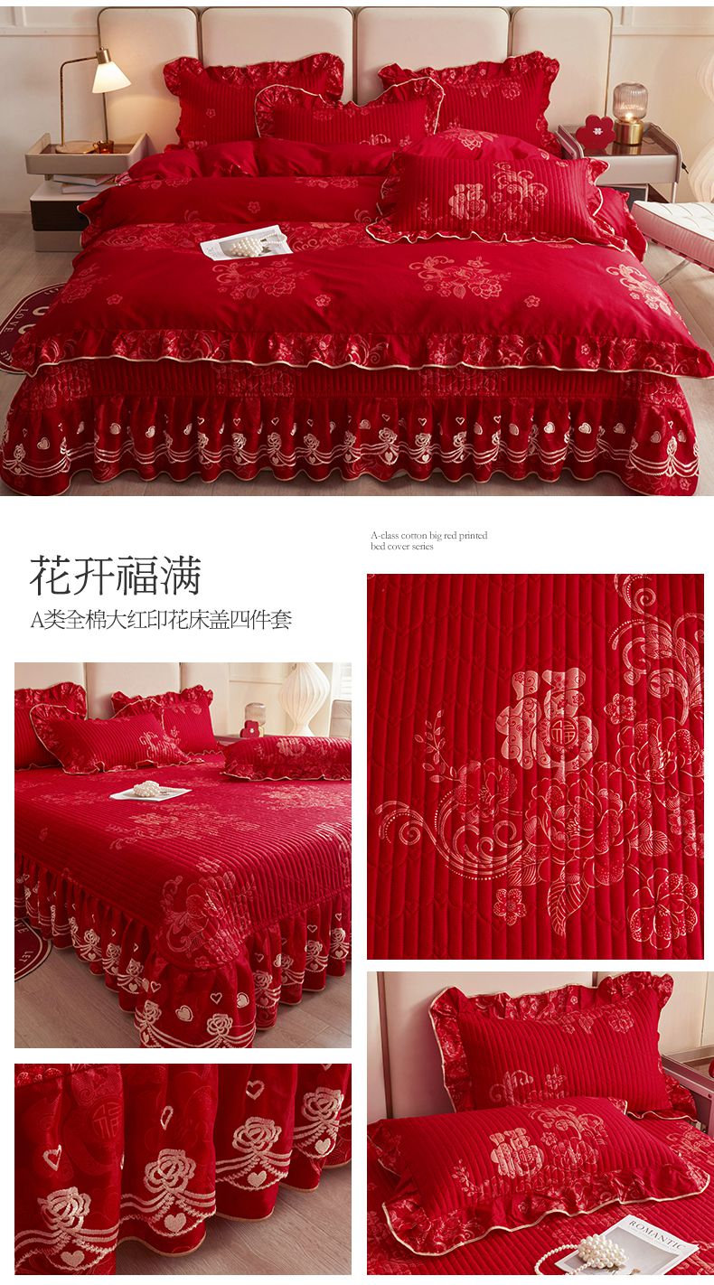 宜凡家纺 2024新款A类全棉大红印花床盖四件套 六合同春