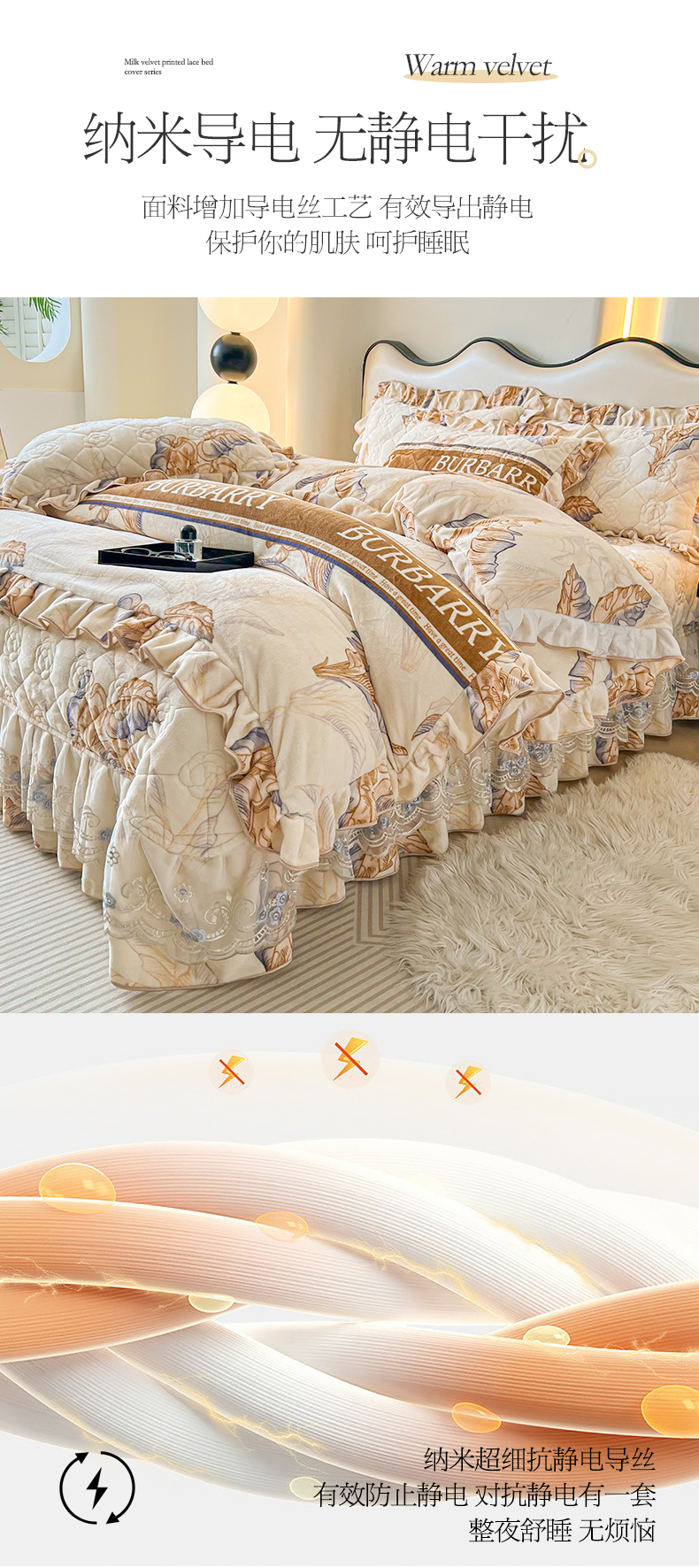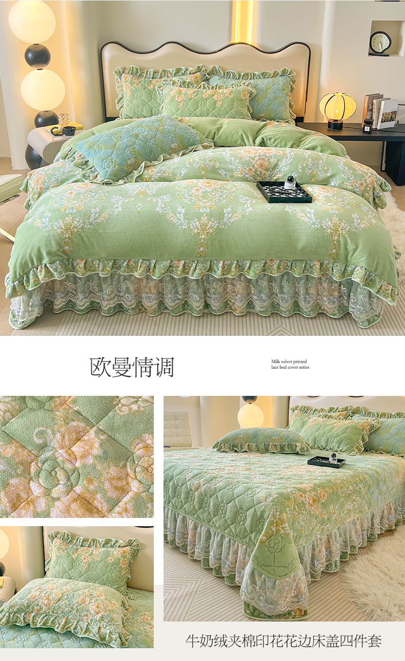 商品名称:宜凡家纺 2024新款牛奶绒印花夹棉花边床盖四件套 锦绣花都