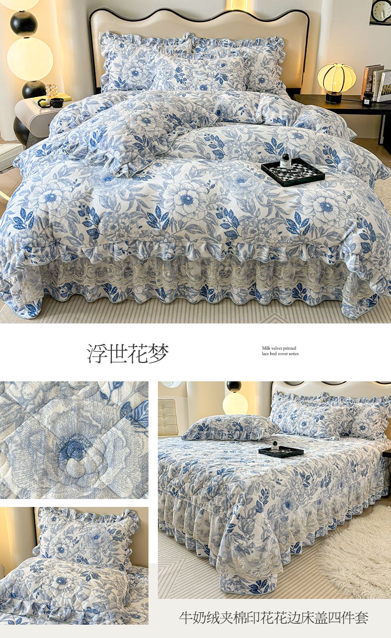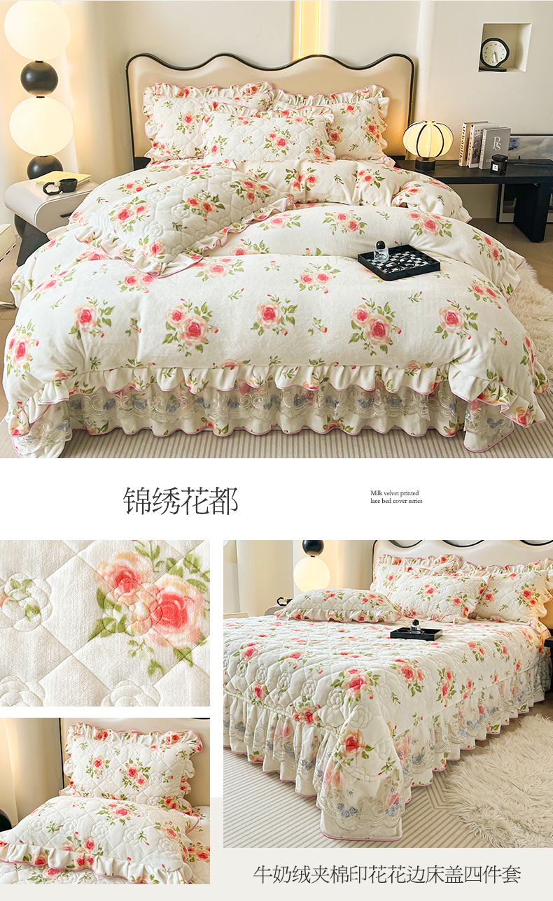宜凡家纺 2024新款牛奶绒印花夹棉花边床盖四件套 锦绣花都
