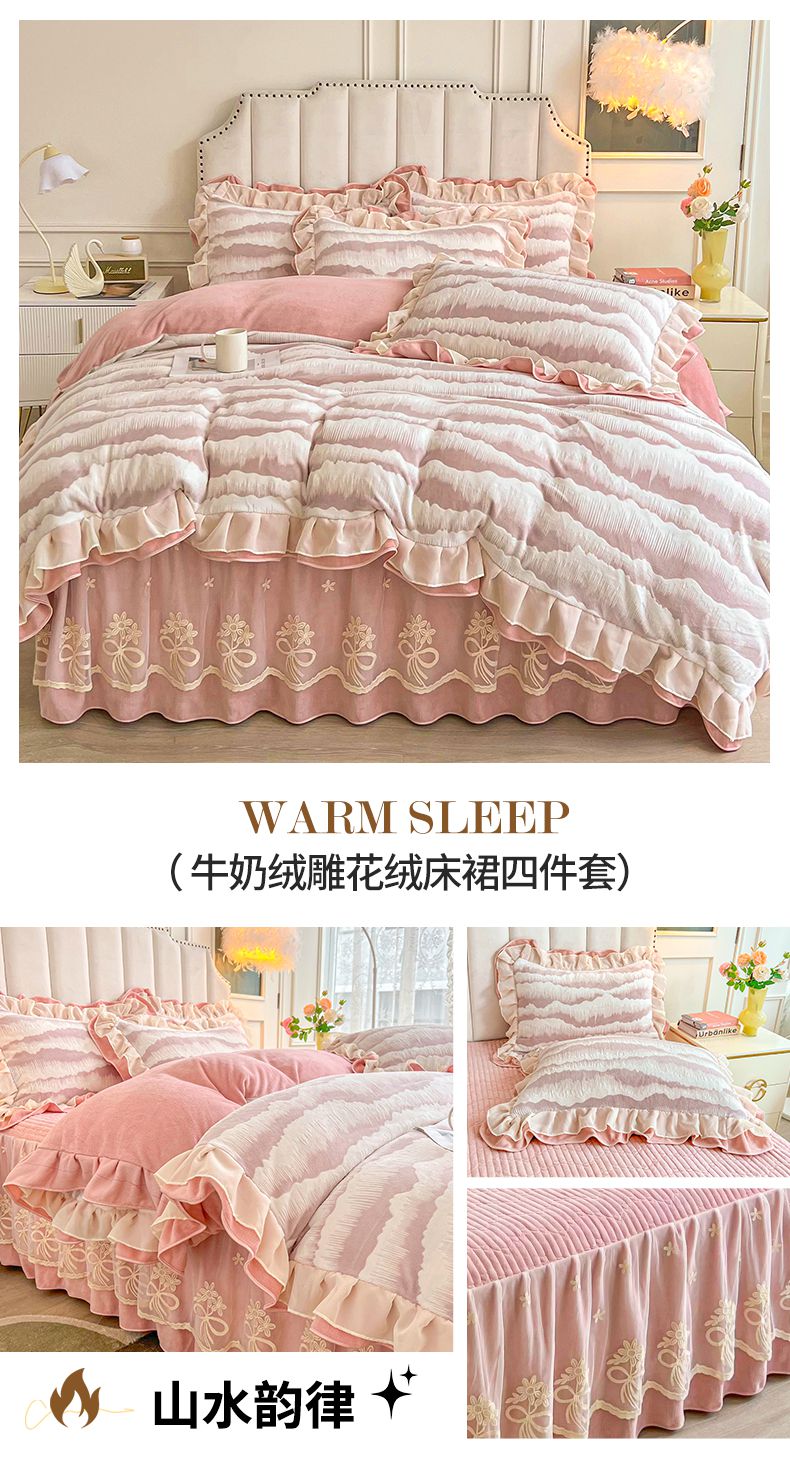 (总)宜凡家纺 2025新款兔绒提花牛奶绒夹棉床裙四件套,爱心 少女粉,爱心 粉紫,爱心 驼色,蝶舞 大红,蝶舞 米色,蝶舞 浅紫,蝶舞 玉色,简爱 苍青,简爱 豆沙紫,简爱 玉色,樱桃 苍青,樱桃 豆沙紫,樱桃 奶油白