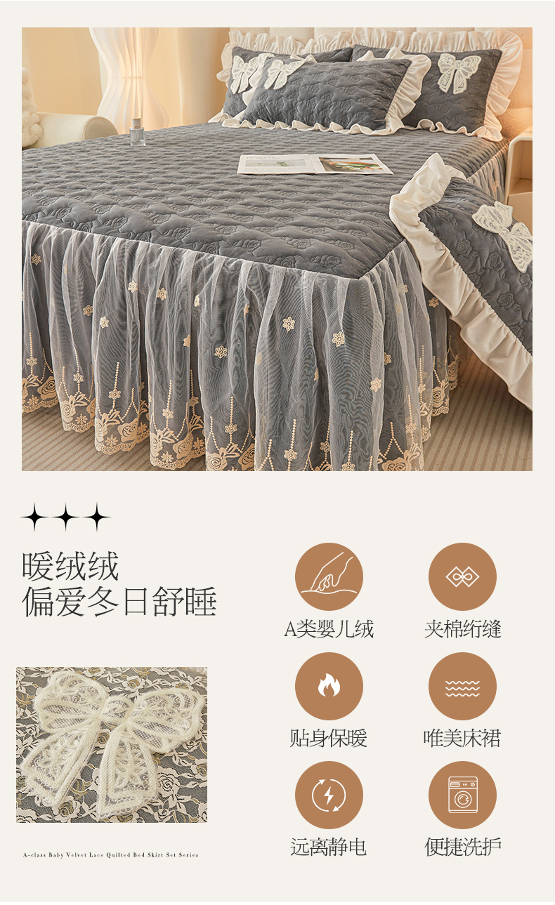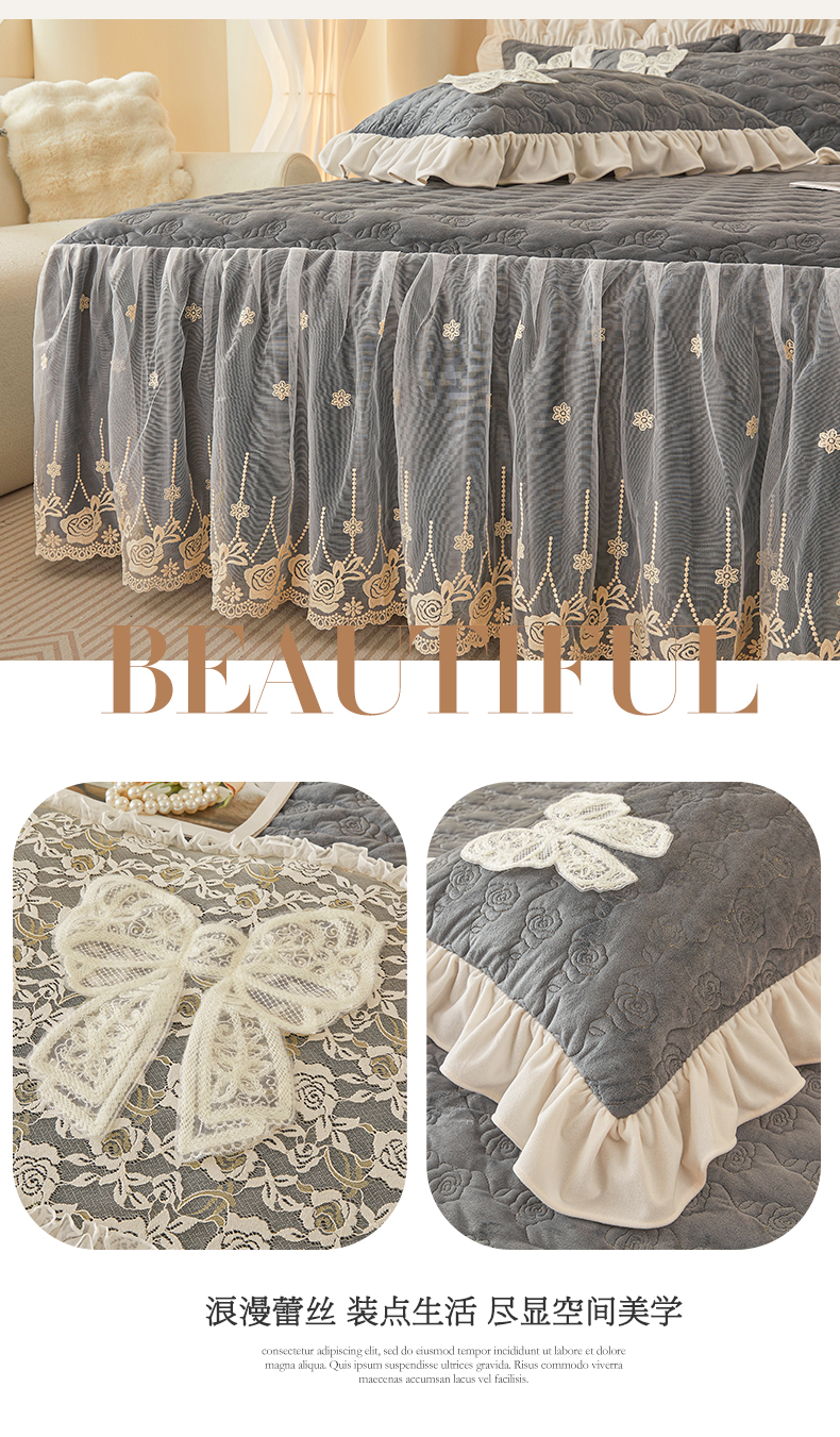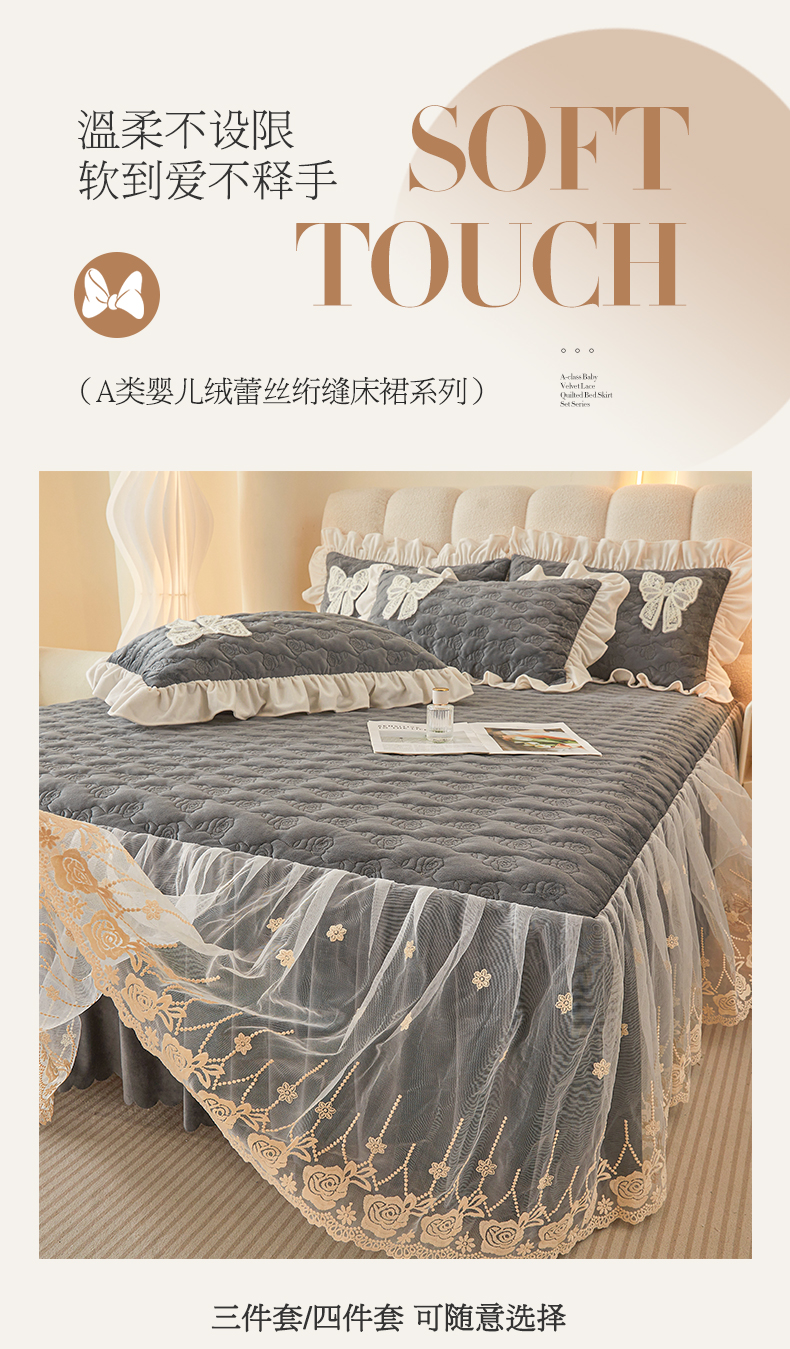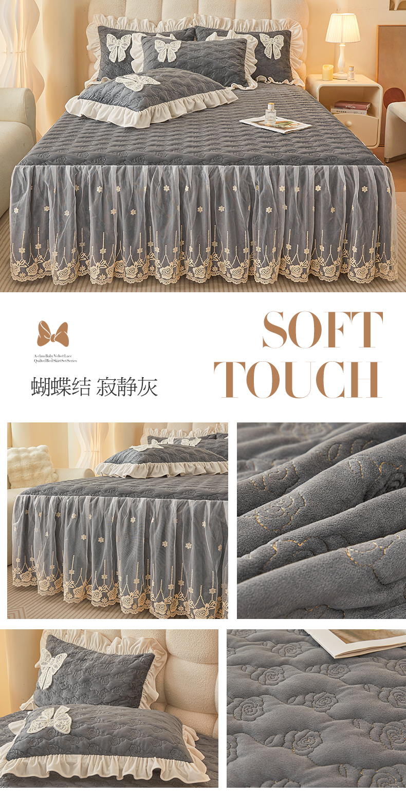 • 91家纺网 家纺一手货源 找家纺 情恒家纺 2025新款A类婴儿绒全夹棉奶油风(蝴蝶结)床裙三件套 蝴蝶结寂静灰
