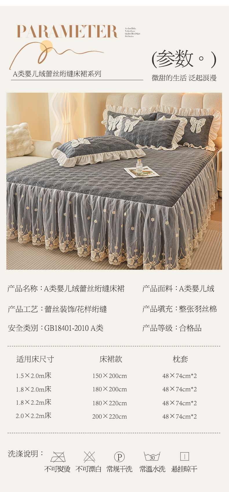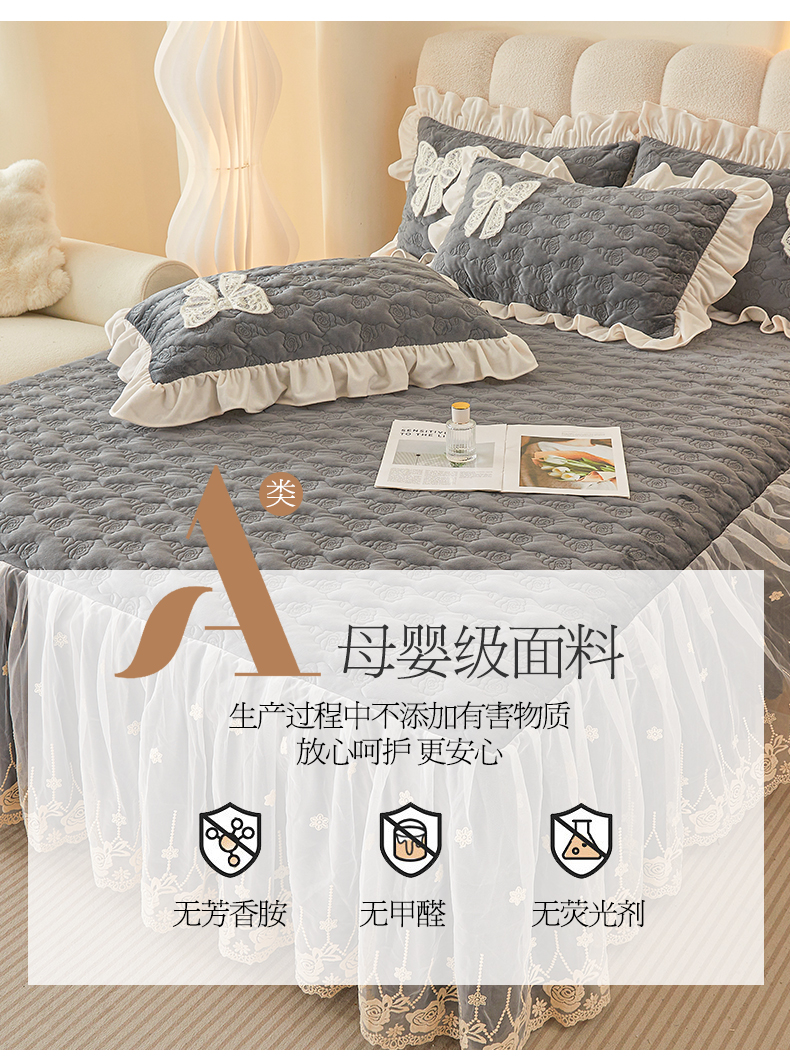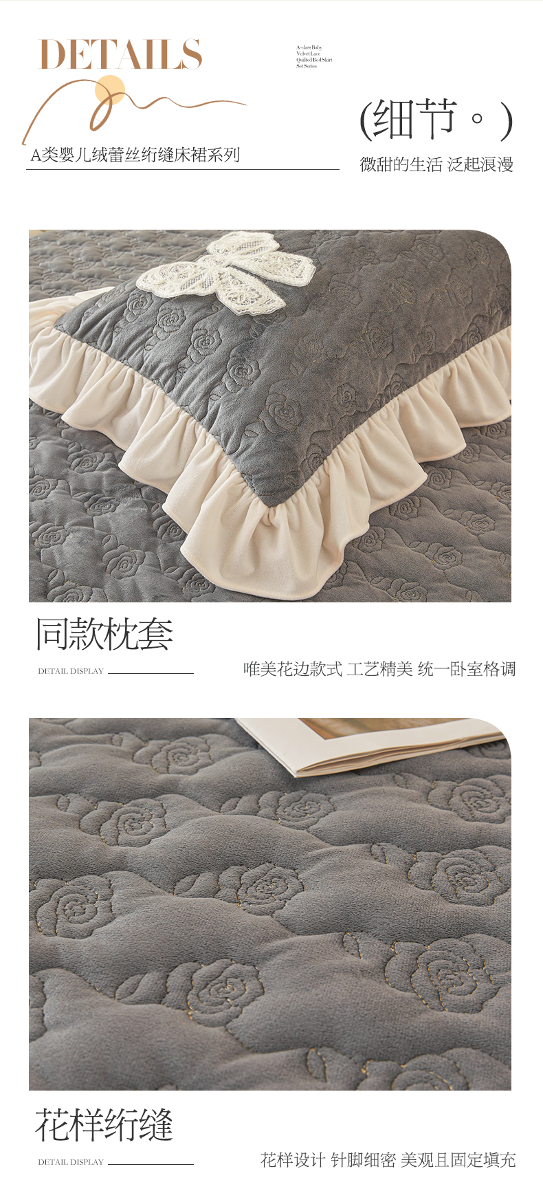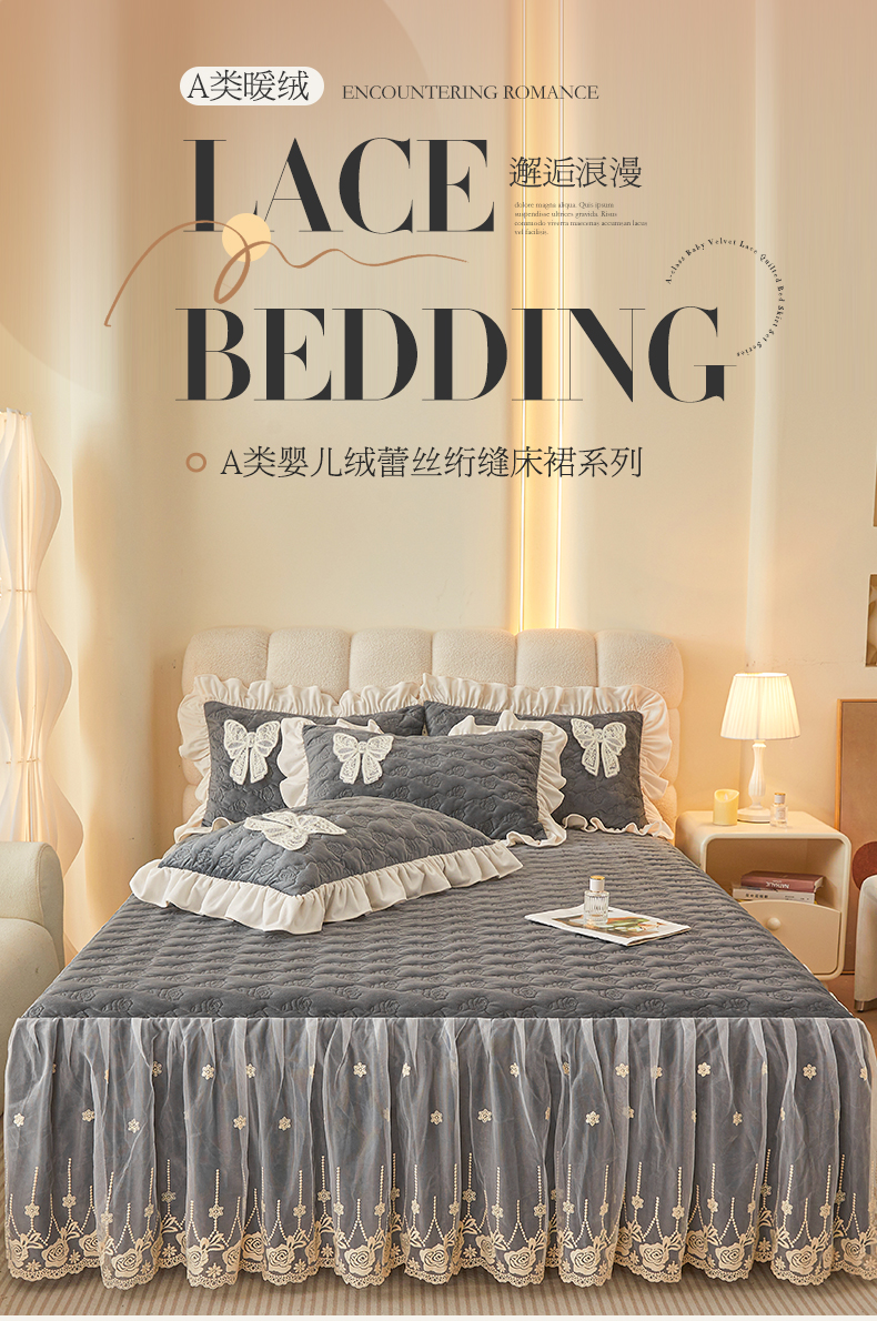 • 91家纺网 家纺一手货源 找家纺 情恒家纺 2025新款A类婴儿绒全夹棉奶油风(蝴蝶结)床裙三件套 蝴蝶结寂静灰