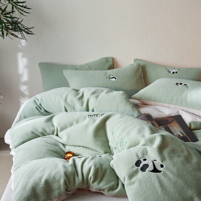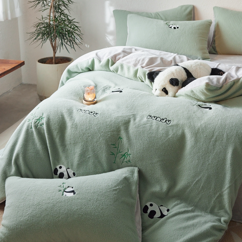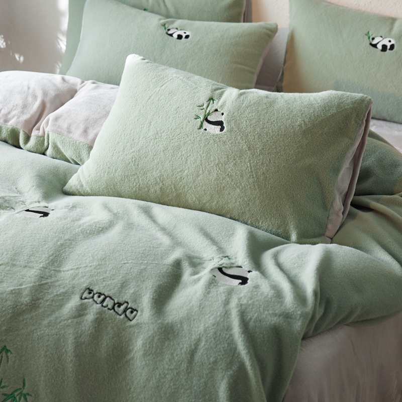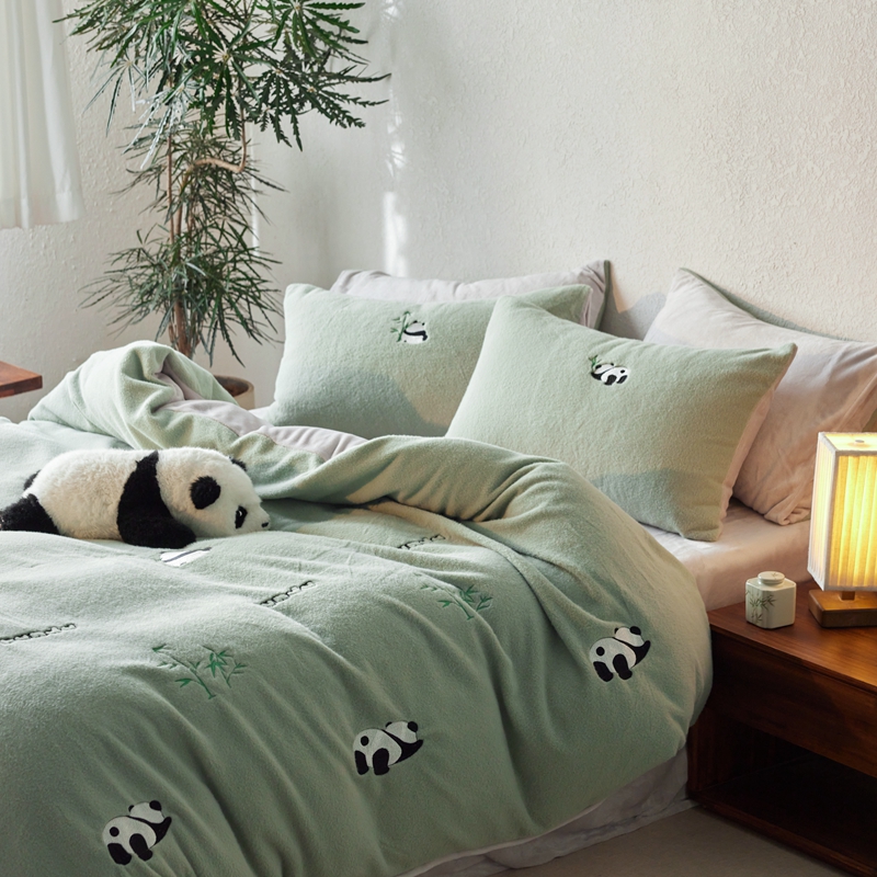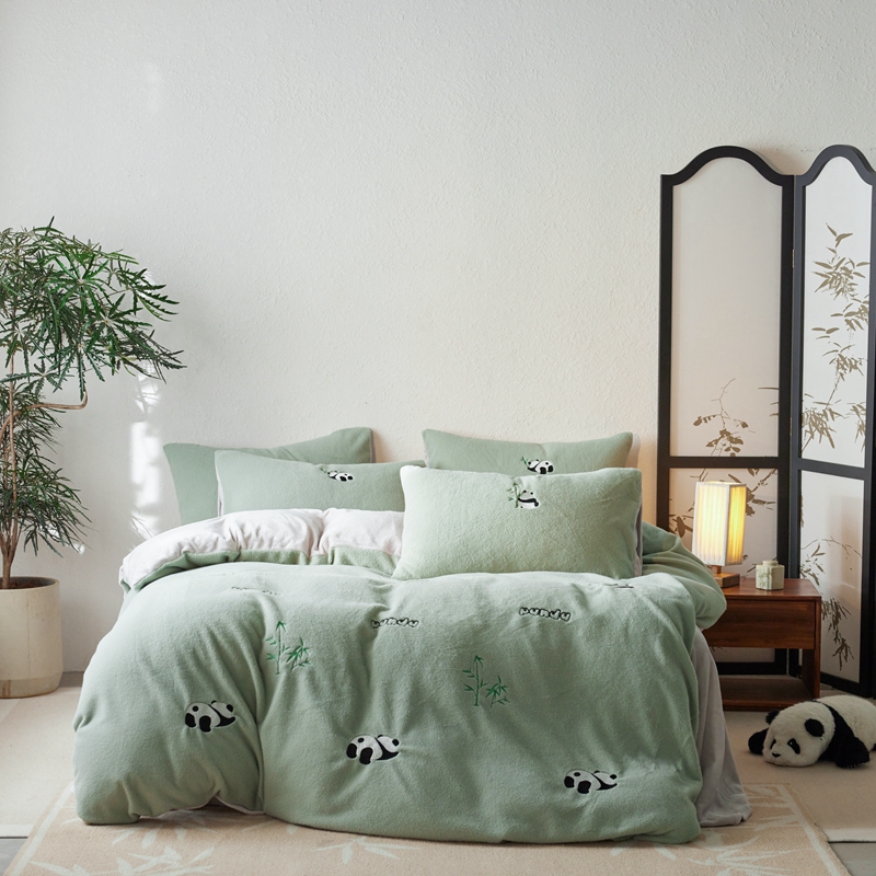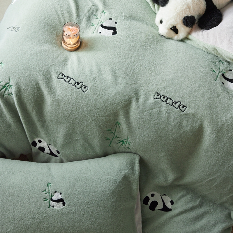 商品名称:初拾 2024新款300g暖羊绒绣花四件套-熊猫噗噗 熊猫噗噗-墨绿