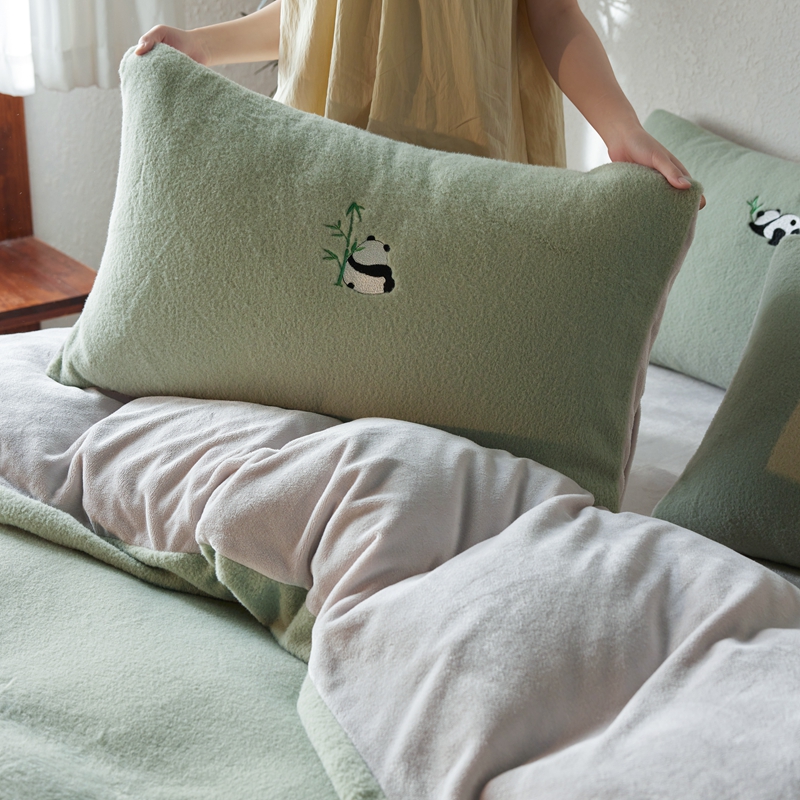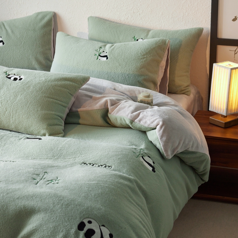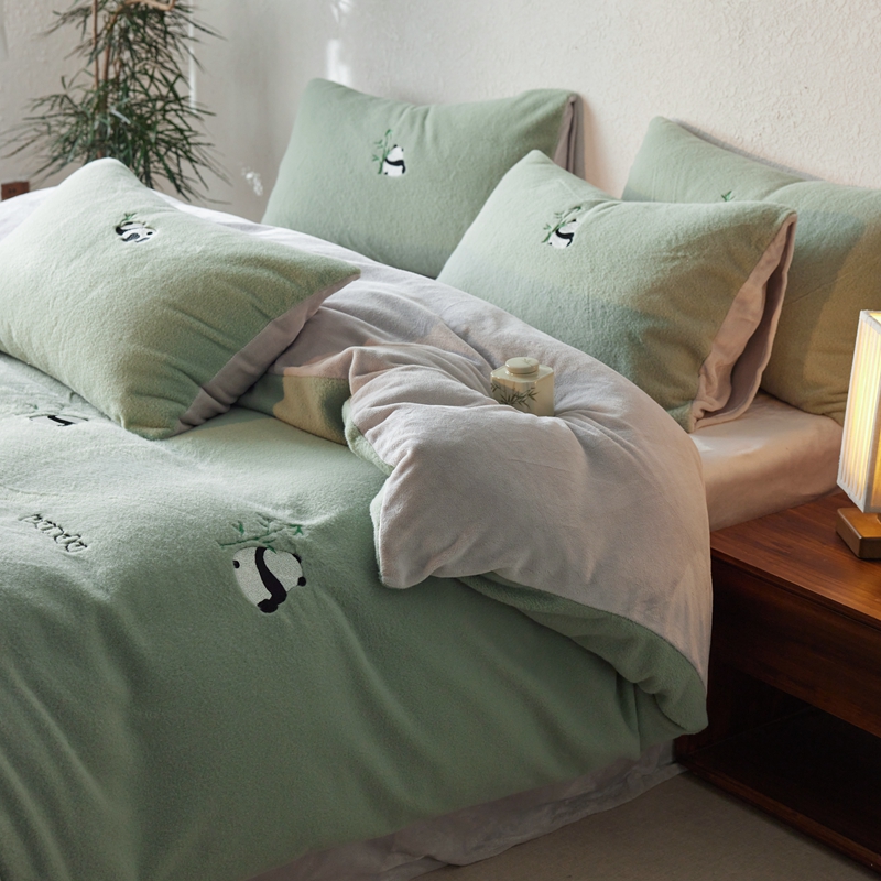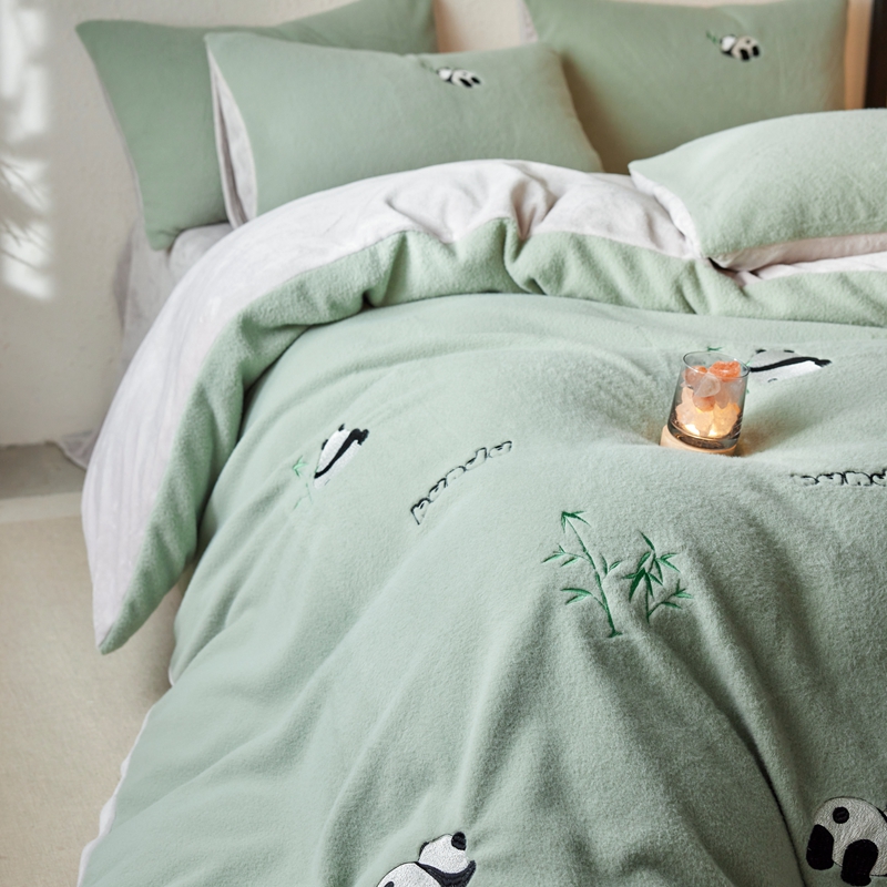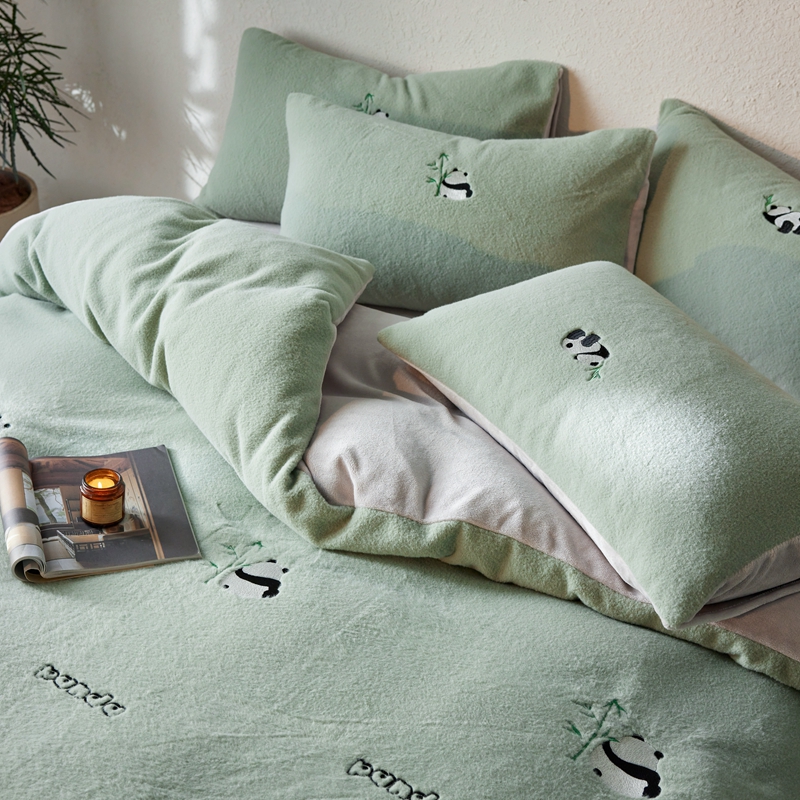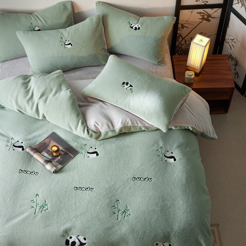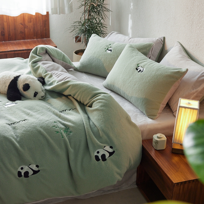 商品名称:初拾 2024新款300g暖羊绒绣花四件套-熊猫噗噗 熊猫噗噗-墨绿