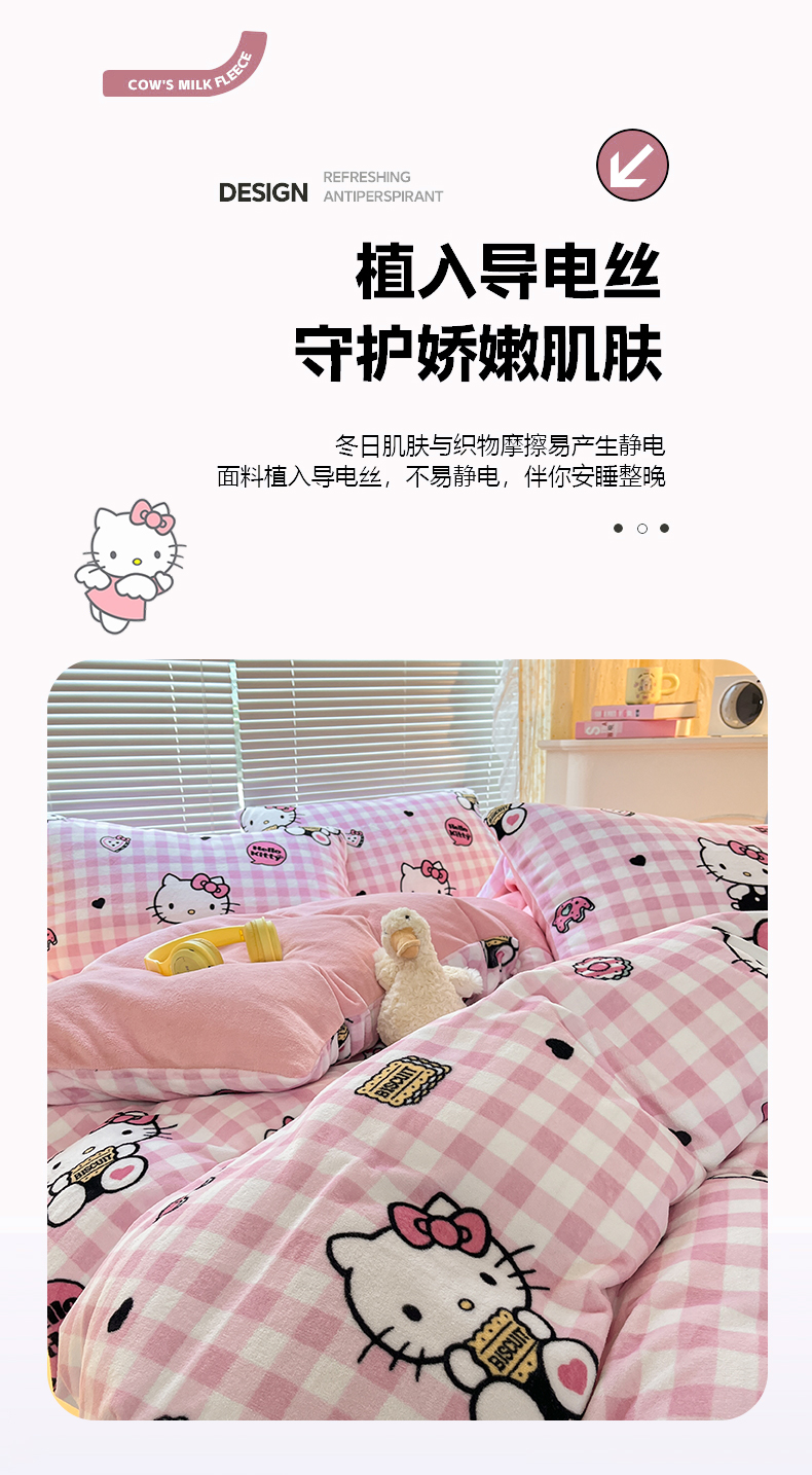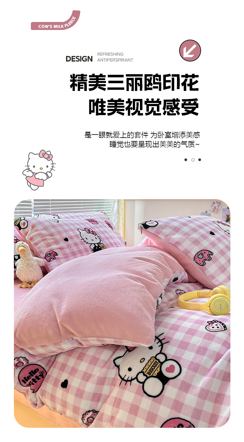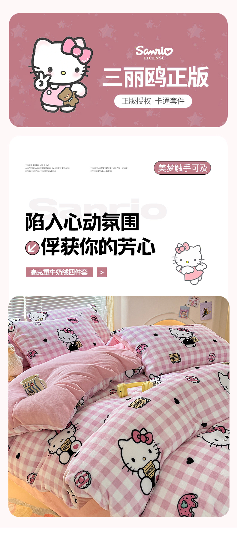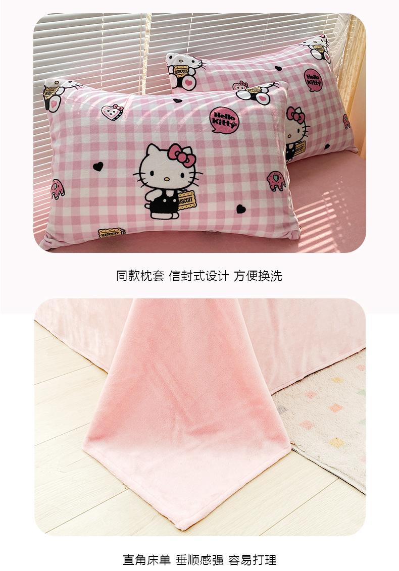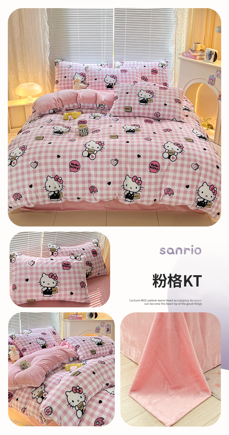 当前位置: 91家纺网 > 商品网购 > 床品套件 > 四件套 > 牛奶绒四件套 > 美澳家纺 2024新款200克三丽鸥系列卡通印花牛奶绒单被套三四件套 粉格KT