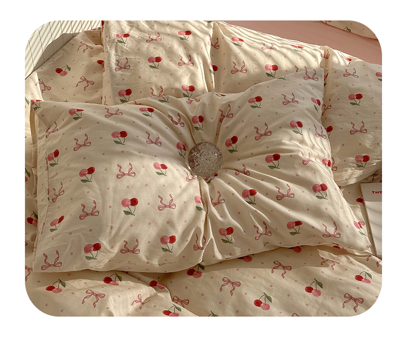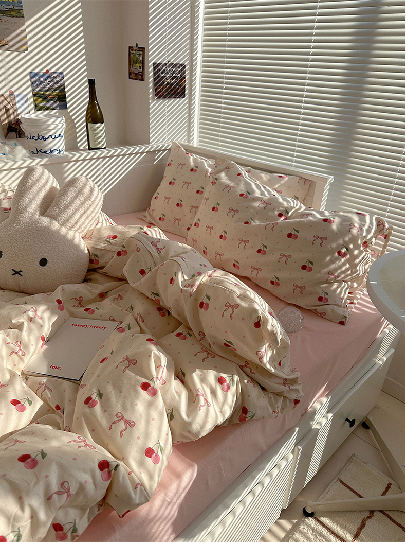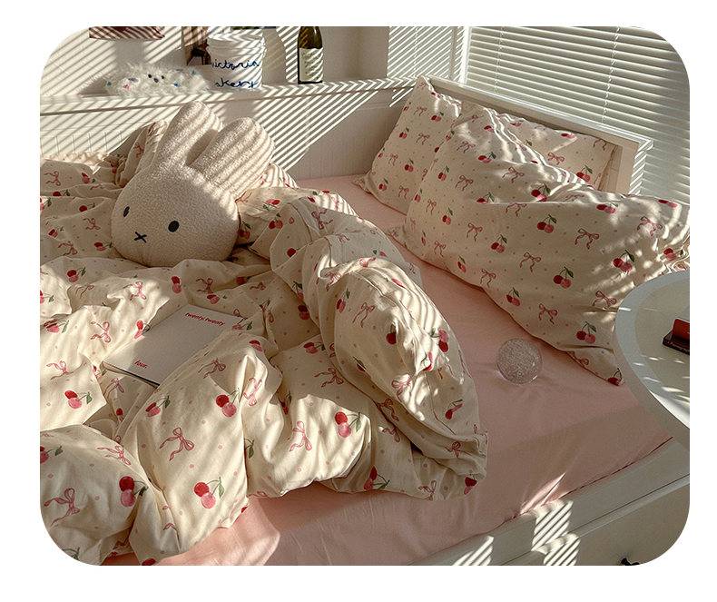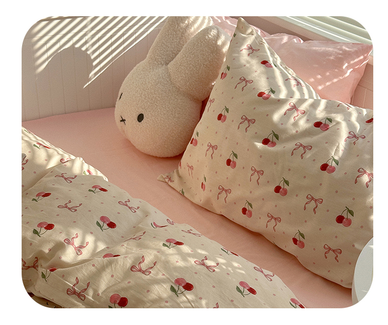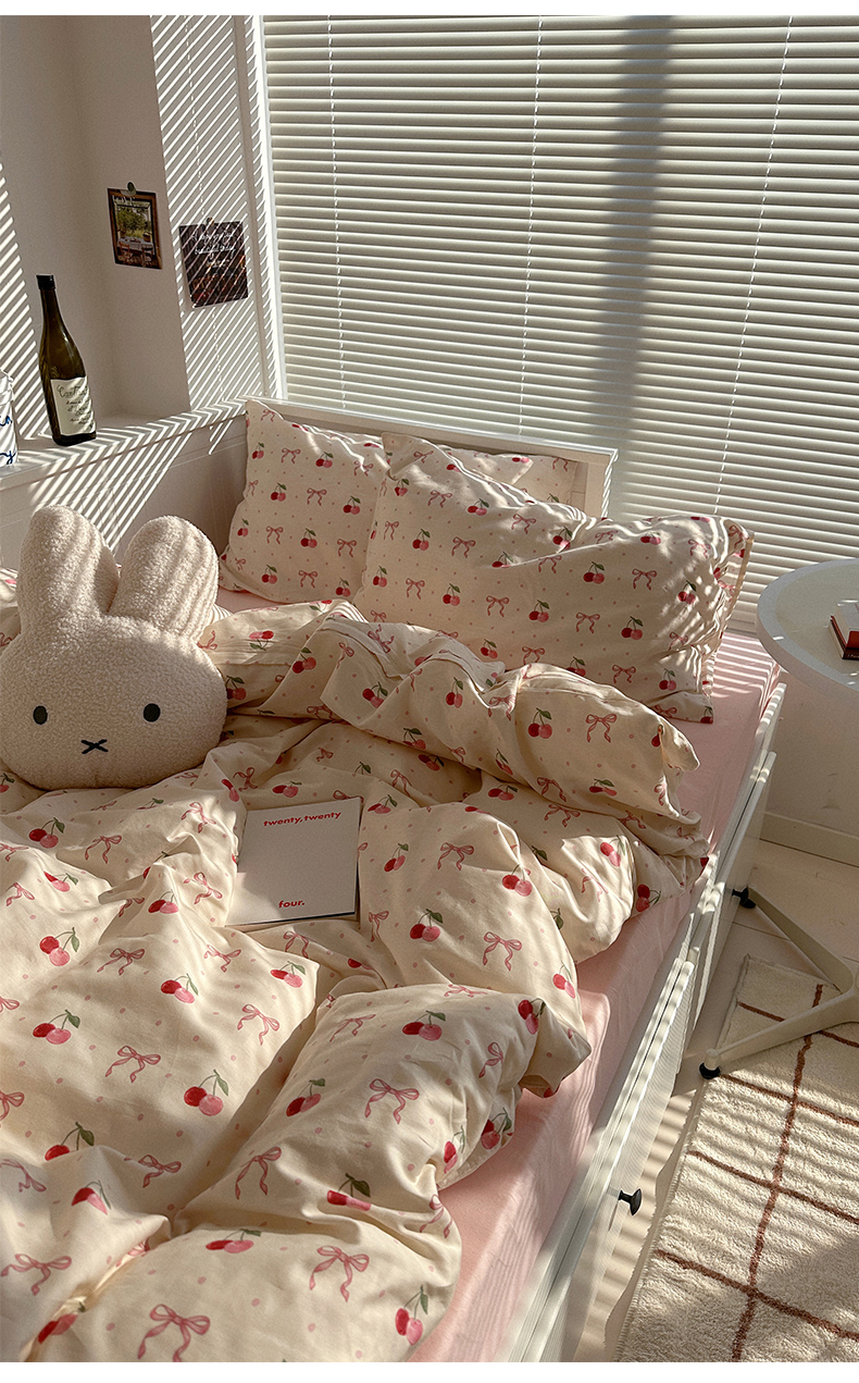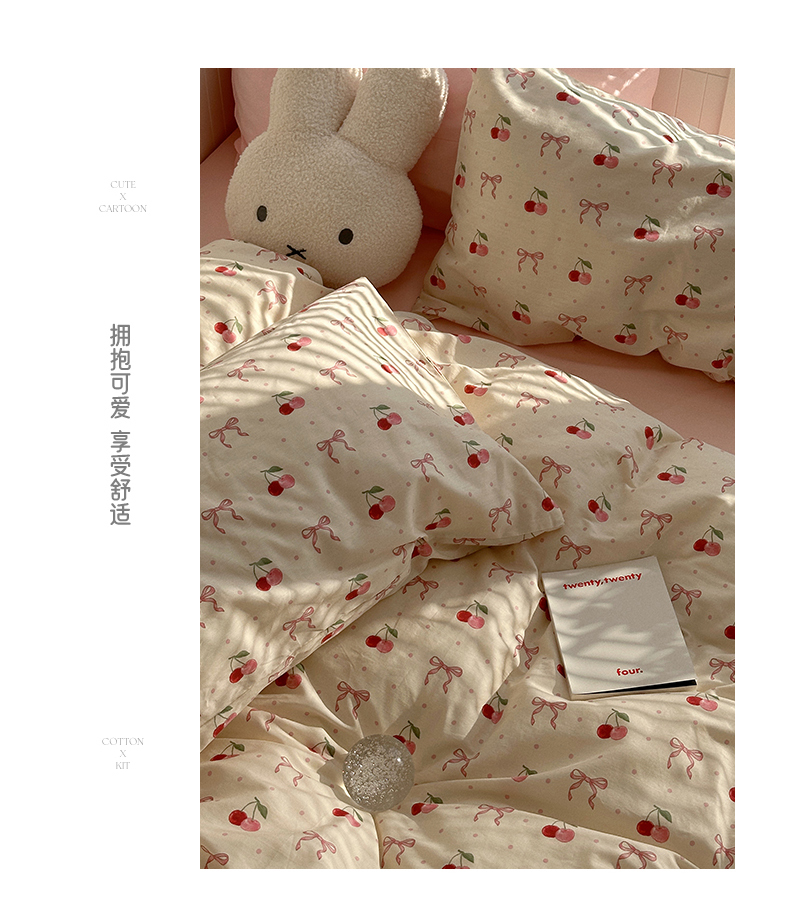 商品名称:尺素 2025年春夏新款全棉卡通四件套纯棉双人被套纯色床单床笠三件套儿童床上用品 樱桃红了 裸粉