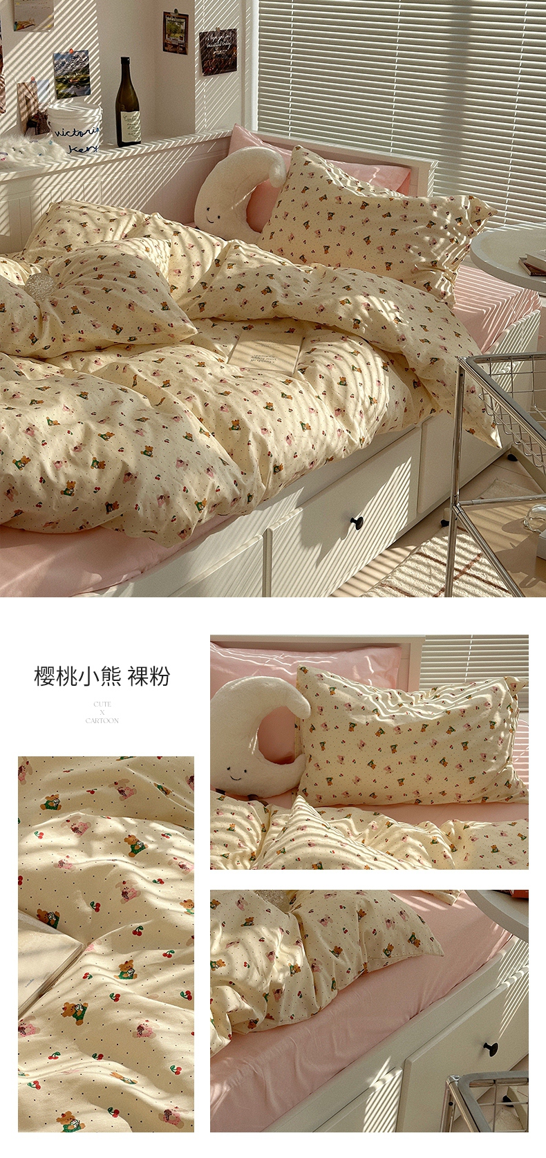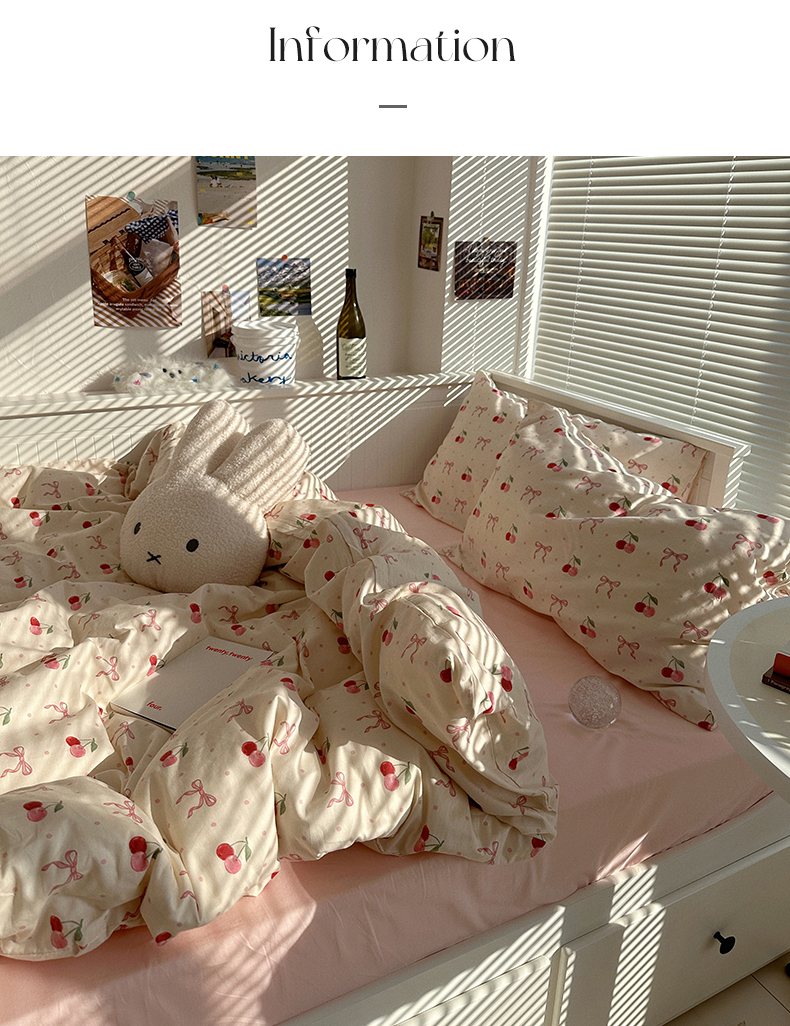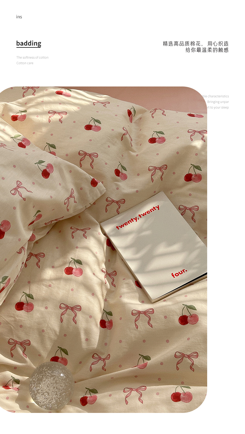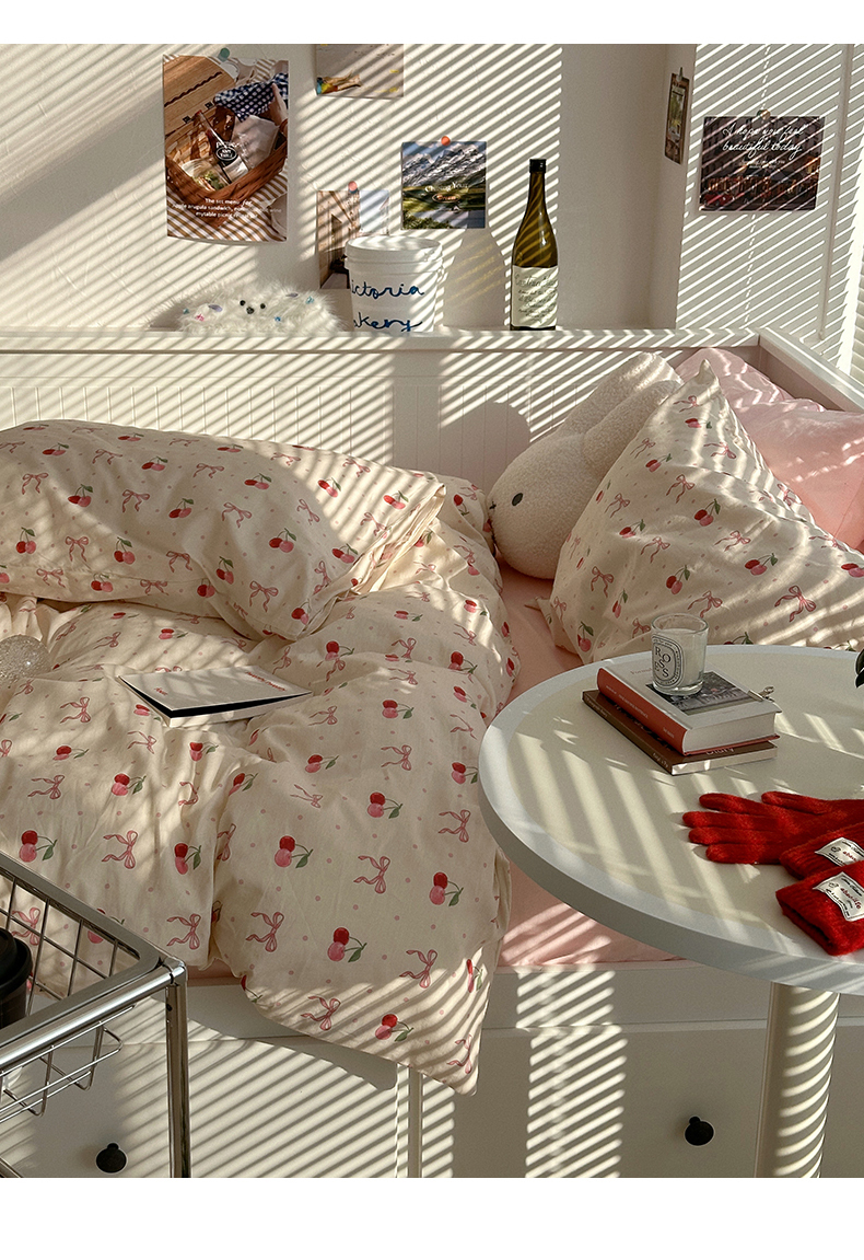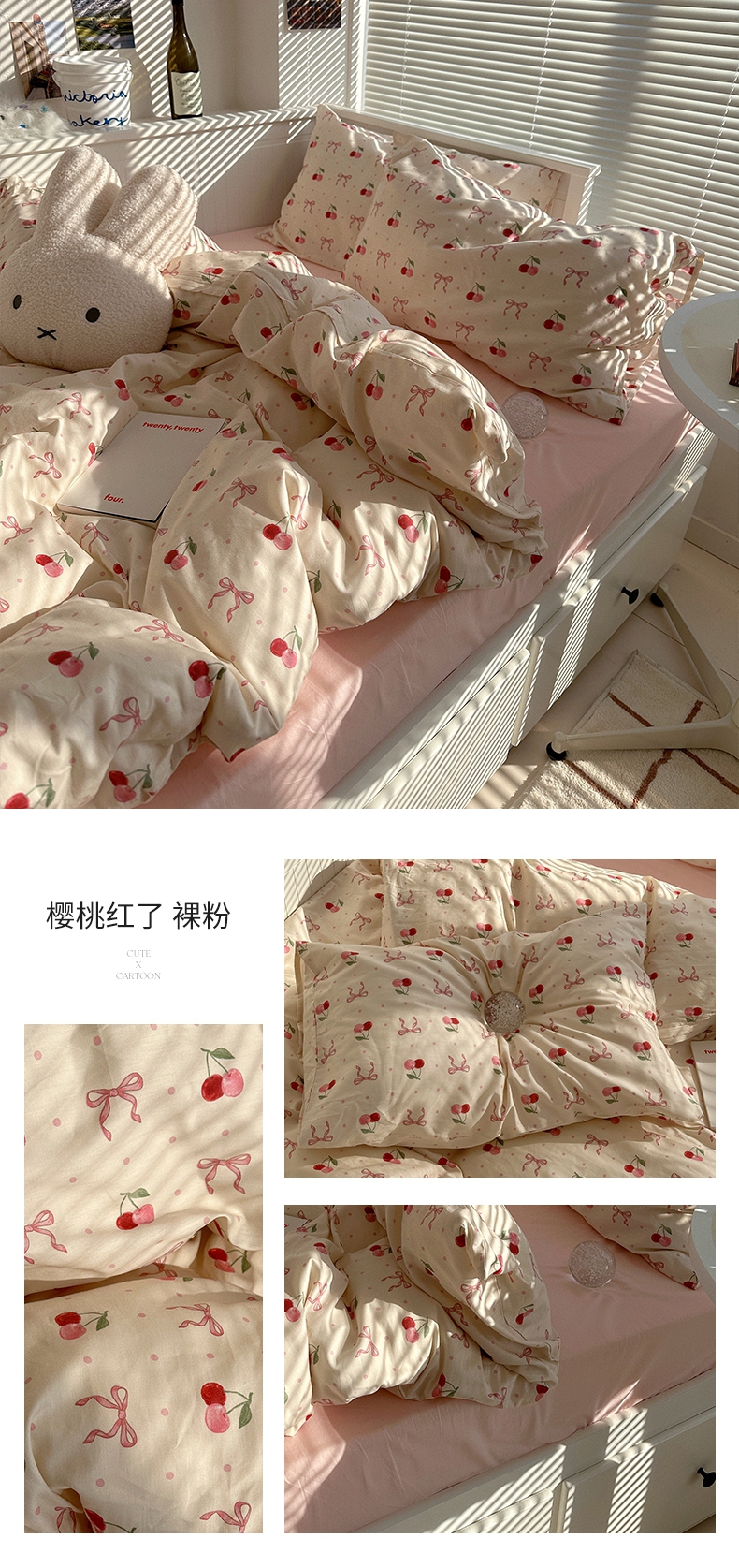 商品名称:尺素 2025年春夏新款全棉卡通四件套纯棉双人被套纯色床单床笠三件套儿童床上用品 樱桃红了 裸粉