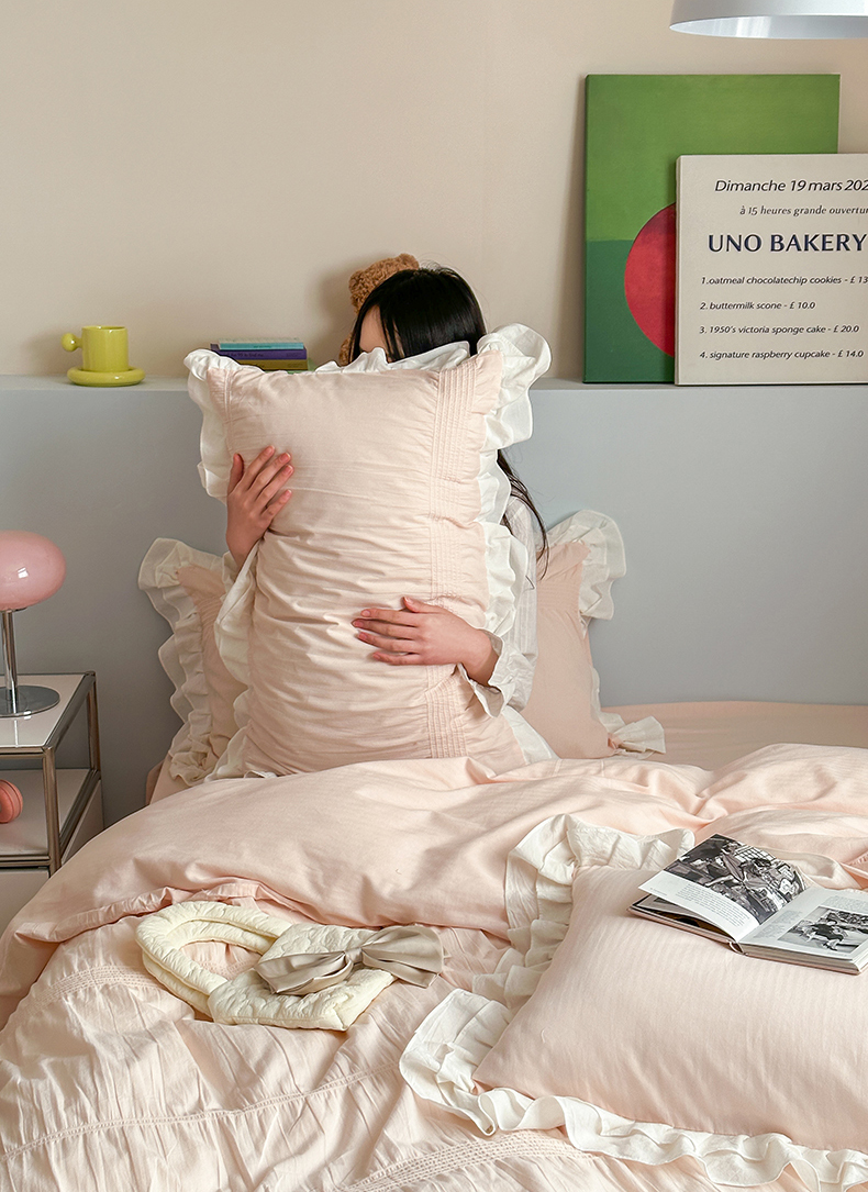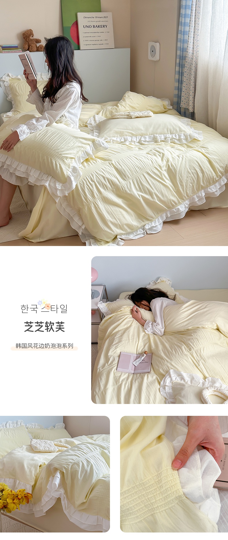 尺素 2024新款韩版ins花边款双人1.8四件套水洗棉泡泡纱被套人字纹床单 奶泡泡-涂涂小桃