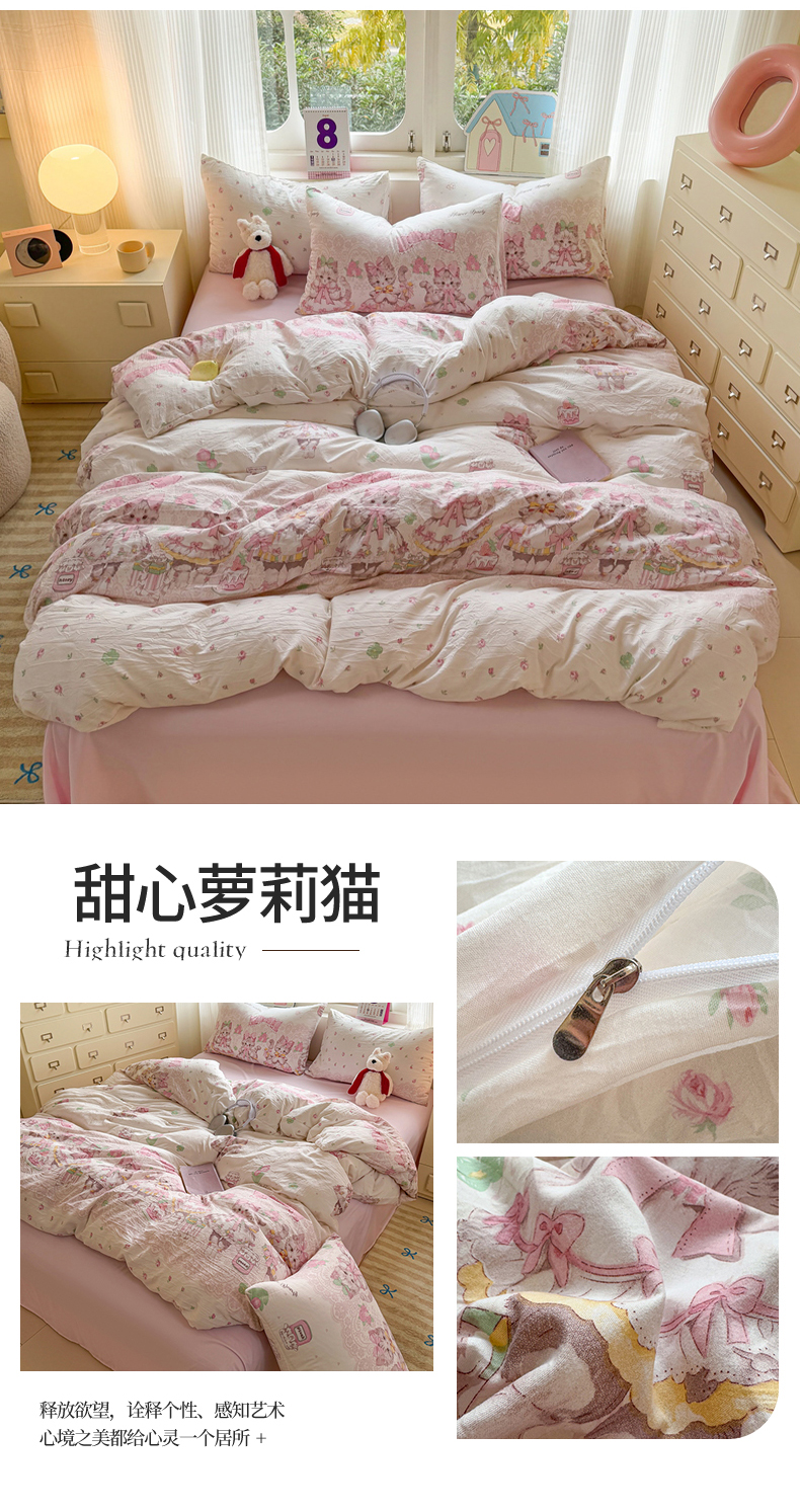 当前位置: 91家纺网 > 商品网购 > 床品套件 > 四件套 > 水洗棉四件套 > 温眠 2025新款亲肤柔软卡通印花水洗棉四件套 甜心萝莉猫