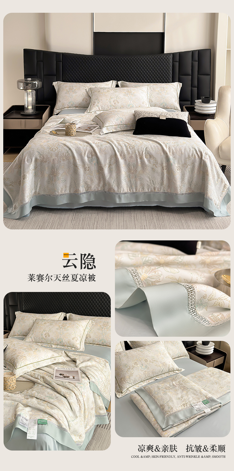 商品名称:娇逸家居 2025新款50支印花莱赛尔天丝夏被镂空款花边夏凉被 云隐