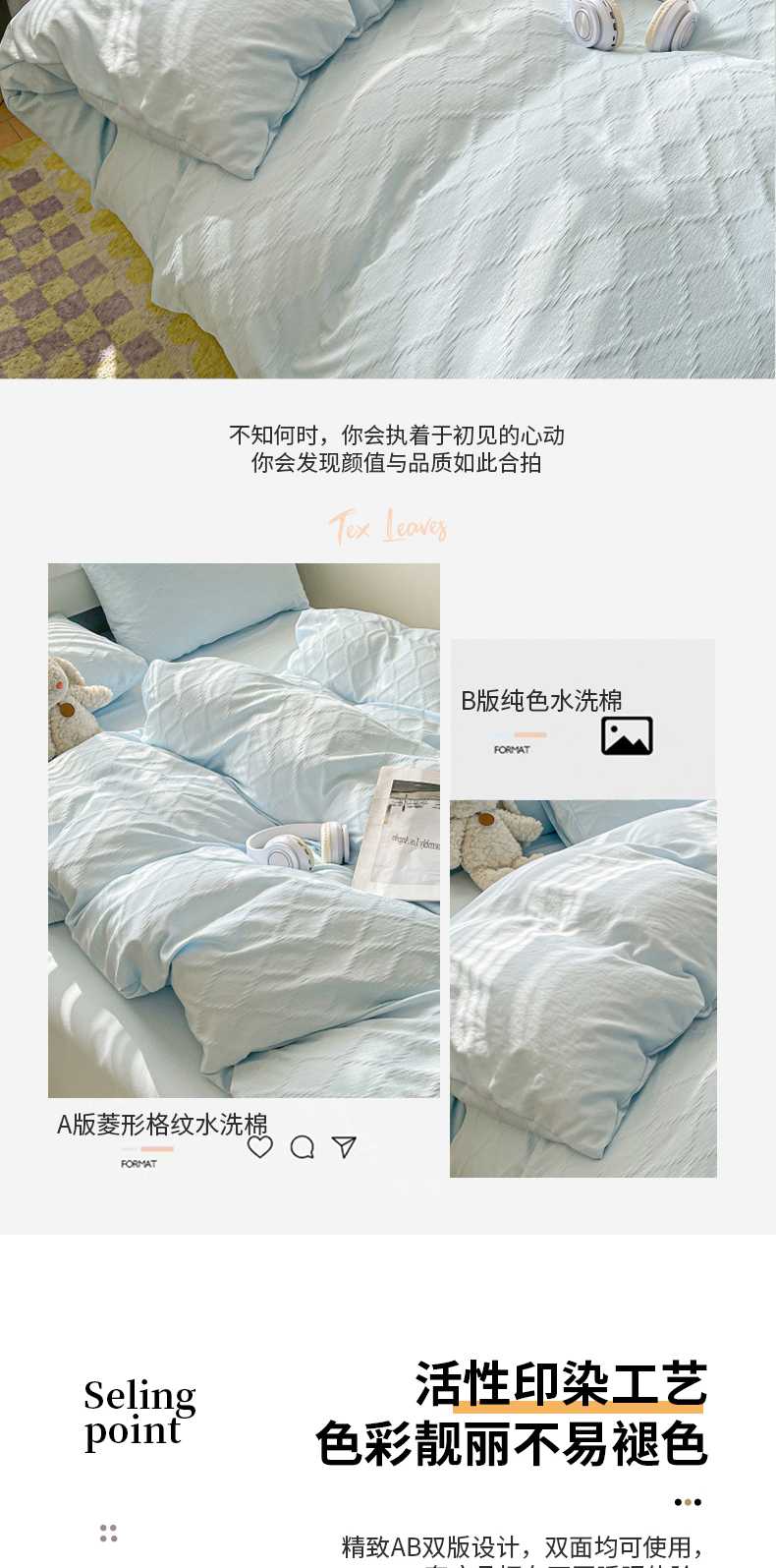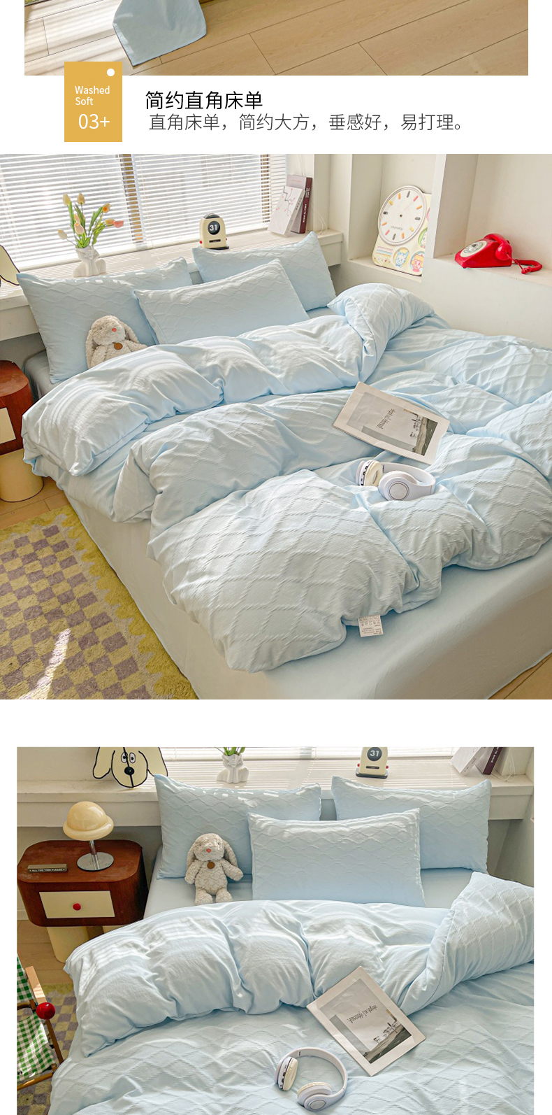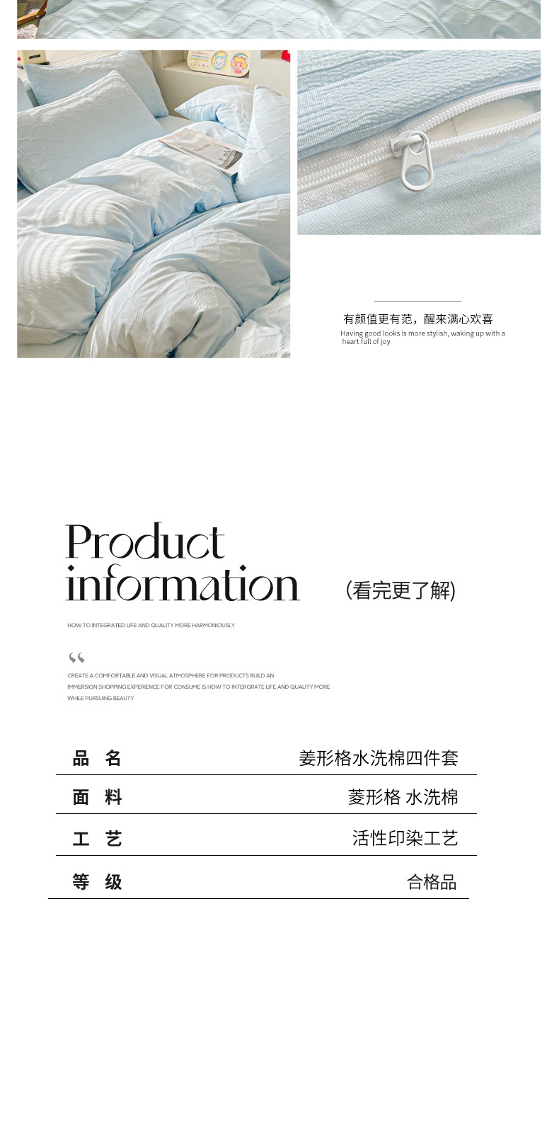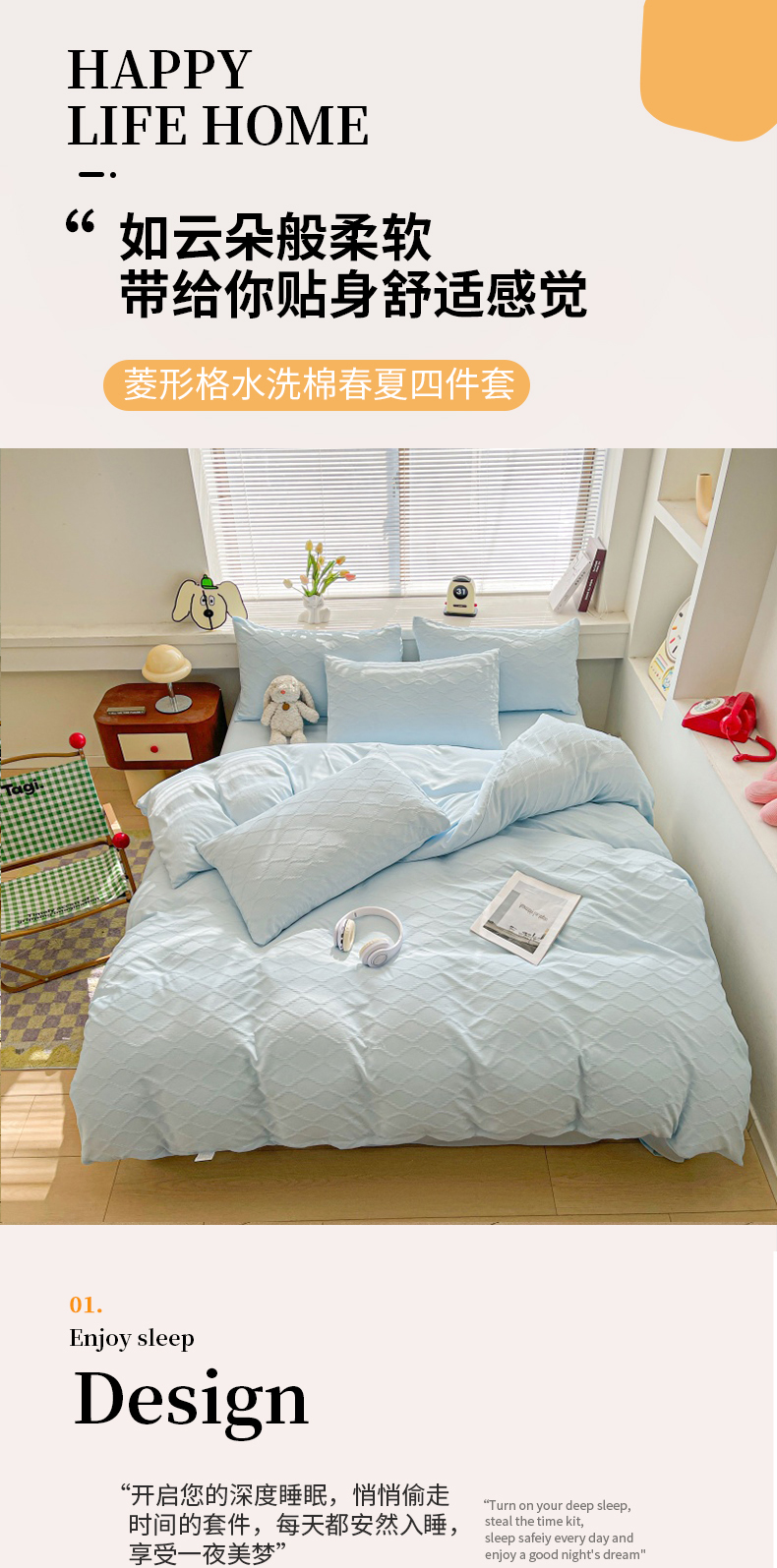 当前位置: 91家纺网 > 商品网购 > 床品套件 > 四件套 > 水洗棉四件套 > 麒东家纺 2025年新款水洗棉春夏菱形格双拼小清新高品质四件套 菱形格-天蓝
