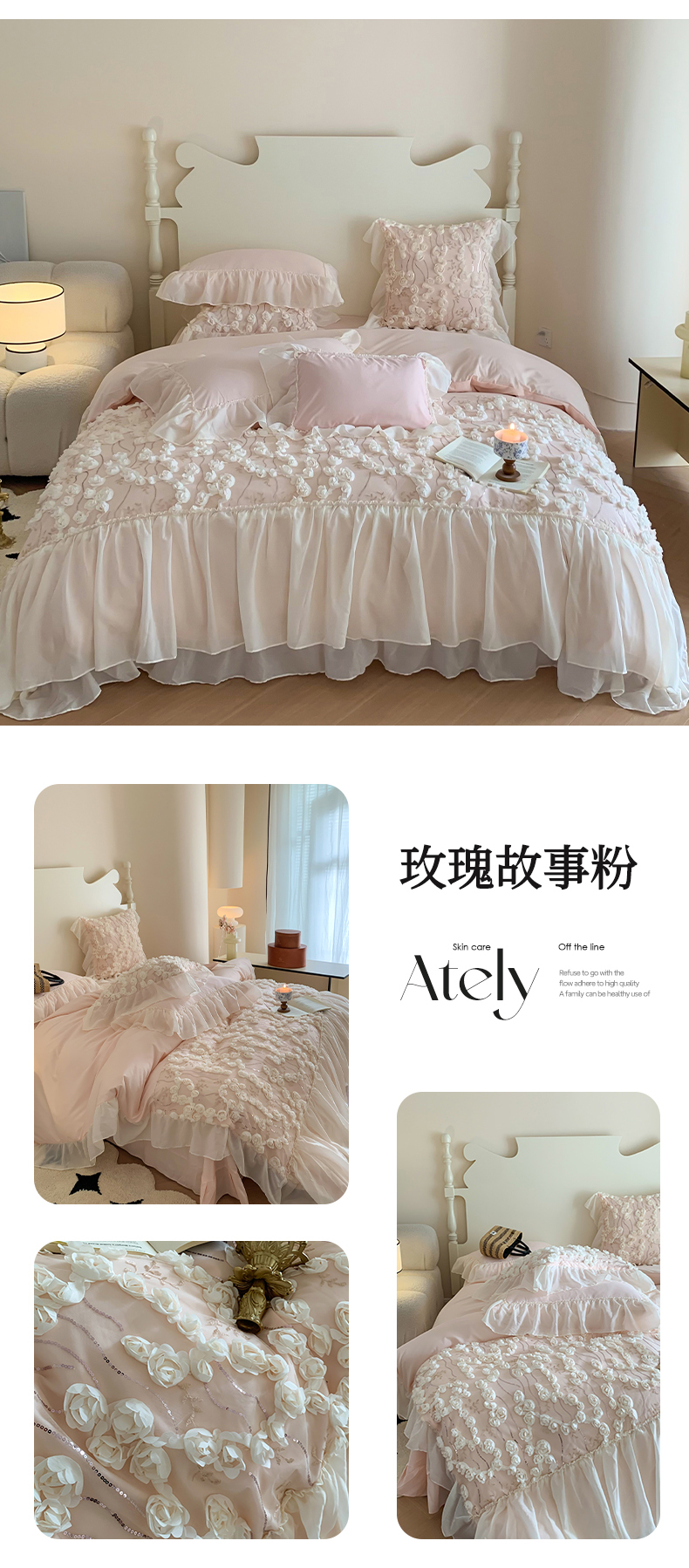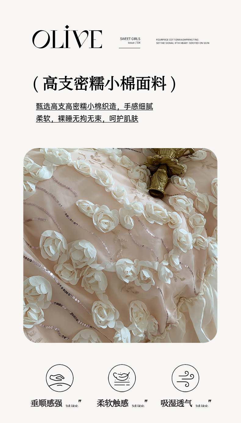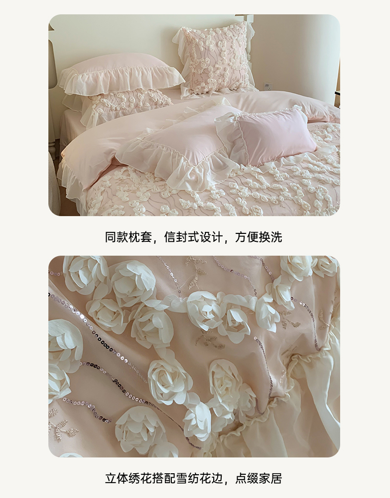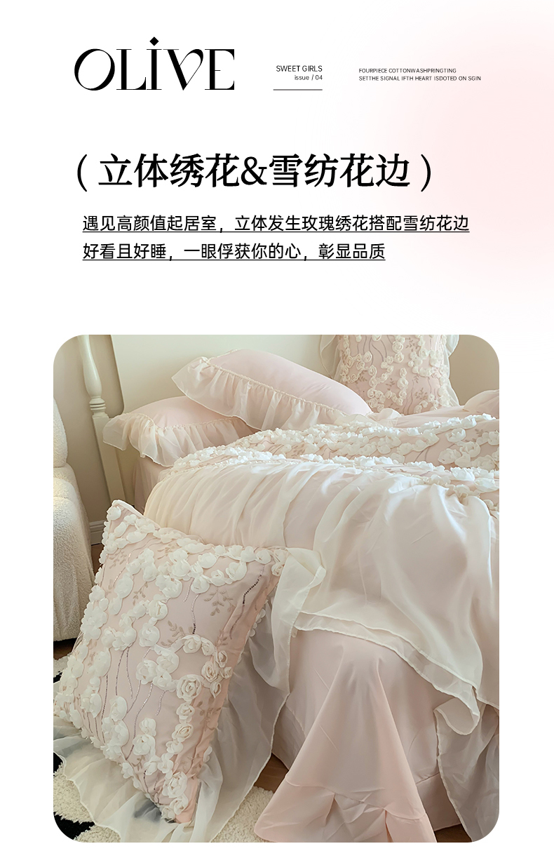 当前位置: 91家纺网 > 商品网购 > 床品套件 > 四件套 > 其它四件套 > 吾欢心2025新款 A类糯小棉立体绣花雪纺花边四件套(玫瑰故事系列) 玫瑰故事粉