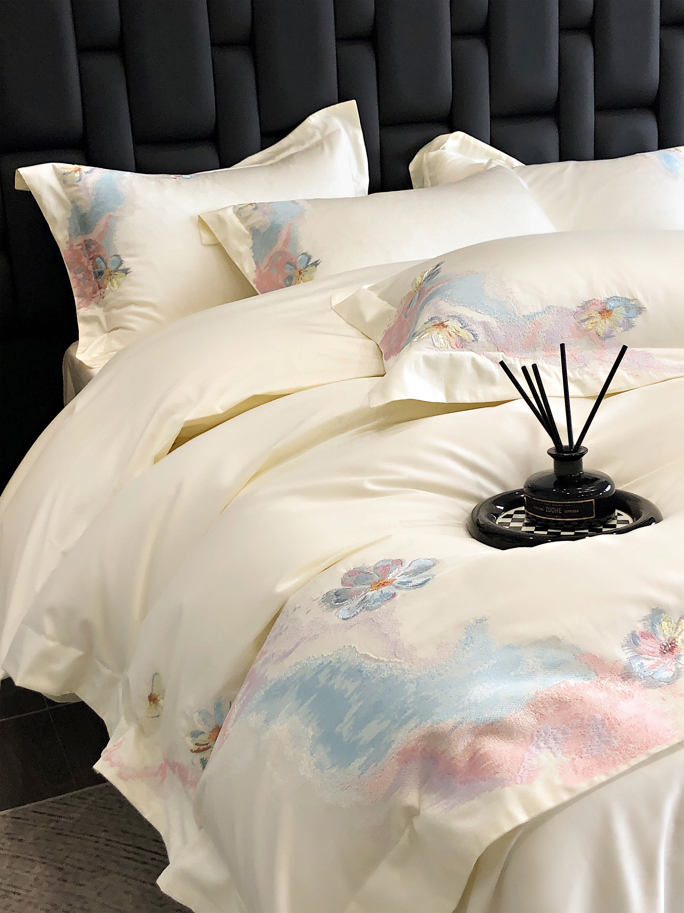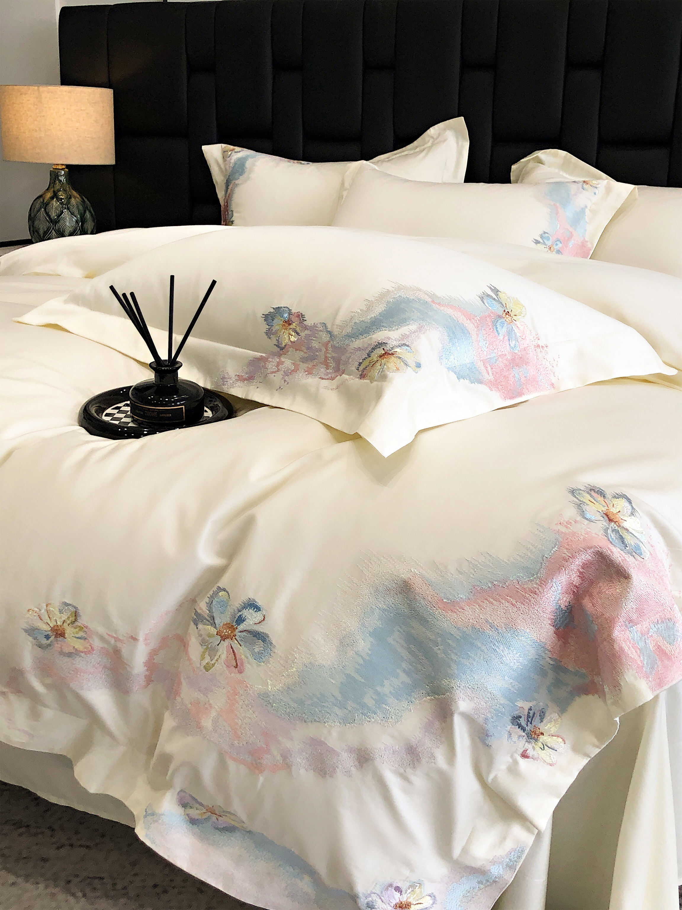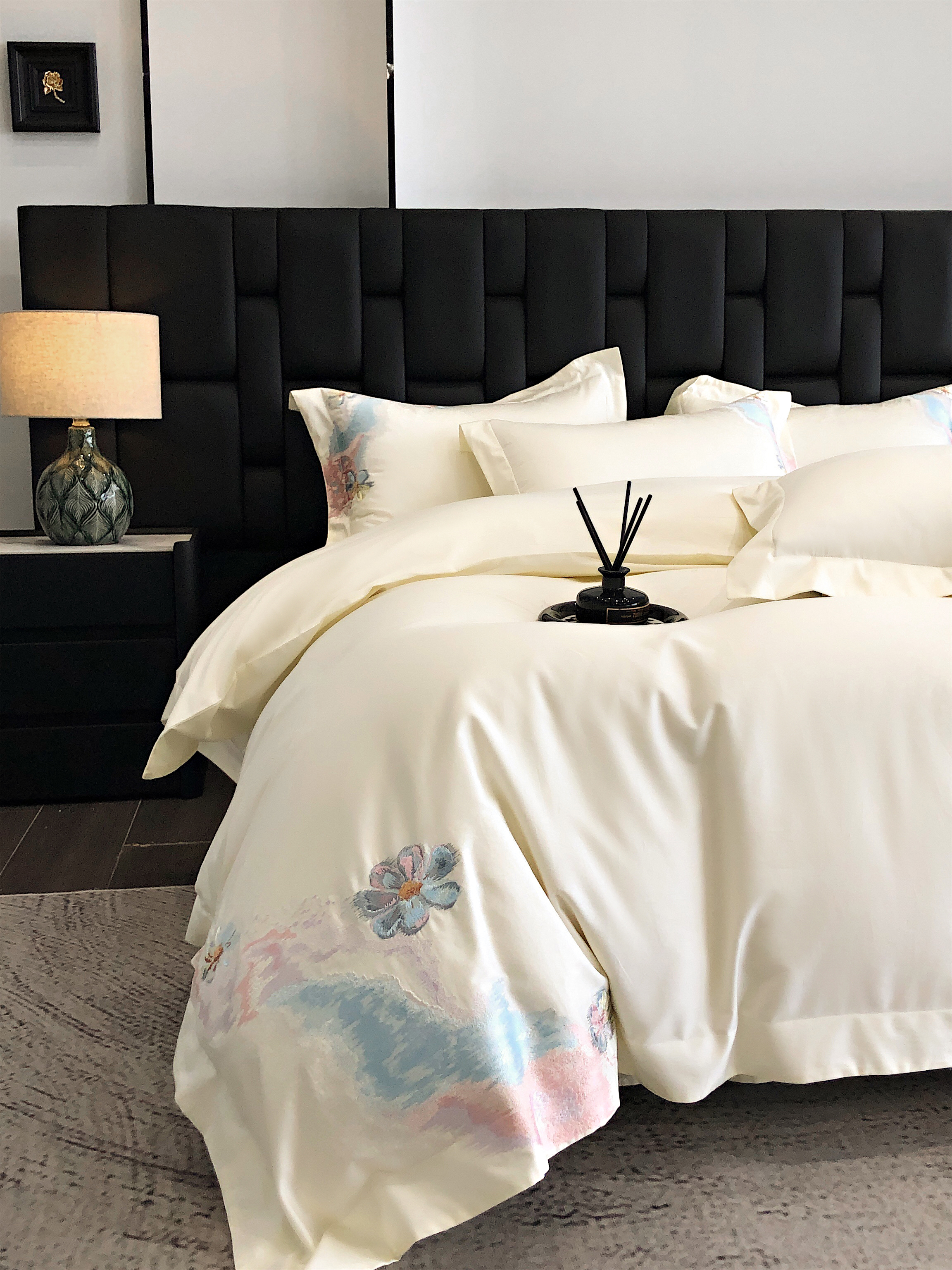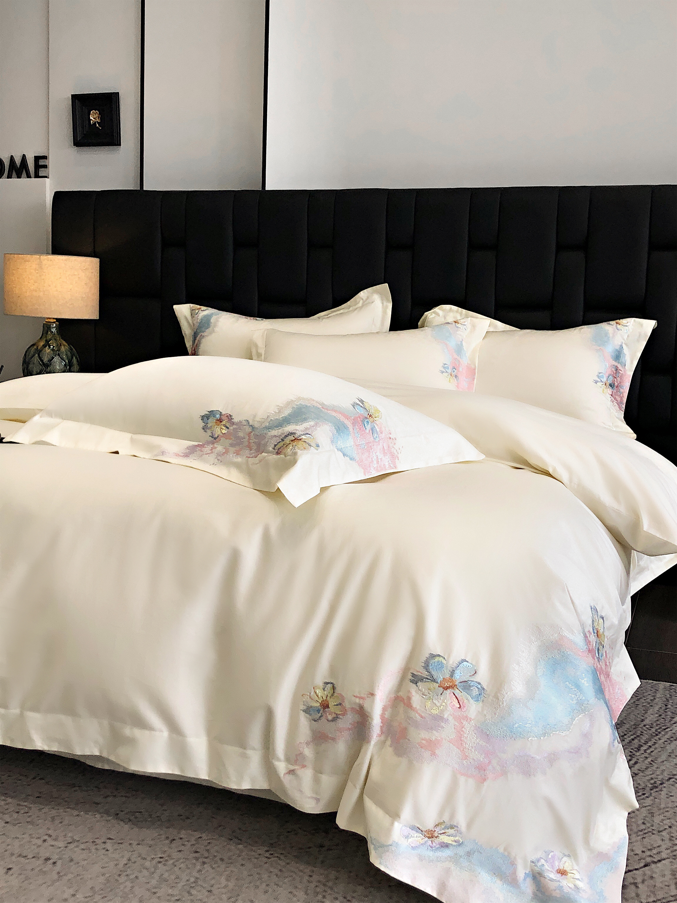 (总)佳汐蓝家纺 2025新款100支贡缎提花全棉刺绣婚庆四件套-繁花佩影,繁花佩影