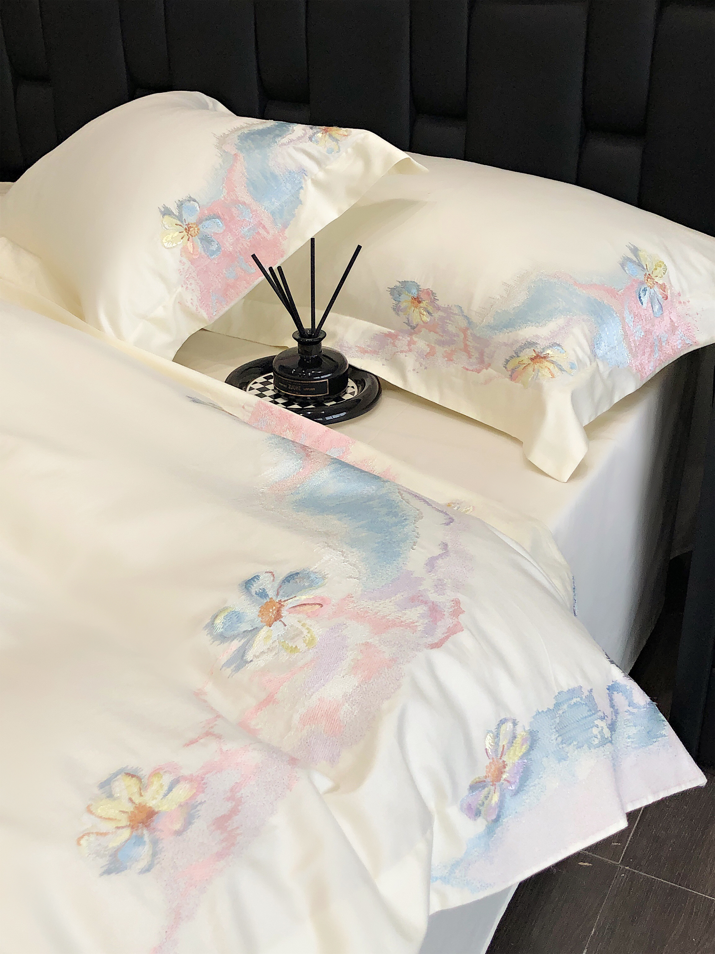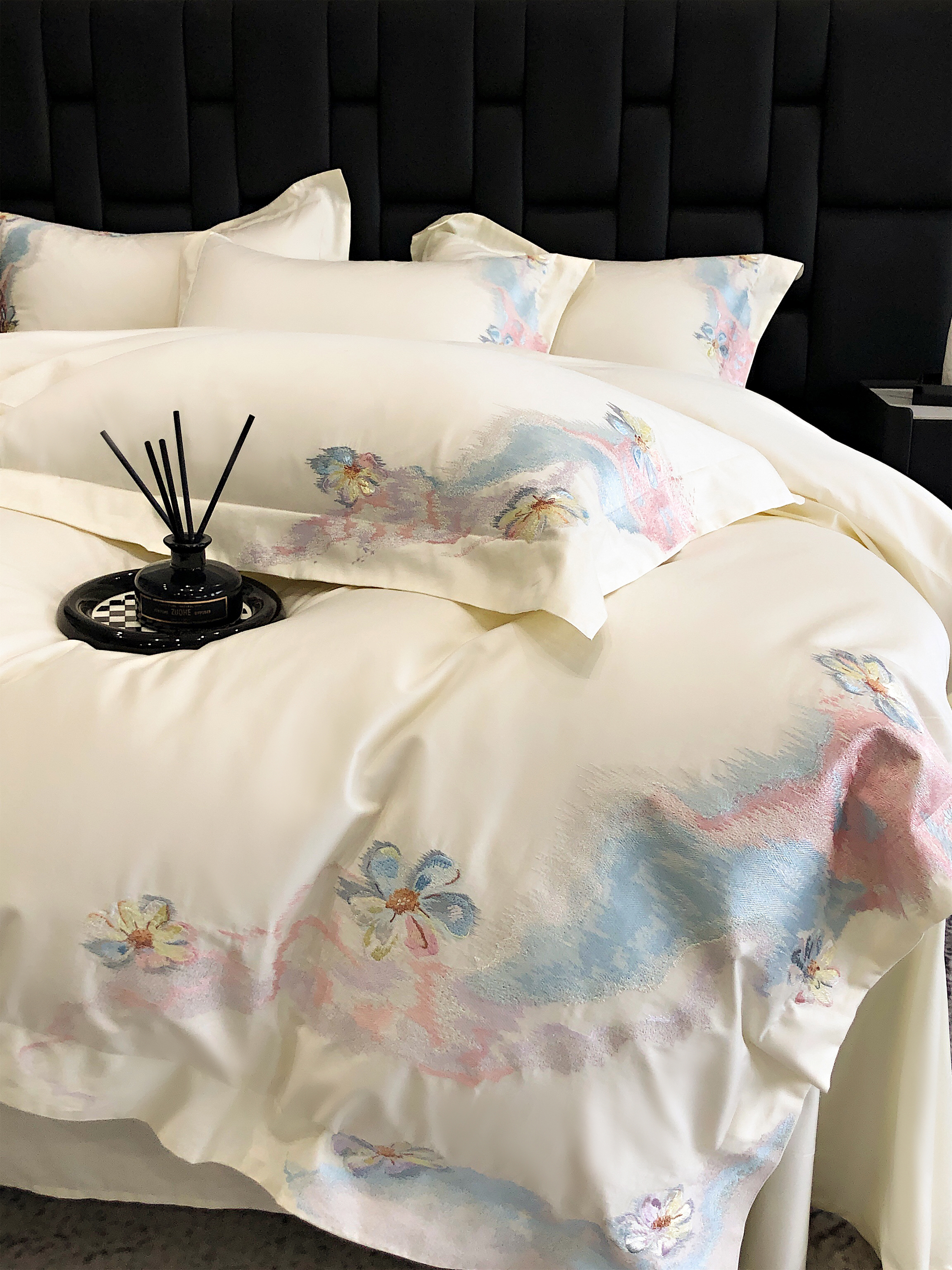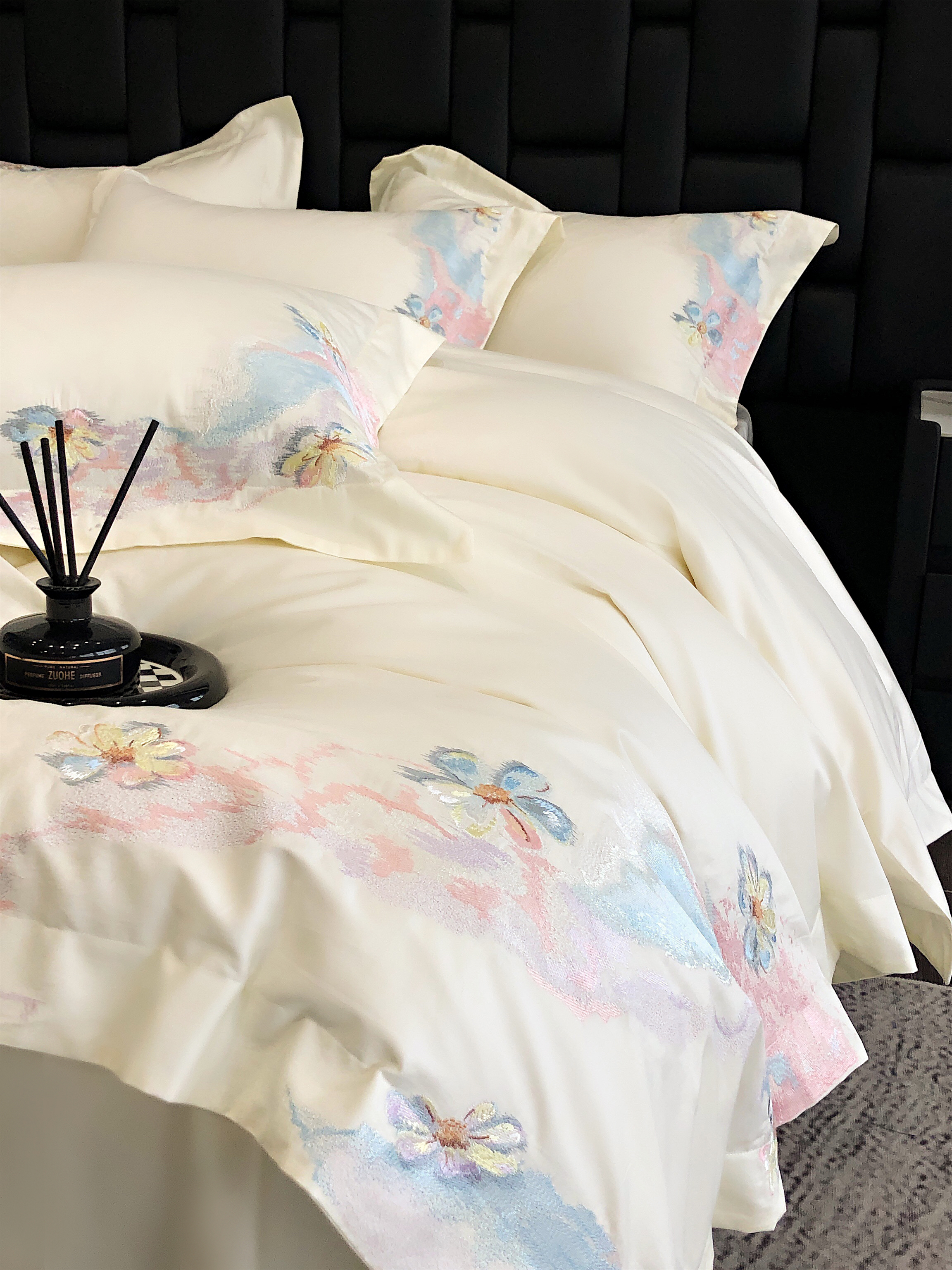 (总)佳汐蓝家纺 2025新款100支贡缎提花全棉刺绣婚庆四件套-繁花佩影,繁花佩影