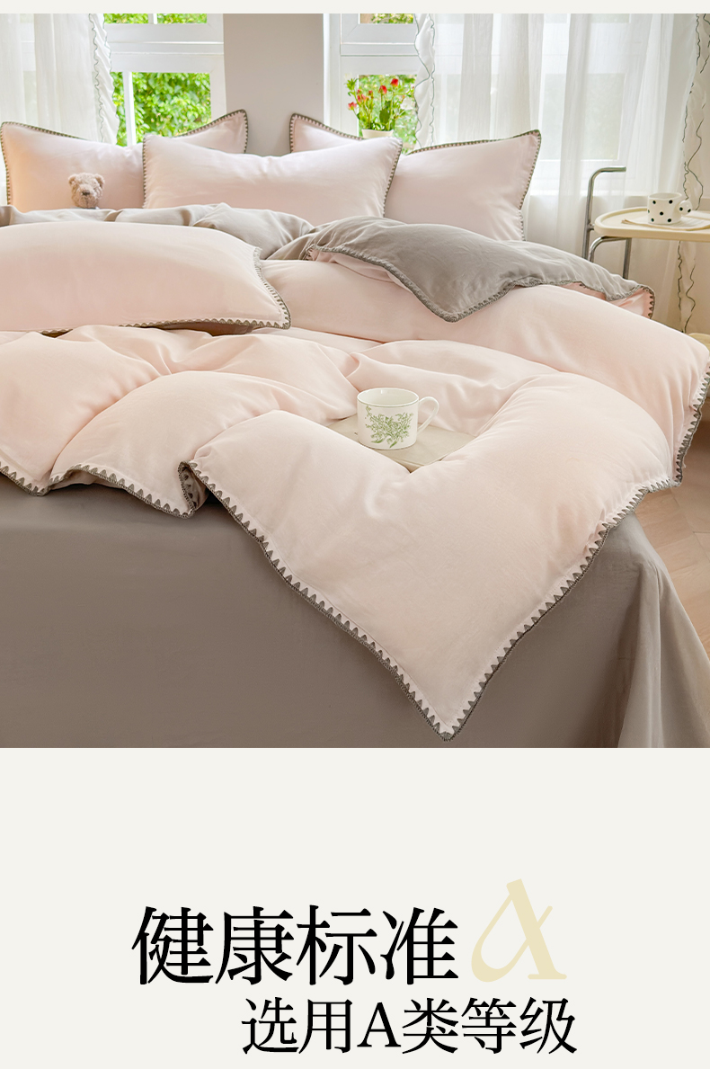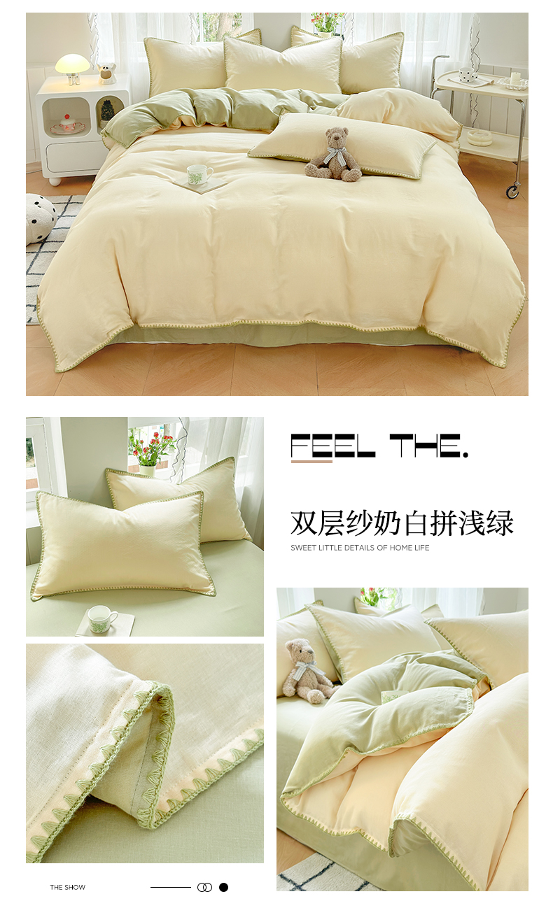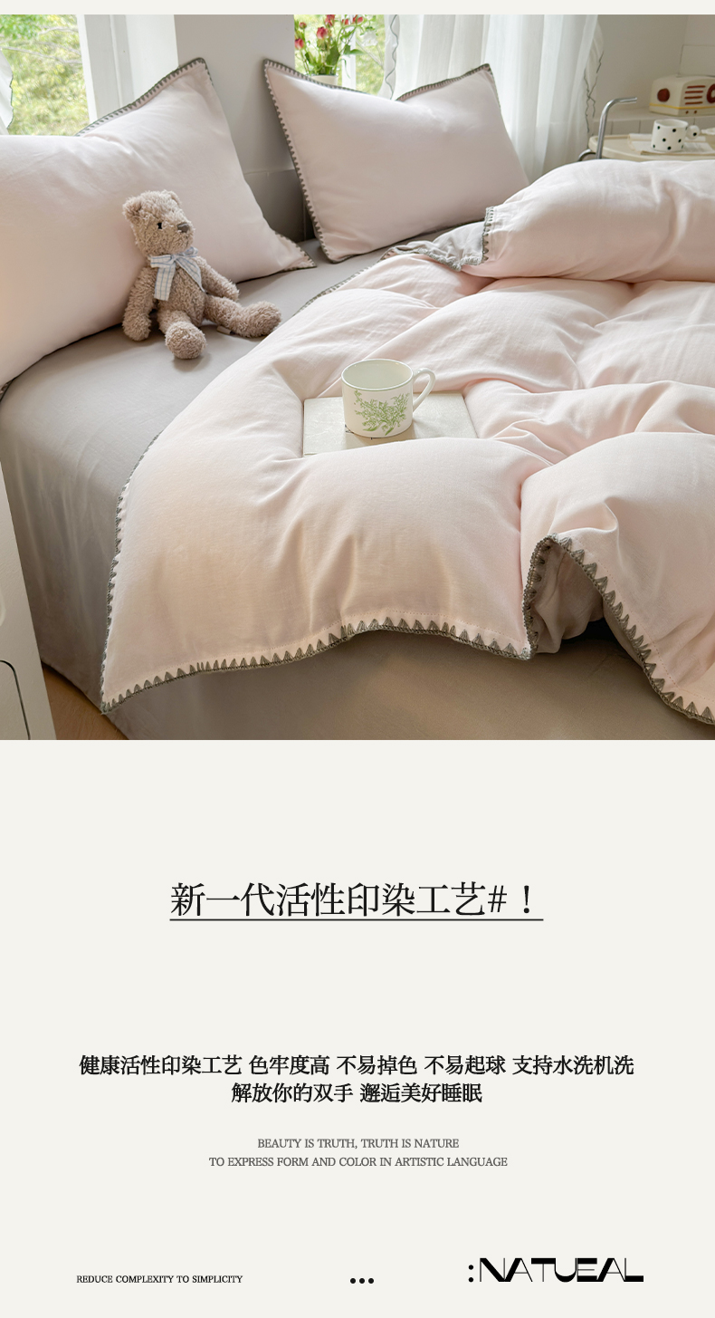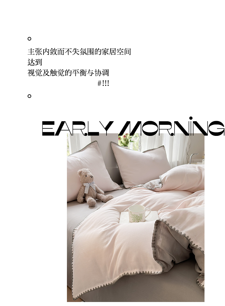 当前位置: 91家纺网 > 商品网购 > 床品套件 > 四件套 > 全棉普通四件套 > 莱登卡奴 2025新款A类全棉双层纱纯色贝壳绣系列四件套 双层纱淡粉拼浅灰
