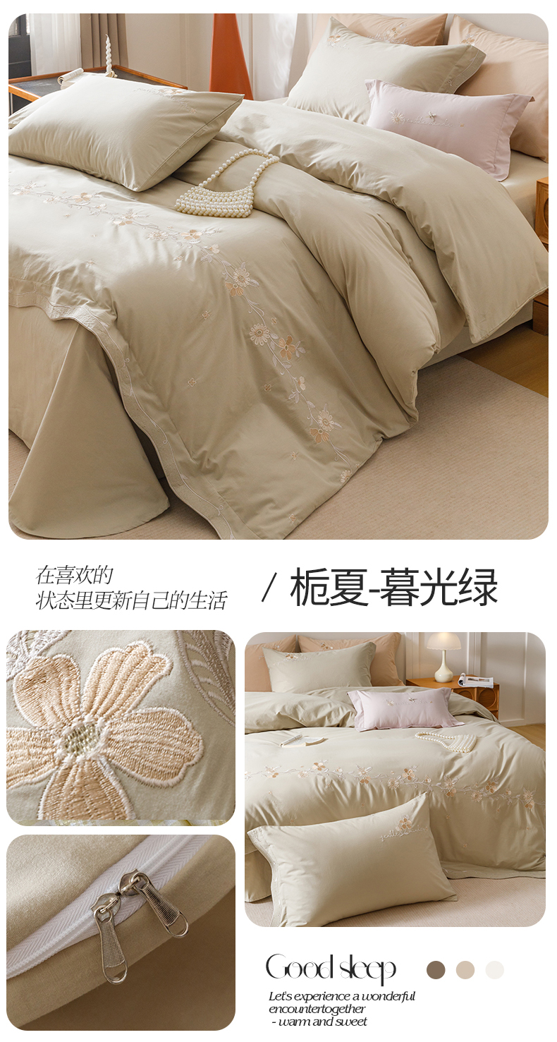 艾莱家纺 2025新款A类水洗棉加厚绣花四件套-栀夏 栀夏-暮光绿