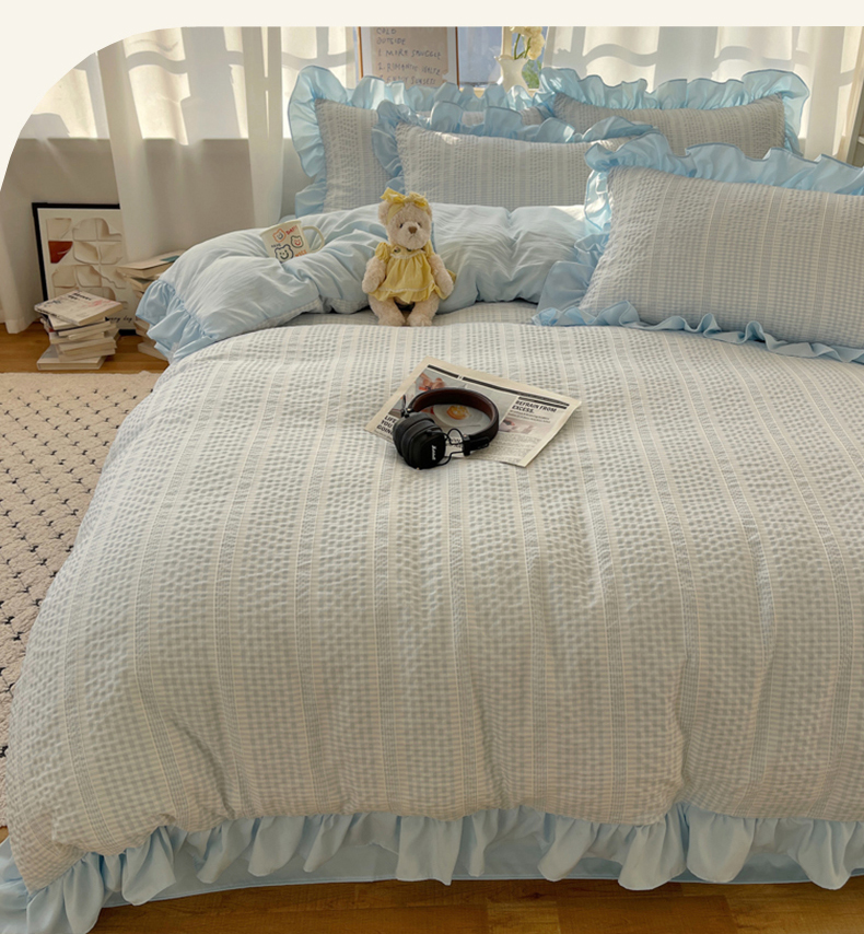 商品名称:十里居 2025新款泡泡纱提花韩版公主格水洗棉花边款四件套 云朵蓝