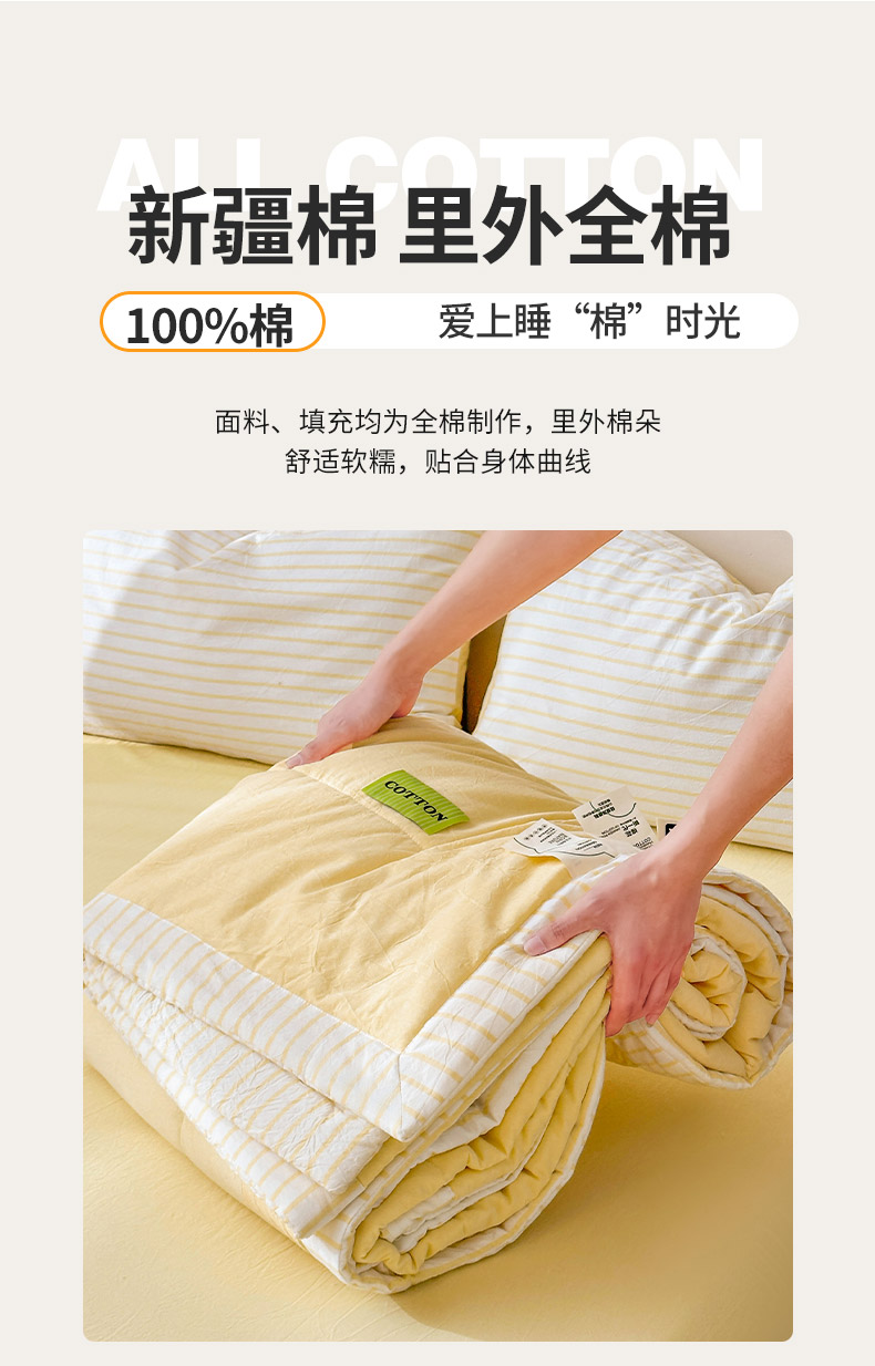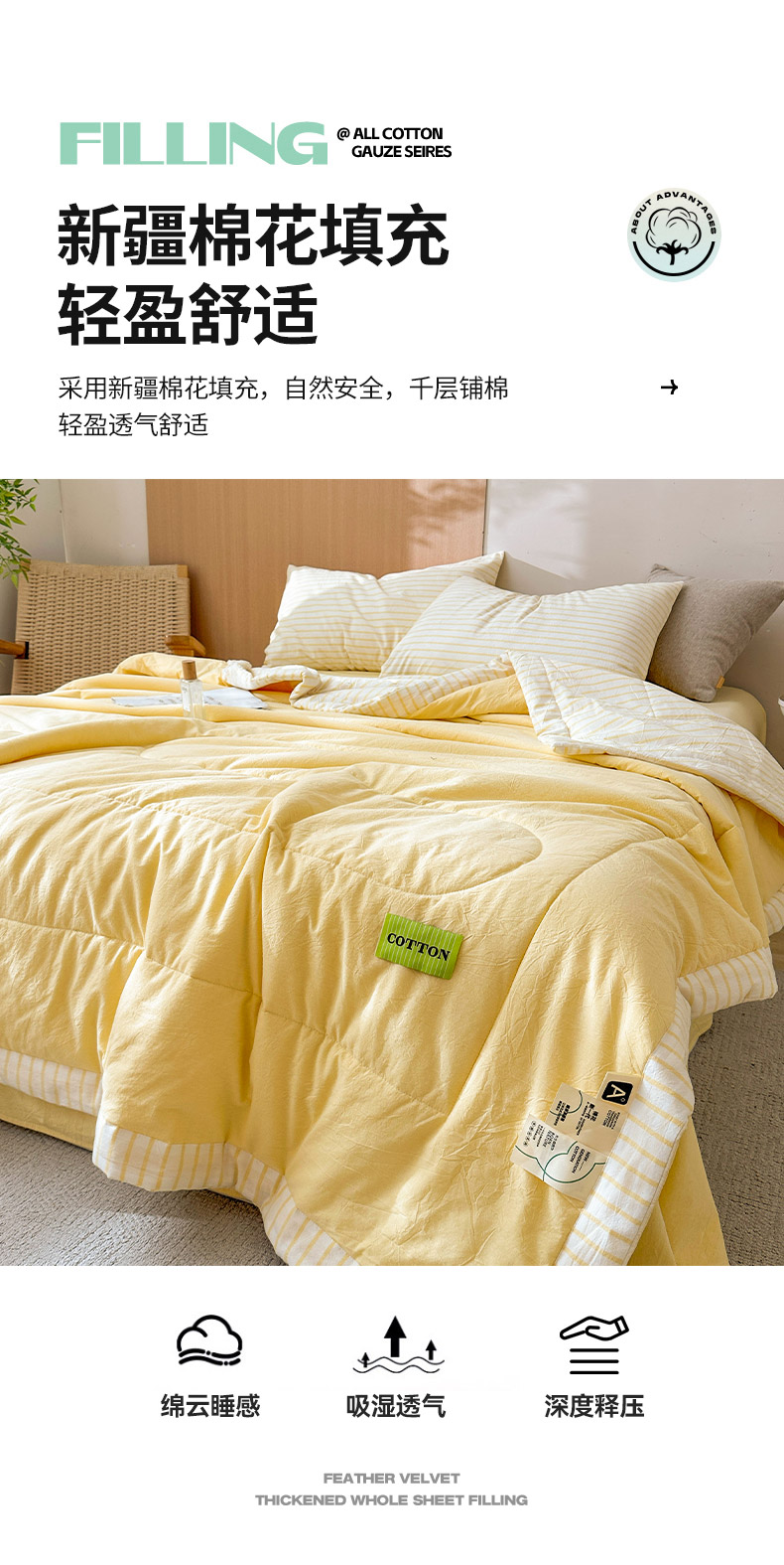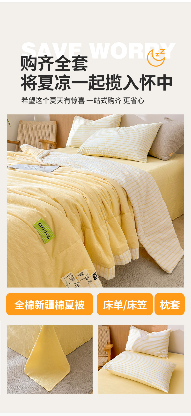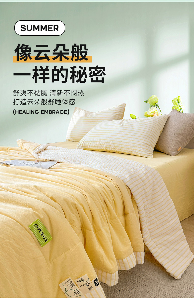 当前位置: 91家纺网 > 商品网购 > 被子 > 夏被 > 熙宴家纺 2025新款全棉色织水洗棉棉花夏被四件套 淡黄条