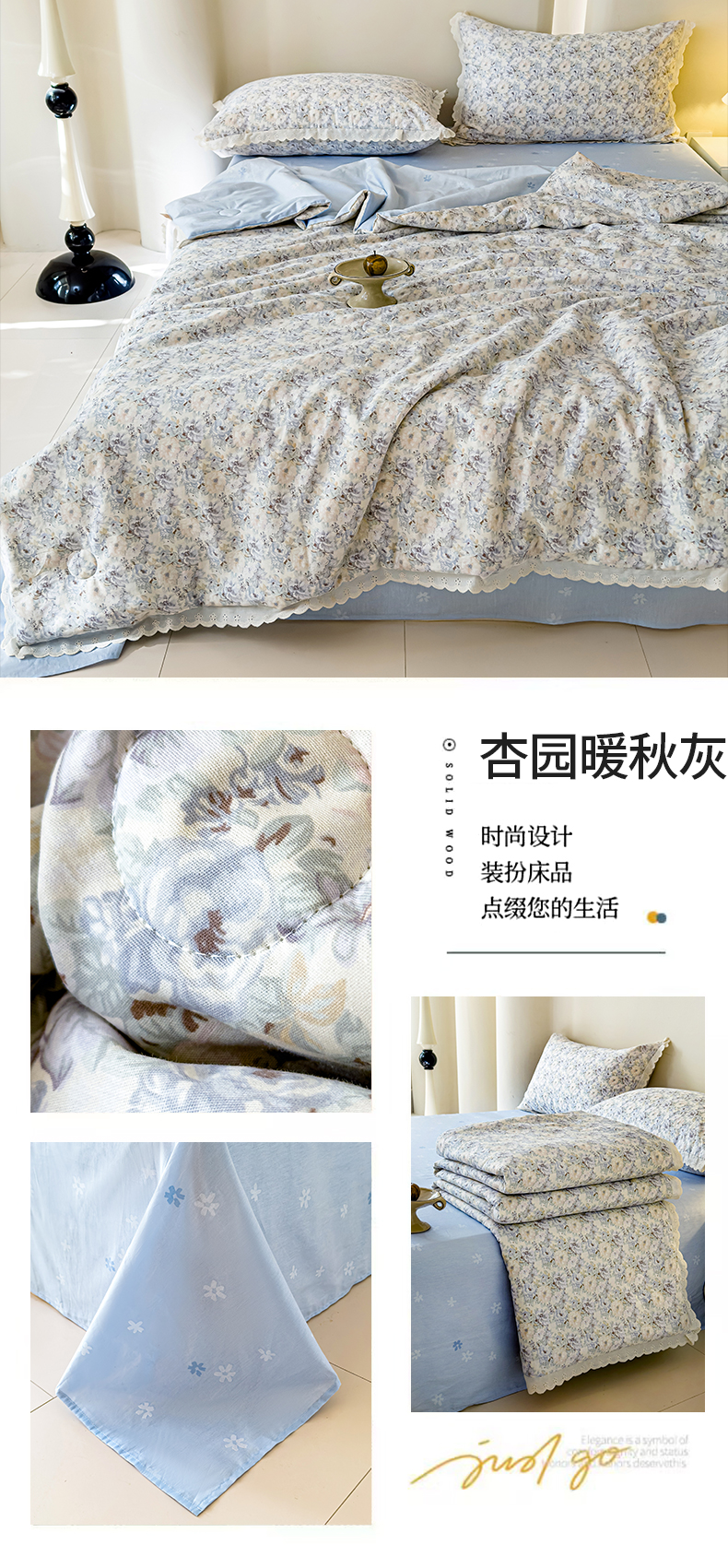 商品名称:2025新款全棉花边大豆夏被四件套 杏园暖秋-灰