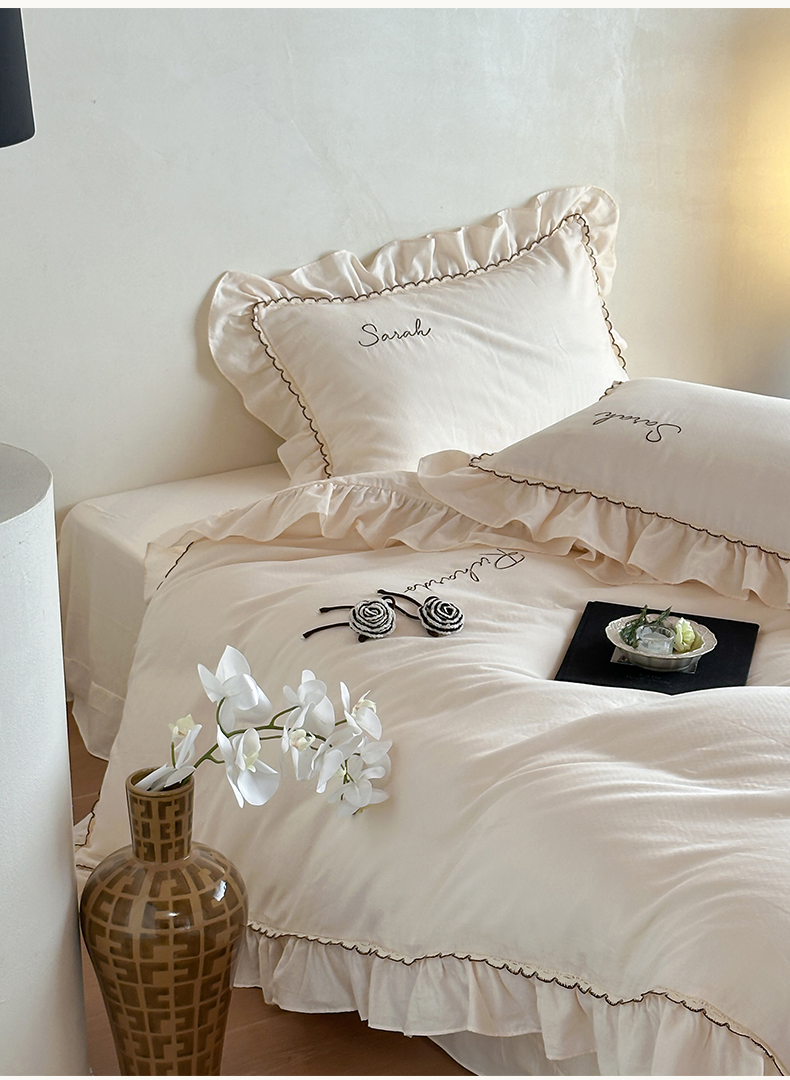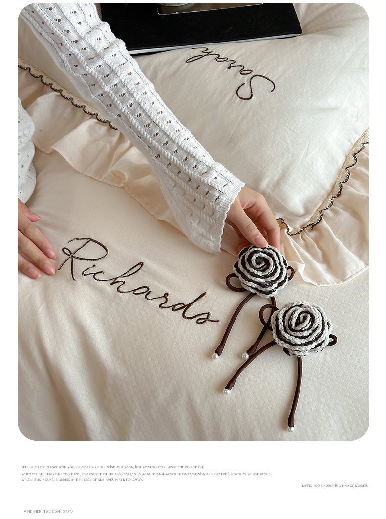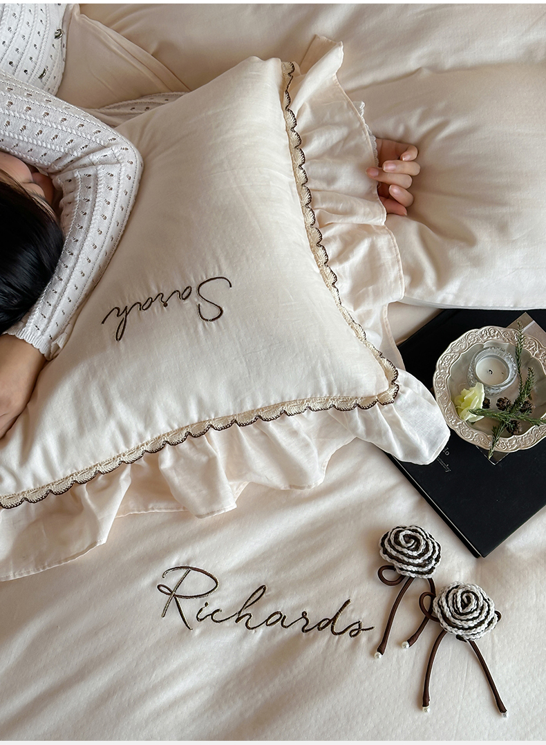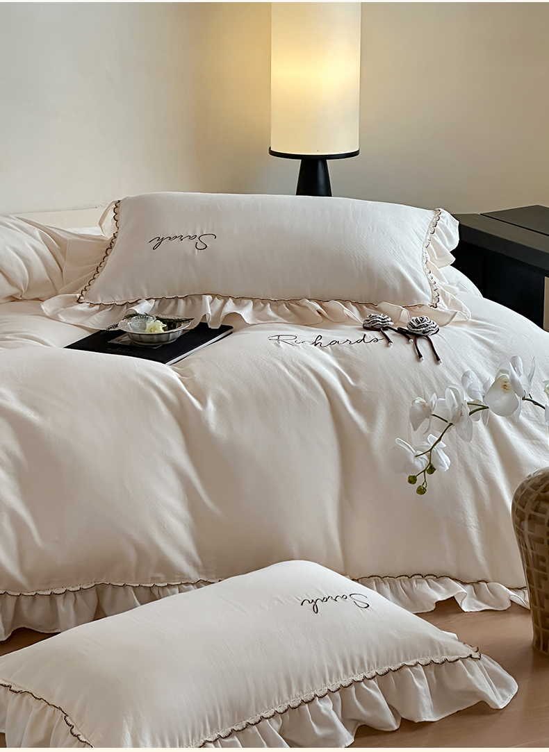 名品优仓 2025新款纯棉水洗棉双层纱提花手工花韩版花边四件套 思颖-奶昔白