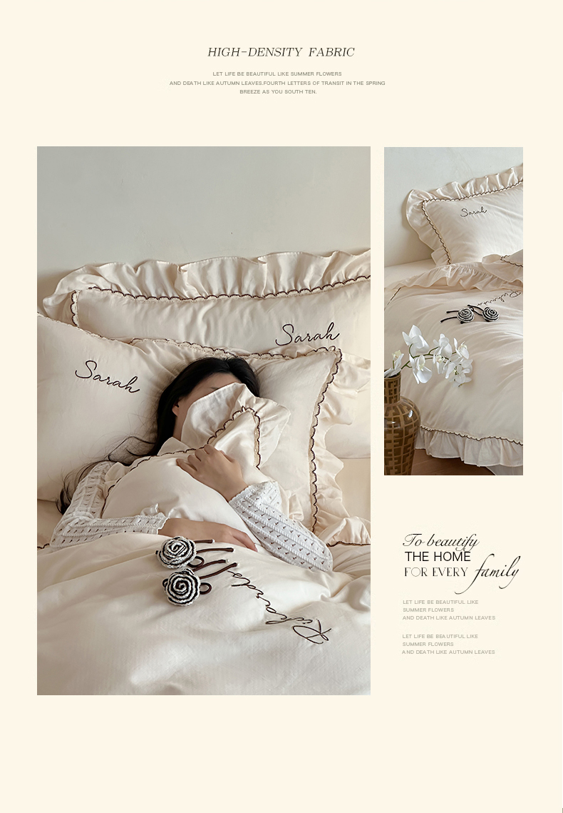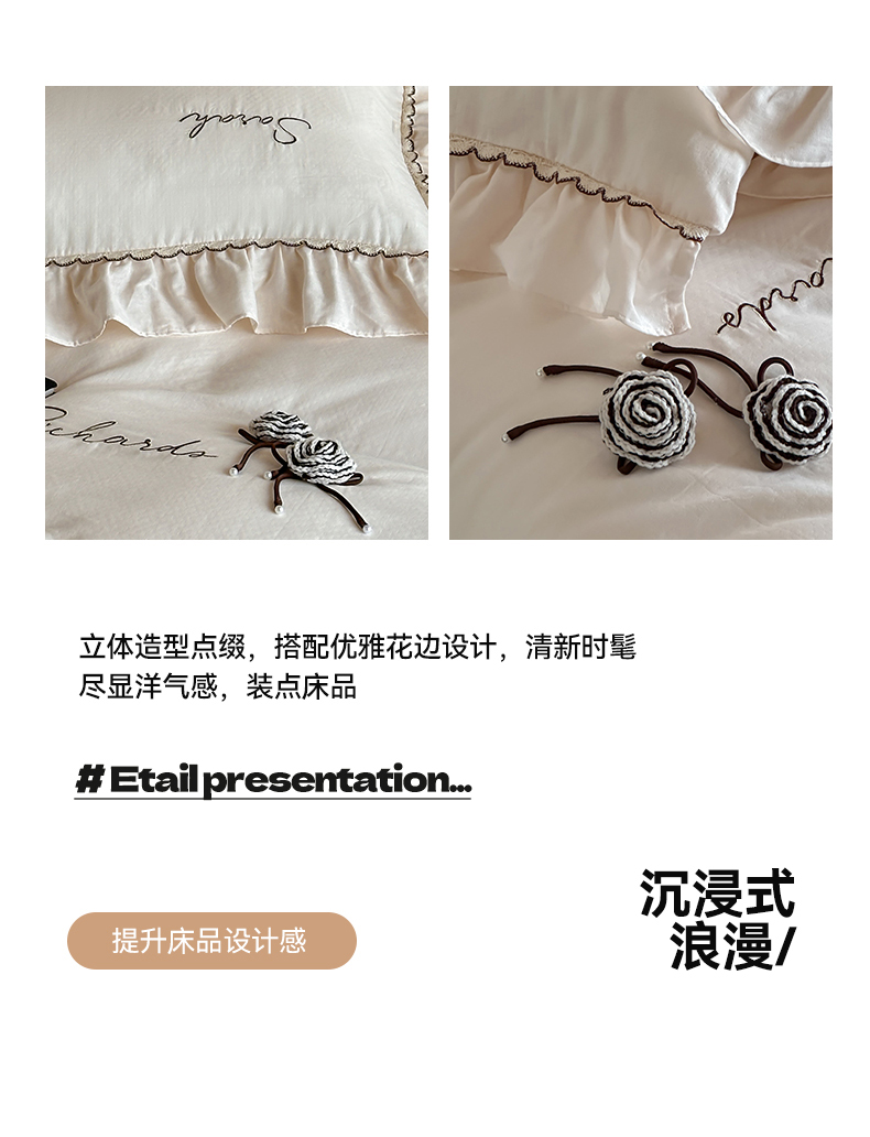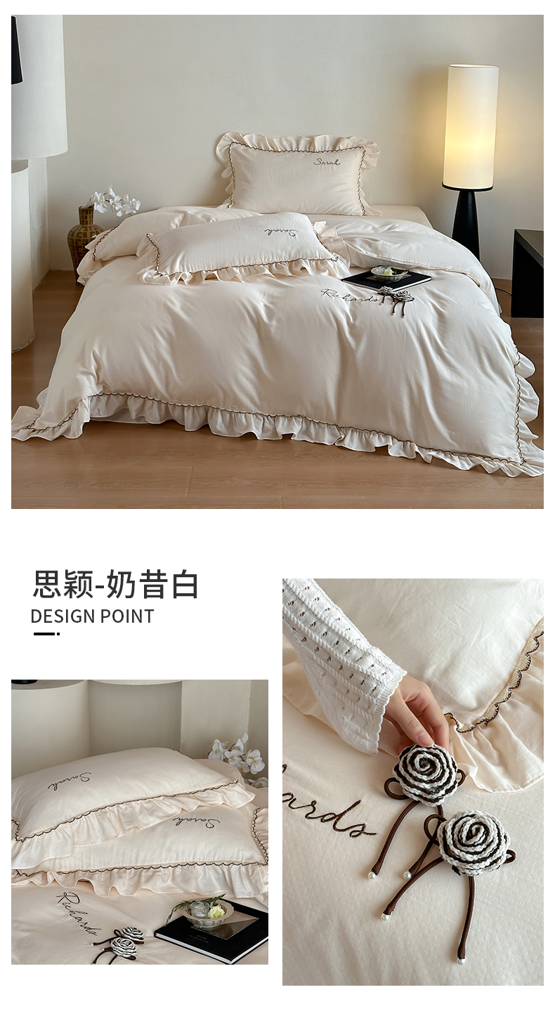 商品名称:名品优仓 2025新款纯棉水洗棉双层纱提花手工花韩版花边四件套 思颖-奶昔白