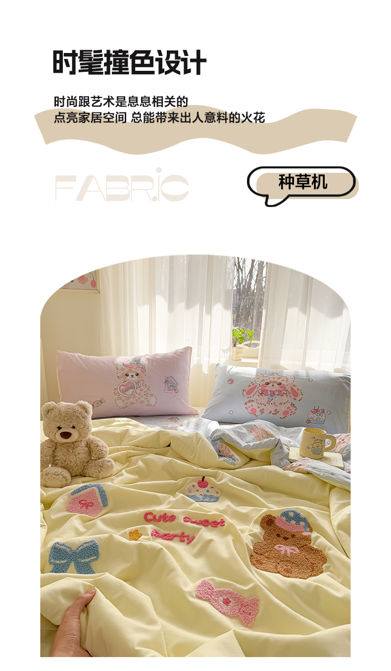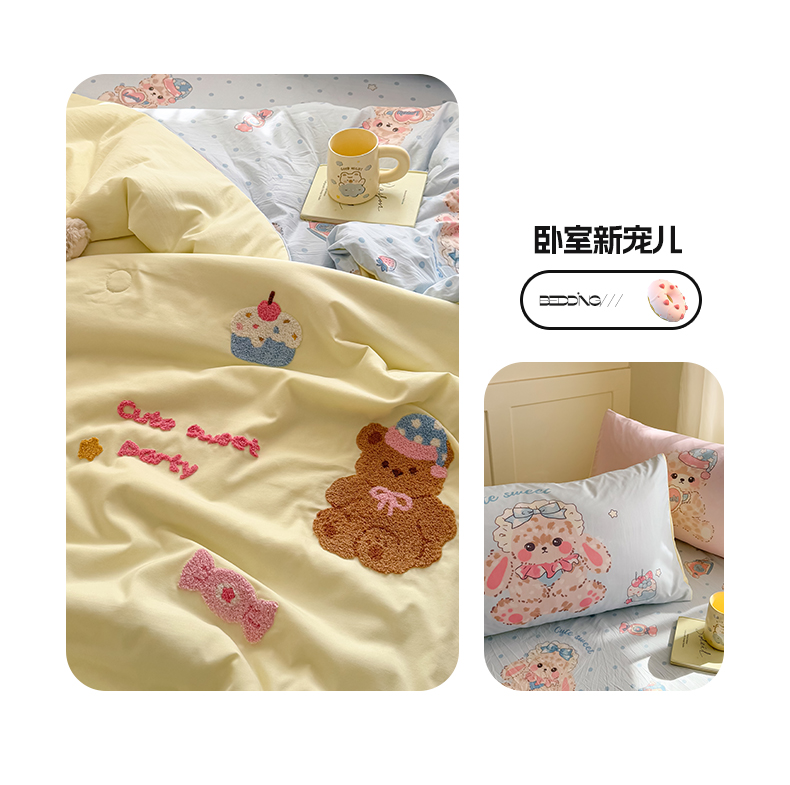 (总)贝扬思家纺 2025新款萌萌哒卡通毛巾绣四件套,冰激凌LABUBU,法棍面包小熊,花集小兔,巧克力蛋糕熊,三只小腊肠,甜奶酱小猫,晚安月亮小狗,小狗吃蛋糕,小狗仔party