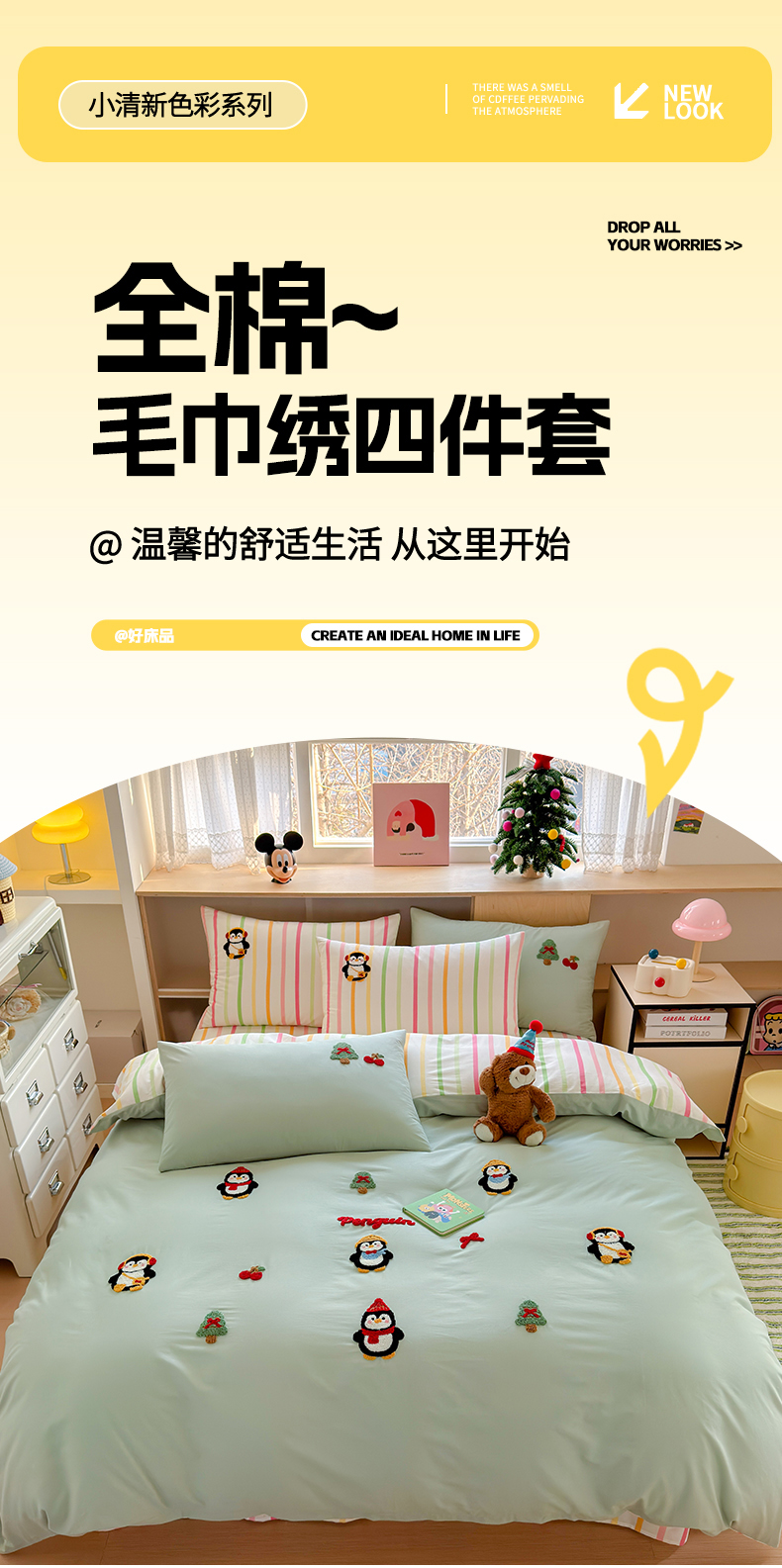 当前位置: 91家纺网 > 商品网购 > 床品套件 > 四件套 > 毛巾绣四件套 > 如意朵2025新款全棉毛巾绣四件套 小企鹅