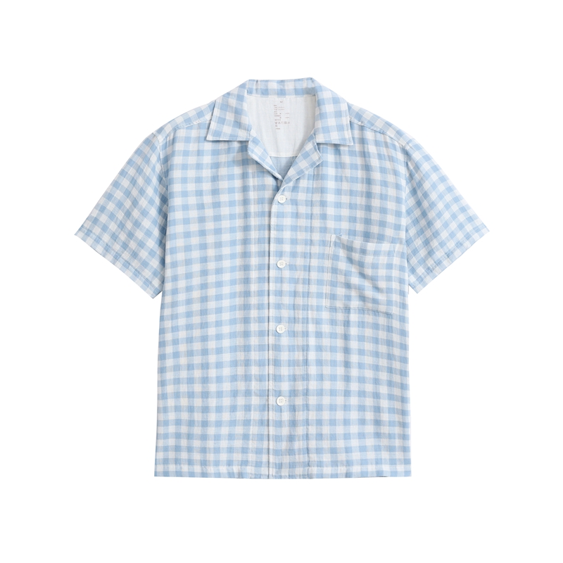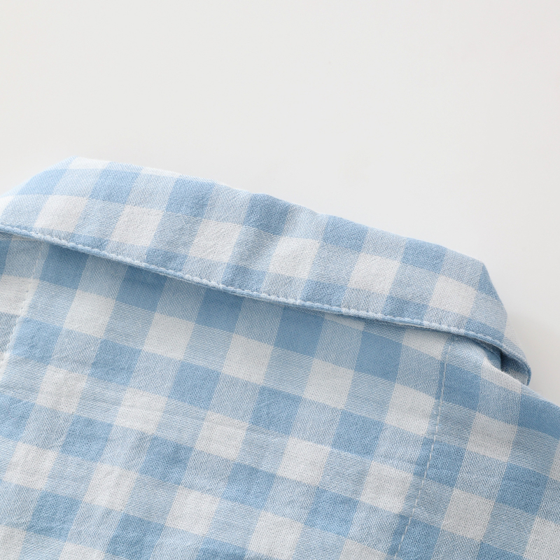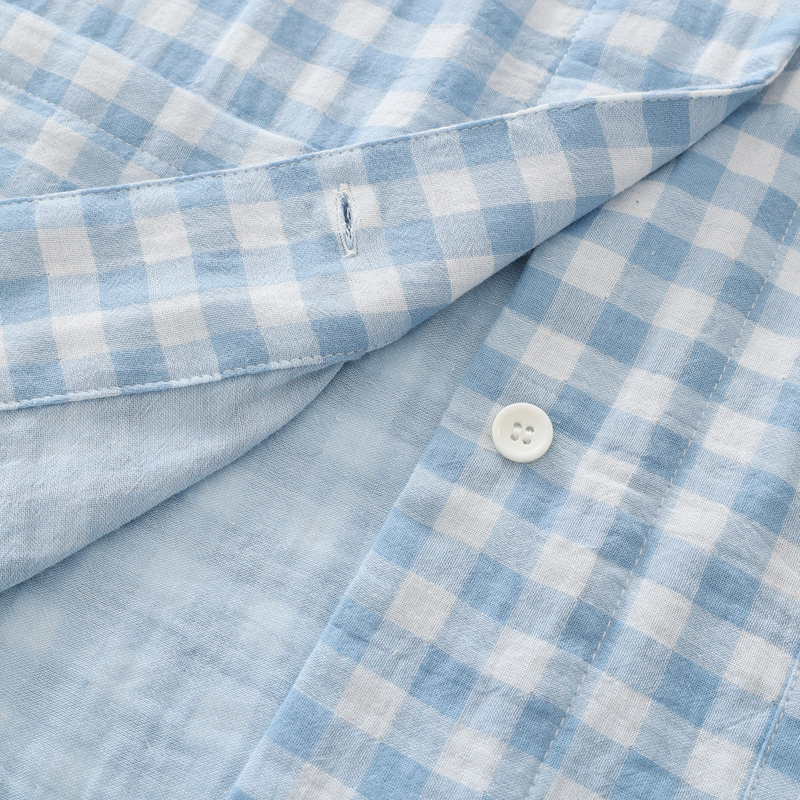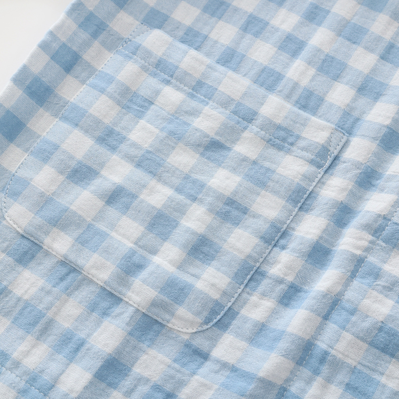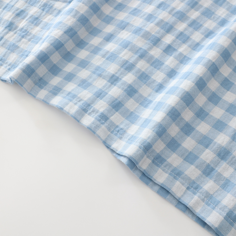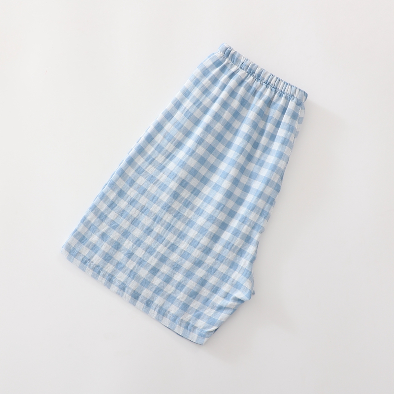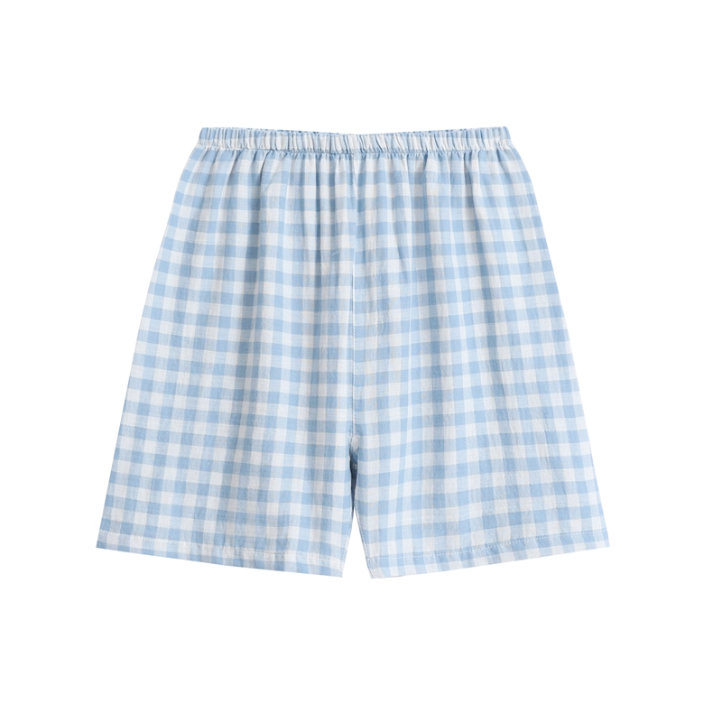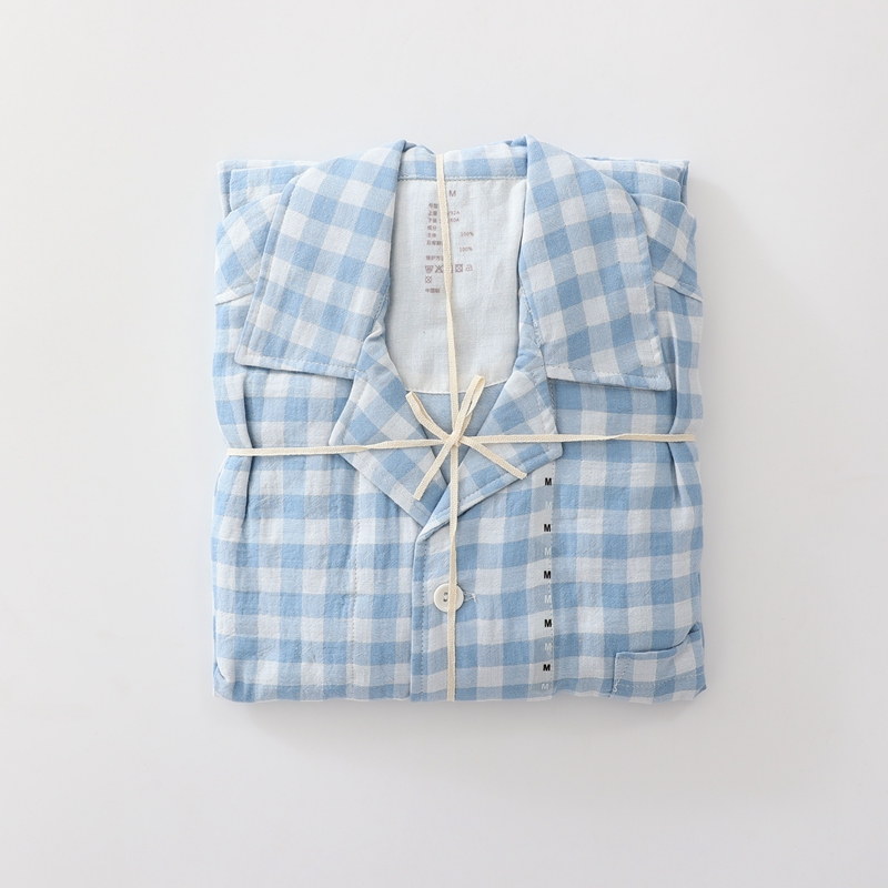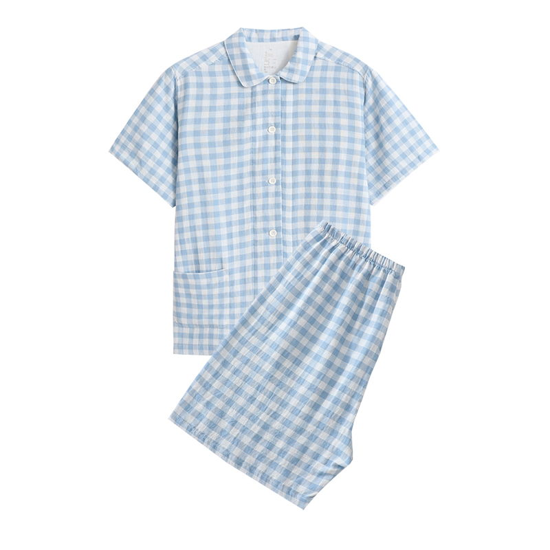 商品名称:伊嫚家居 2025新款日式无印风良品全棉双层纱睡衣女纯棉短袖短裤睡衣夏季纯棉短袖家居服 浅蓝小格女