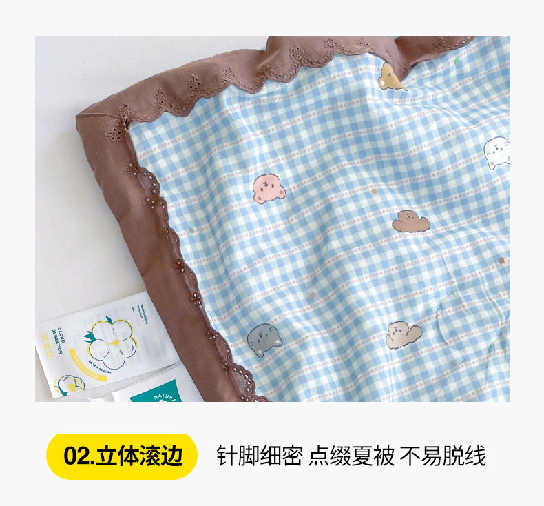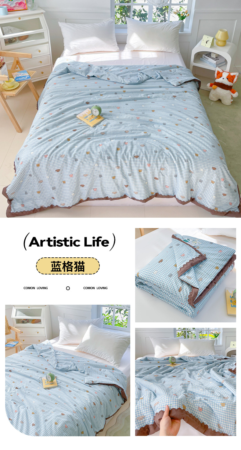 商品名称:2025新款全棉60支单层纱花边夏被 蓝格猫